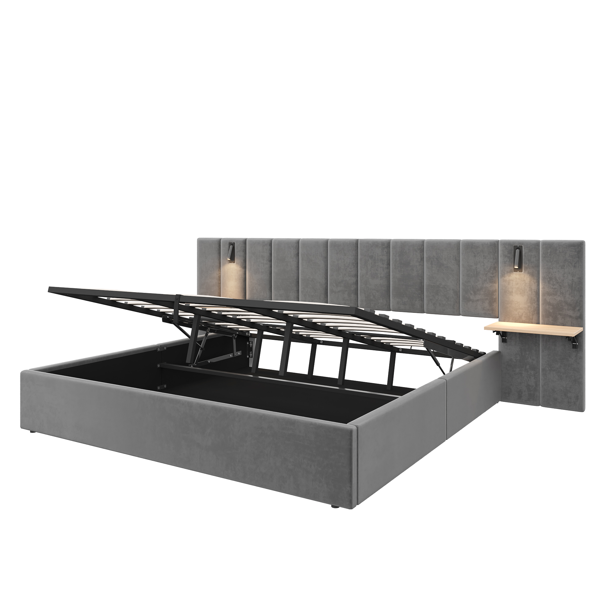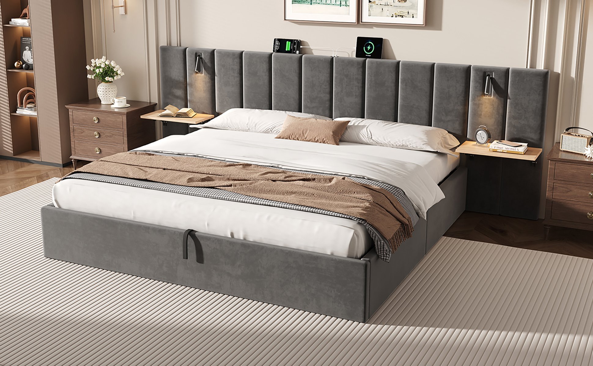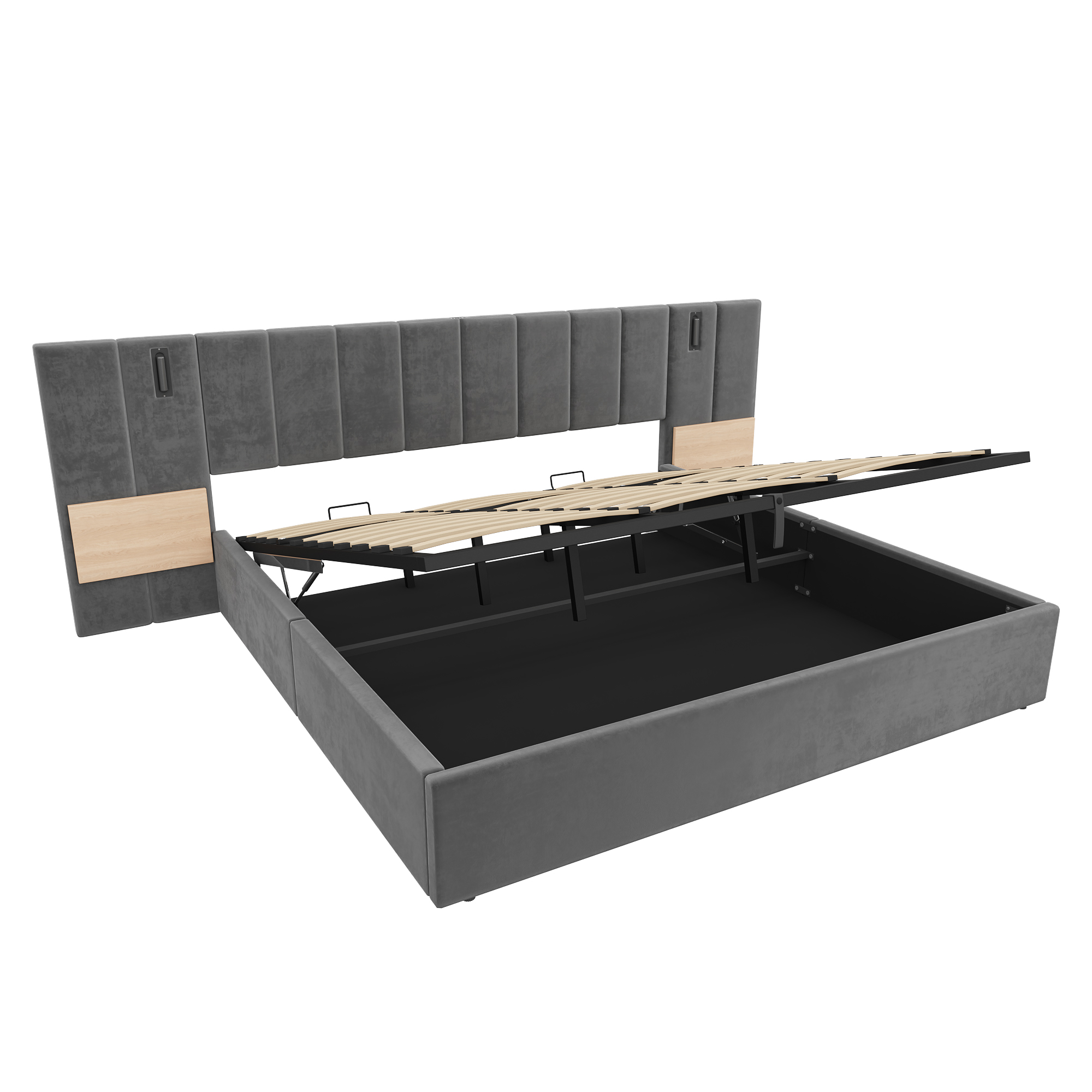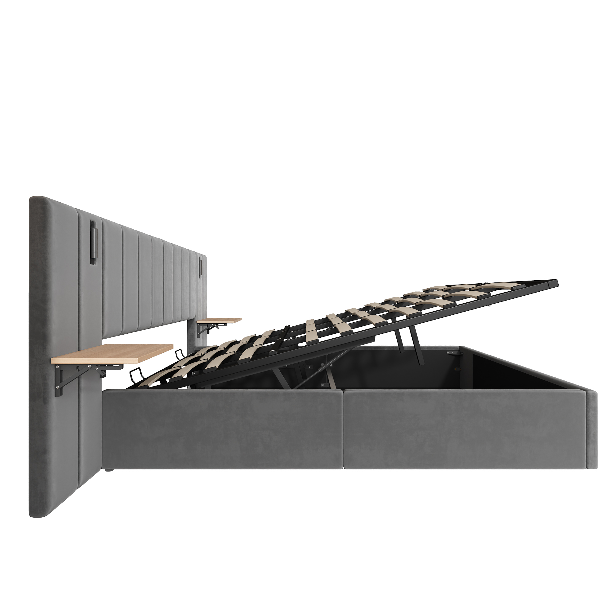 Product Name:Super King Upholstered Bed with Charging Station, Velvet Hydraulic Storage Bed with Reading Light, 6ft King Bed Frame with Channel Tufted Headboard and Adjustable Bedside Shelf, Grey (No Mattress)