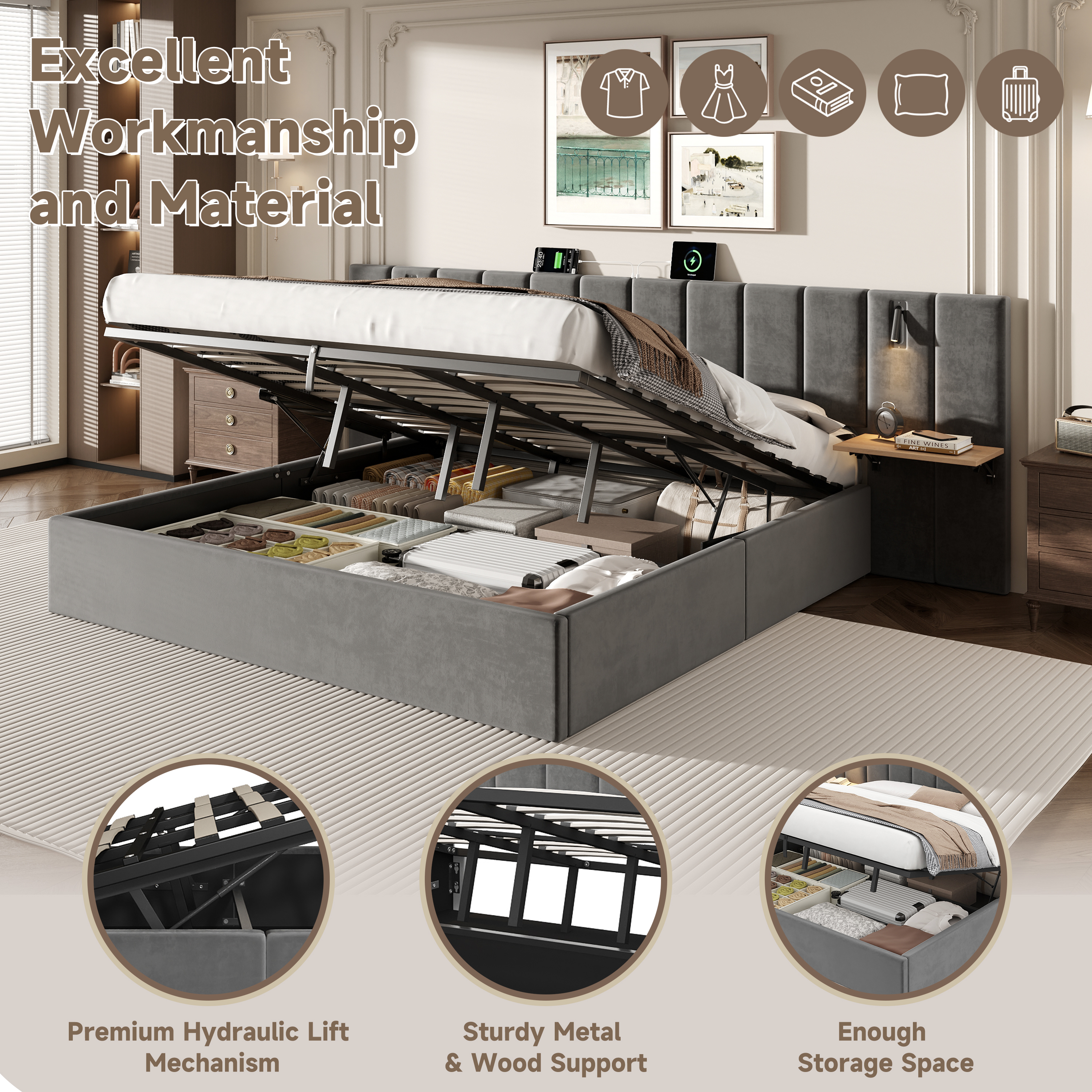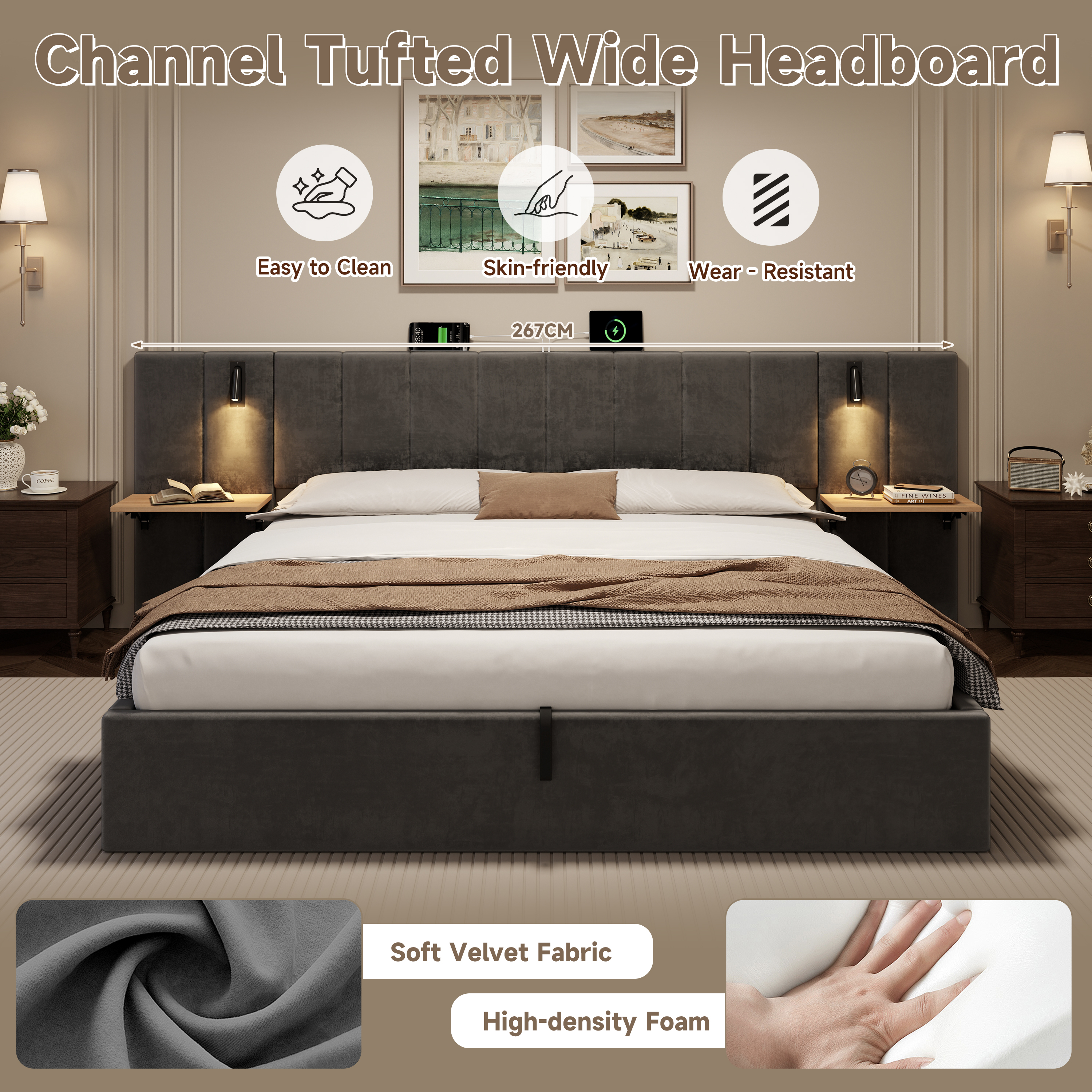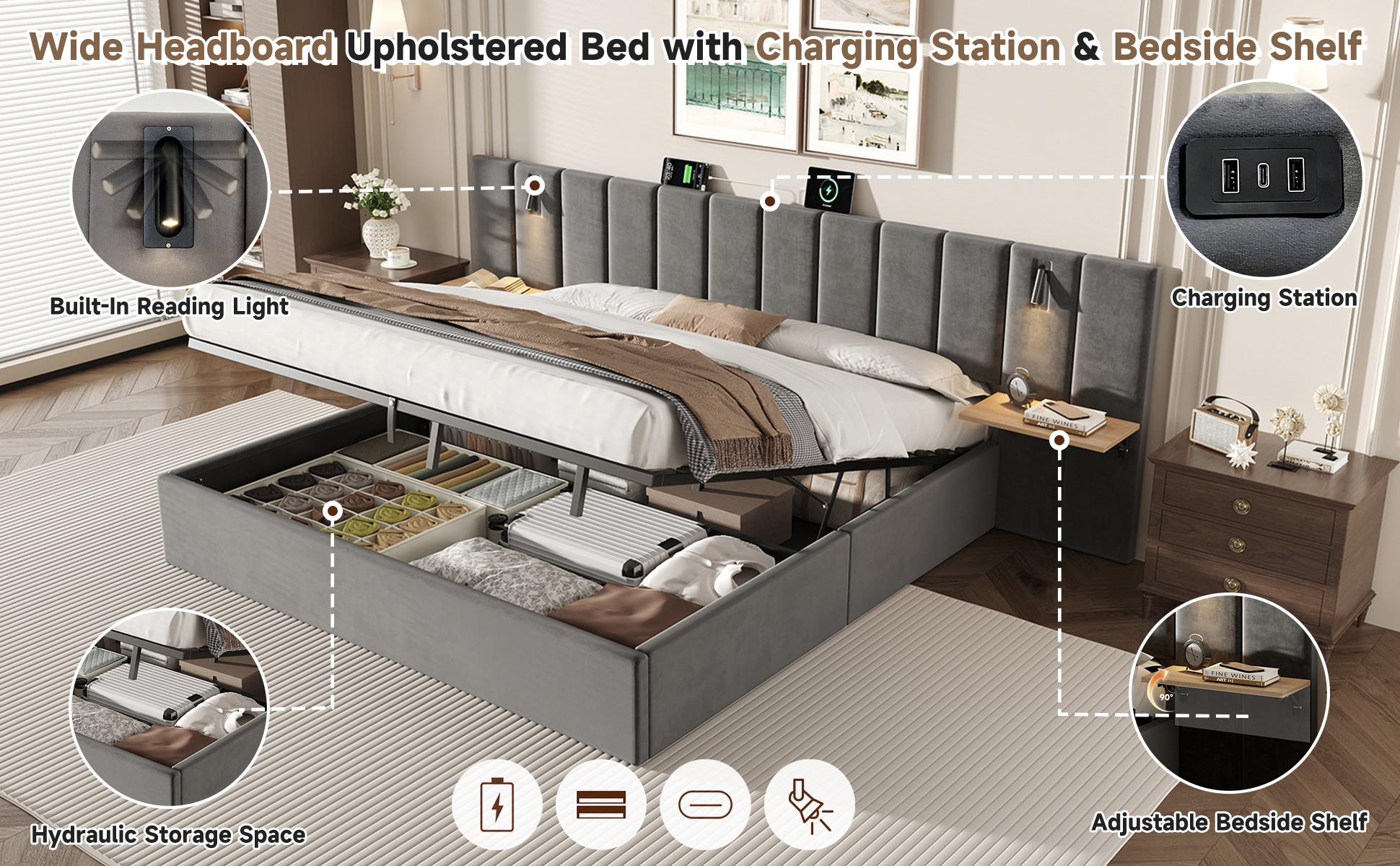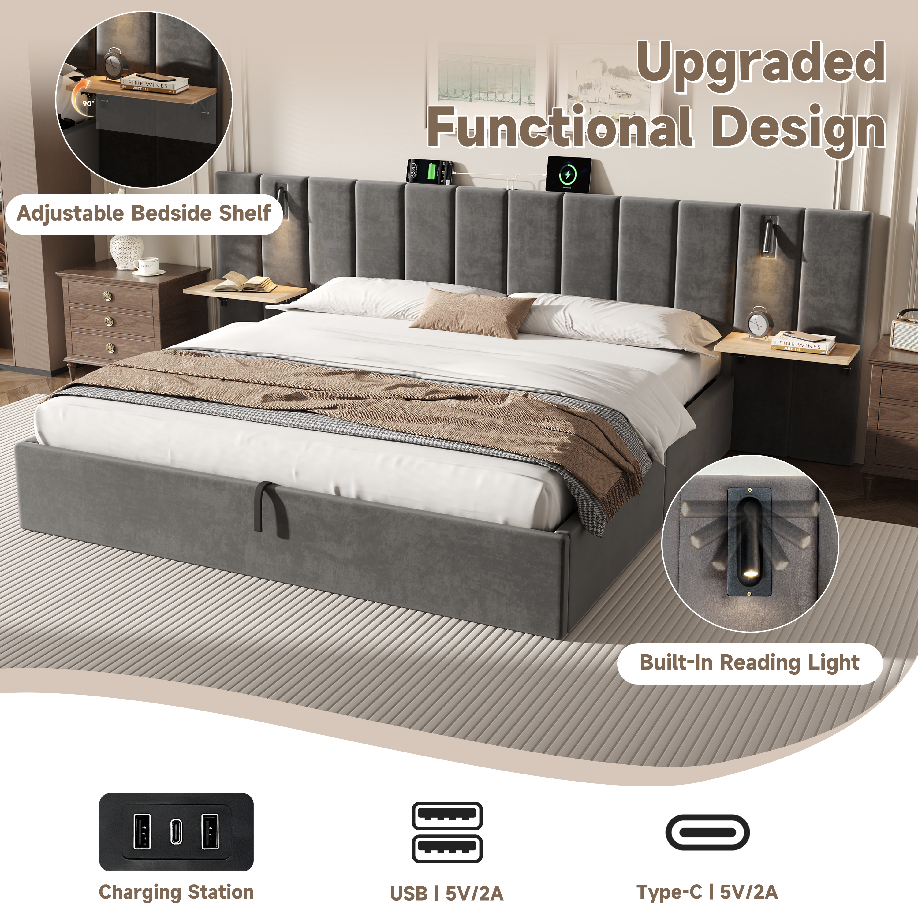 | Special Features | Charging Station & Built-in Reading Light & Adjustable Bedside Shelf & Hydraulic Storage & Channel Tufted Wide Headboard |