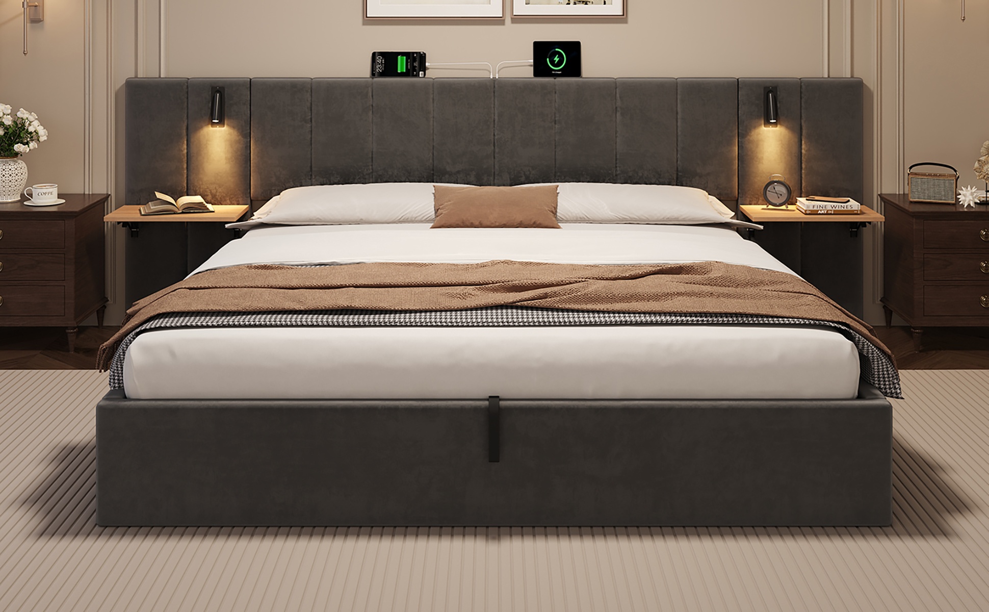 Wide Headboard Upholstered Bed with Charging Station,Bedside Shelf and Built-in Reading Light