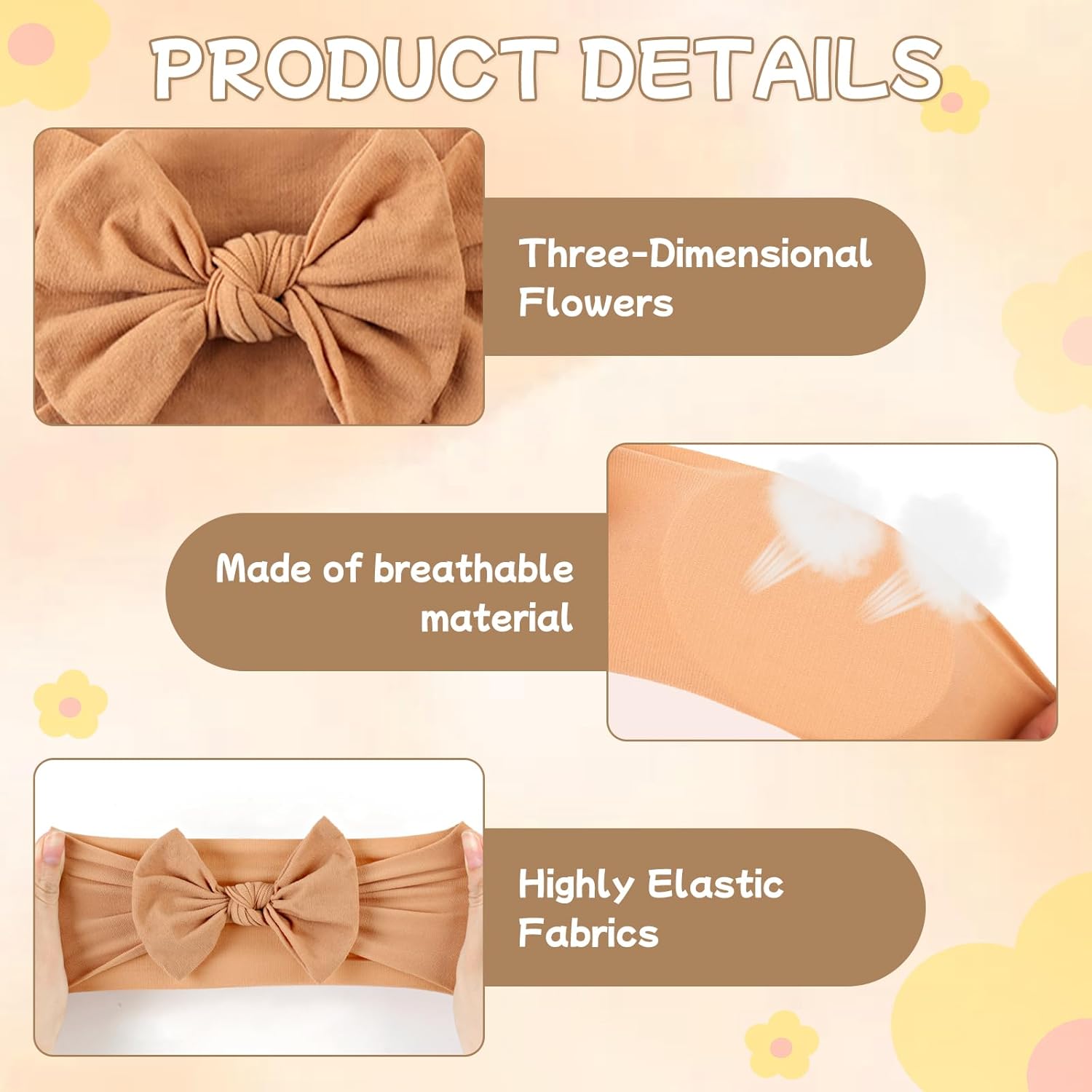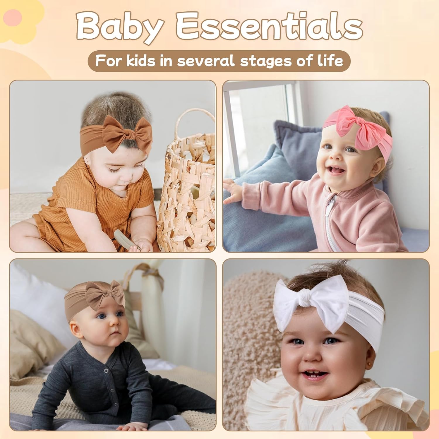 Baby infant Essentials Materials: Super soft nylon materials (85% nylon and 15% spandex),Extremely stretchy and elastic infant headbands fits most babies from infant to toddler.