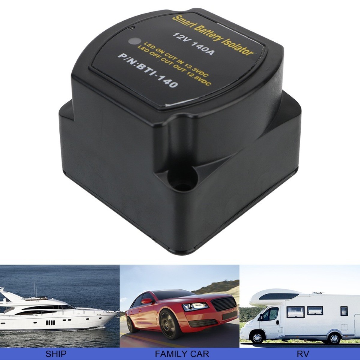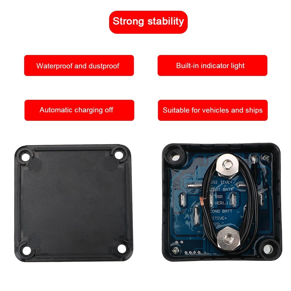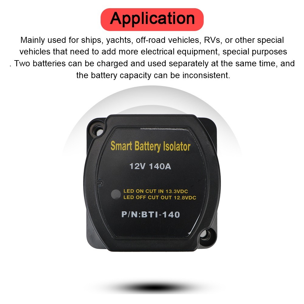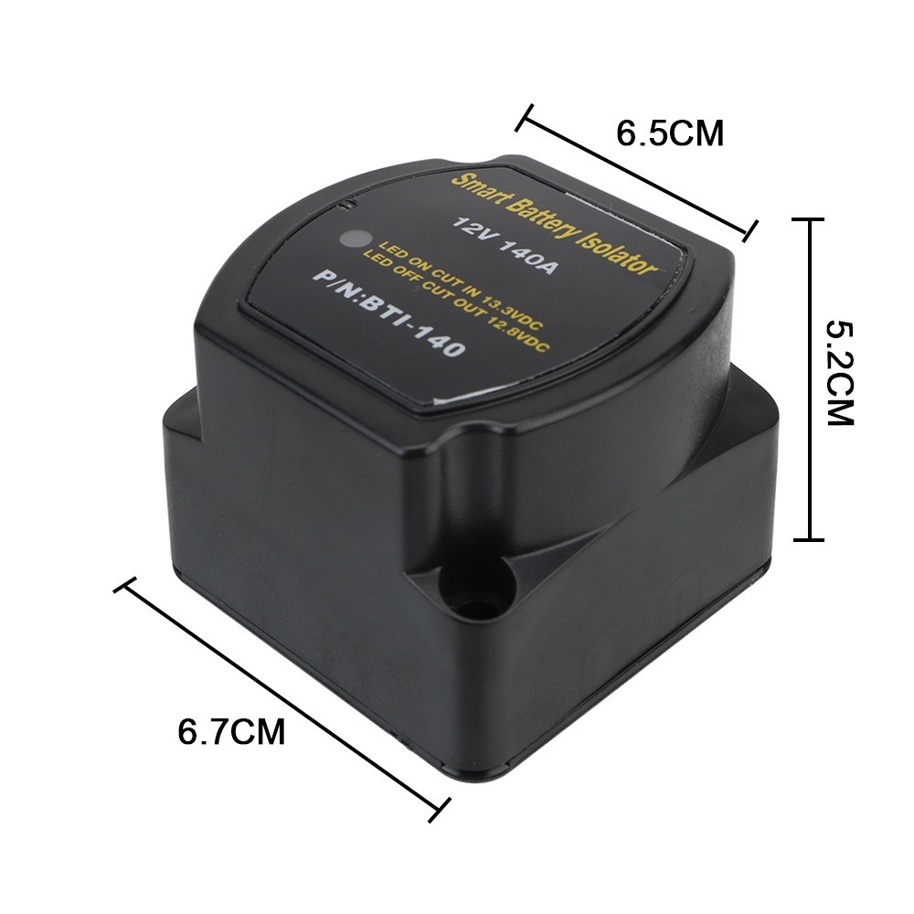 Spezifikationen: Produktname: Kfz-Doppelbatterie-Trennrelais mit Spannungsschutz und Ladeverteilung 12V 140A Material: Nylon Farbe: Schwarz Nennspannung: DC 12V Einschaltspannung: DC 13,3V Ausschaltspannung: DC 12,8V Dauerstrombelastbarkeit: DC 125A Kurzzeitige Strombelastbarkeit: DC 140A Stromverbrauch: 10 mA (Standby) / 330 mA (aktiv) / 0 mA (Lagerung) Anschlussbolzengröße: M6 (1/4") Wasserdichtigkeit: IP67 Das Paket beinhaltet: 1 x Intelligenter Batterieisolator für Autos Merkmale: - Automatische Verbindung und Trennung: Verbindet zwei Batterien während des Ladevorgangs automatisch und trennt sie, wenn nicht geladen wird. - Vielseitig einsetzbar: Geeignet für den Einbau in Wohnmobilen, Geländewagen, Freizeitfahrzeugen und im maritimen Bereich. - Hocheffiziente Stromübertragung: Im Gegensatz zu einigen ähnlich teuren Kits mit 70-Ampere-Kabeln verfügt dieses Produkt über ein effizienteres Design. - Kein Spannungsabfall: Im Vergleich zu Batterietrennrelais mit Dioden (0,6 V Spannungsabfall) weist dieses Produkt keinen Spannungsabfall auf und gewährleistet so eine effiziente Stromübertragung. - Sicherheitskonform: Erfüllt die Zündschutzstandards nach ISO8846 und ist für den Einsatz im Motorraum geeignet. - Robuste Konstruktion: Gehäuse aus glasfaserverstärktem Nylon für hohe Langlebigkeit. - Intuitive Anzeige: Die integrierte LED-Anzeige leuchtet auf, wenn das VSR-Relais aktiviert ist. - Flexible Installation: Optionen für Oberflächen- oder Schalttafeleinbau bieten flexible Montagemöglichkeiten. - Energiesparmodus: Der optionale Speichermodus sorgt dafür, dass bei ausgeschaltetem Motor kein Strom verbraucht wird. Spezifikationen: - Produktname: Kfz-Doppelbatterie-Trennrelais mit Spannungsschutz und Ladeverteilung 12V 140A - Material: Nylon - Farbe: Schwarz - Nennspannung: DC 12V - Einschaltspannung: DC 13,3V - Ausschaltspannung: DC 12,8V - Dauerstrombelastbarkeit: DC 125A - Kurzzeitige Strombelastbarkeit: DC 140A - Stromverbrauch: 10 mA (Standby) / 330 mA (aktiv) / 0 mA (Lagerung) - Anschlussbolzengröße: M6 (1/4") - Wasserdichtigkeit: IP67 Das Paket beinhaltet: - 1 x Intelligenter Batterieisolator für Autos