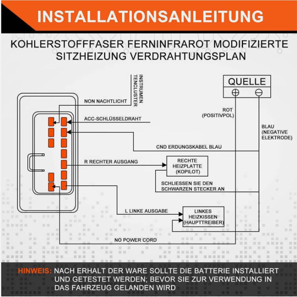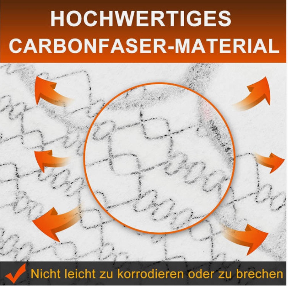 **Produktmerkmale:** 1. Kohlefaserfilament: Hohe Zugfestigkeit, stabile Leistungsabgabe 2. Ferninfrarotheizung: Fördert die Durchblutung 3. Schnelles Aufheizen in 5 Sekunden: Erreicht schnell eine angenehme Temperatur 4. Überhitzungsschutz: Schaltet die Stromzufuhr bei zu hoher Temperatur automatisch ab 5. Flammhemmendes Material: Sicher und langlebig 6. Hochwertiger Kabelbaum nach US-Standard: 30-A-Relais, hochwertige Steckverbinder **Spezifikationen:** - Oberflächenstruktur: Carbon - Produkttyp: Sitzheizung - Besonderheiten: Beheizbar, individuell anpassbar - Material: Carbon - Leistung: 12 V Gleichstrom, 25 W pro Heizkissen - Größe: 27 cm × 48 cm - Einbauposition: Sitzfläche / 1 Sitzfläche / 1 Rückenlehne - Sitzposition: Hinten - Universell kompatibel: Ja **Produktbeschreibung:**- Importiert aus Japan, 1K/3K-Kohlefaserfilament, hohe Zugfestigkeit, stabile Leistungsabgabe- Ferninfrarotheizung, fördert die Durchblutung - Schnelles Aufheizen in 5 Sekunden, erreicht schnell eine angenehme Temperatur - Überhitzungsschutz, schaltet die Stromzufuhr bei zu hoher Temperatur automatisch ab - Flammhemmendes Material, sicher und langlebig - Hochwertiger Kabelbaum, 30-A-Relais, hochwertige Steckverbinder **Produktmerkmale:**1. Kohlefaserfilament: Hohe Zugfestigkeit, stabile Leistungsabgabe2. Ferninfrarotheizung: Fördert die Durchblutung3. Schnelles Aufheizen in 5 Sekunden: Erreicht schnell eine angenehme Temperatur4. Überhitzungsschutz: Schaltet die Stromzufuhr bei zu hoher Temperatur automatisch ab5. Flammhemmendes Material: Sicher und langlebig6. Hochwertiger Kabelbaum nach US-Standard: 30-A-Relais, hochwertige Steckverbinder **Spezifikationen:**- Oberflächenstruktur: Carbon- Produkttyp: Sitzheizung- Besonderheiten: Beheizbar, individuell anpassbar- Material: Carbon- Leistung: 12 V Gleichstrom, 25 W pro Heizkissen- Größe: 27 cm × 48 cm- Einbauposition: Sitzfläche / 1 Sitzfläche / 1 Rückenlehne- Sitzposition: Hinten- Universell kompatibel: Ja **Einbauempfehlung:** Wir empfehlen den Einbau durch eine professionelle Kfz-Werkstatt, um die korrekte Installation und Nutzung des Produkts zu gewährleisten.