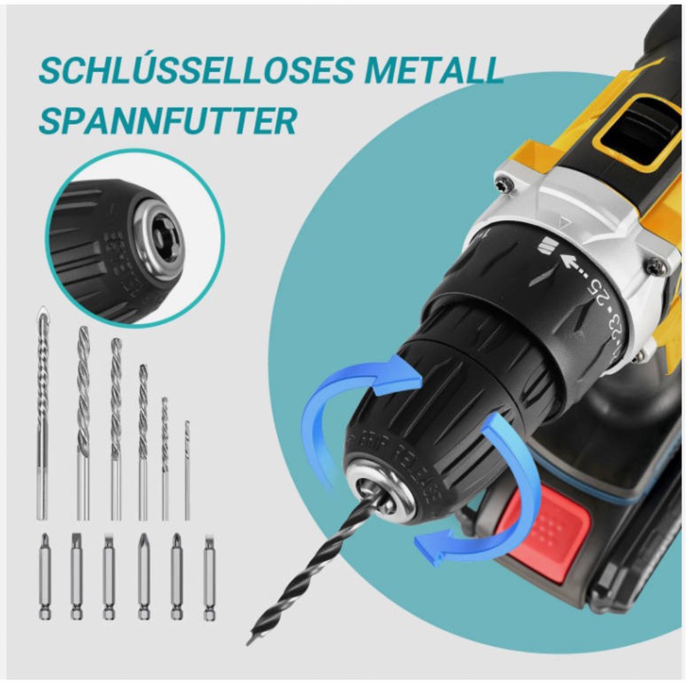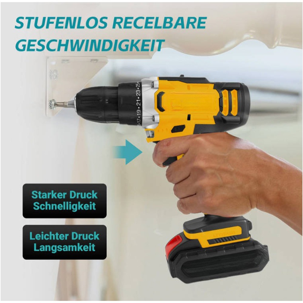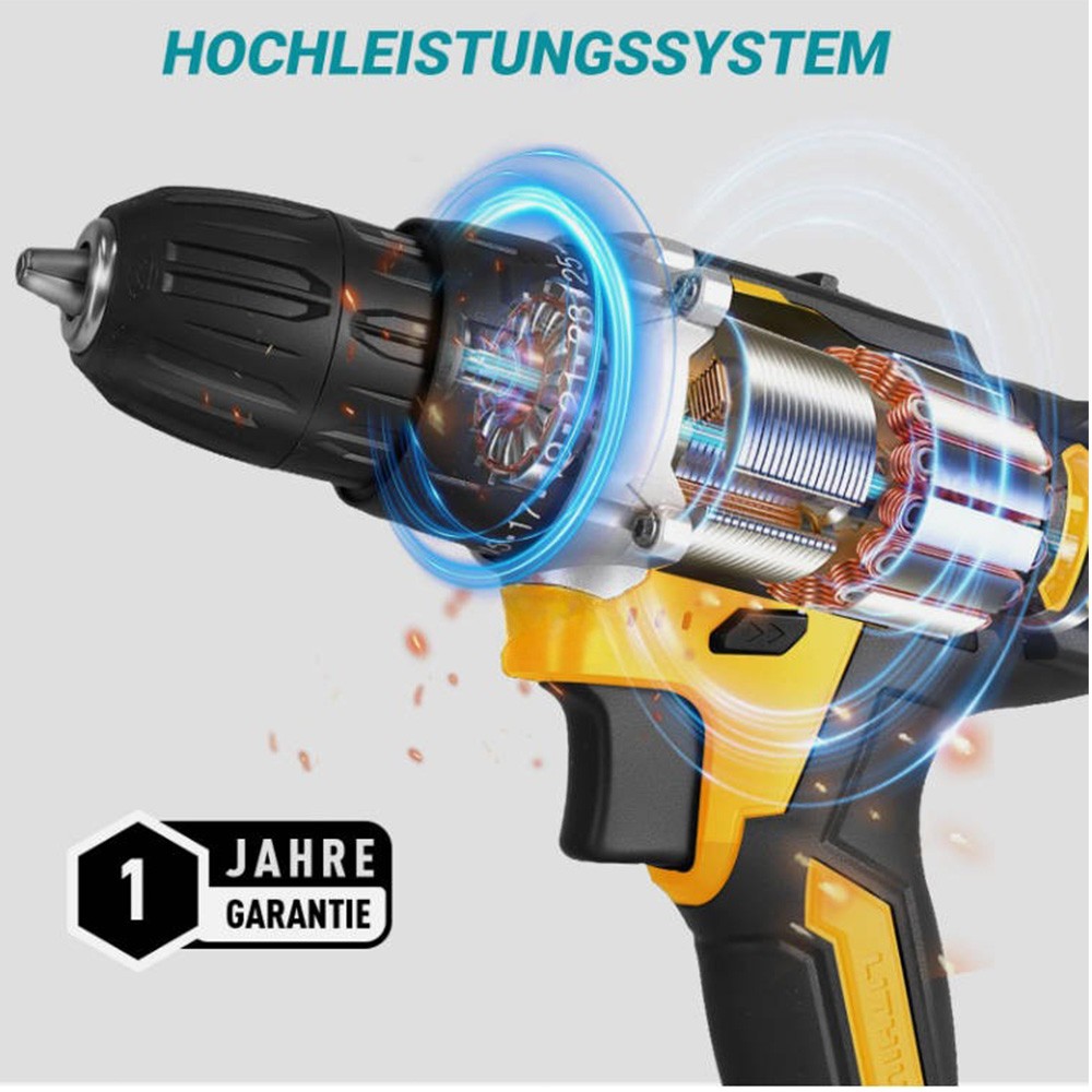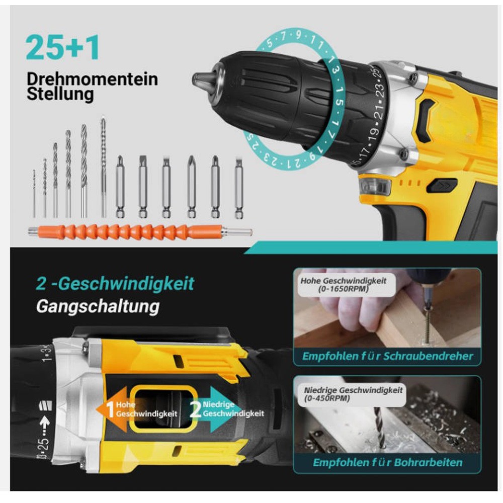 Produktname: 21 V Akkubetriebener Schlagbohrschrauber-Set Produktspezifikationen: - Nennleistung: 103 W - Maximales Drehmoment: 120 Nm - Minimales Drehmoment: 35 Nm Produkteigenschaften: - Akku-Kapazität: 2,5 Ah - Akku-Technologie: Lithium-Ionen (Li-ion) - Anzahl der Akkus: 2 - Akkus im Lieferumfang enthalten: Ja - Betriebsmodus: Akkubetrieben - Spannfutterschlussbereich: 10 mm (3/8 Zoll) - Spannfutter-Typ: Schlüsseloses Spannfutter - Geschwindigkeit: 1650 U/min - Farbe: Gelb - Gewicht: 1,6 kg - Maximales Drehmoment (zusätzliche Angabe): 40 Nm - Produkttyp: Akkubetriebener Schraubendreher - Spannung: 21 V Produktbeschreibung: Dieser Schlagschrauber verfügt über ein zweigeschwindigkeitsgetriebe aus Vollmetall, das eine hohe Leistungsübertragung und starkes Drehmoment bietet. Die Akkus zeichnen sich durch eine beeindruckend lange Laufzeit aus. Das 13-mm-Schlüsseloses Spannfutter besteht aus massivem Metall mit zentralen Spannbacken, und die automatische Spindelsperre ermöglicht eine schnellere Bedienung. Die bürstenlose Motorentechnologie und das 15-stufige Drehmomentmodul sorgen für präzises Anziehen in jeder Anwendungssituation. Lieferumfang: - 1 × Akkubetriebener Schlagbohrschrauber - 2 × Akkus - 6 × Schraubendreherbits (3 × Schlitzbits, 3 × Phillipsbits) - 6 × Spiralbohrer (1 × 3-mm-Silber-Spiralbohrer, 1 × 4-mm-Silber-Spiralbohrer, 1 × 5-mm-Silber-Spiralbohrer, 1 × 3-mm-Schwarz-Silber-Spiralbohrer, 1 × 4-mm-Schwarz-Spiralbohrer, 1 × 5-mm-Schwarz-Spiralbohrer) - 1 × Steckschlüsseladapter - 9 × Steckschlüssel (1 × 4 mm, 1 × 4,5 mm, 1 × 5 mm, 1 × 6 mm, 1 × 7 mm, 1 × 8 mm, 1 × 9 mm, 1 × 10 mm, 1 × 12 mm) - 1 × Schraubendreherbit-Adapter - 1 × Winkeladapter
