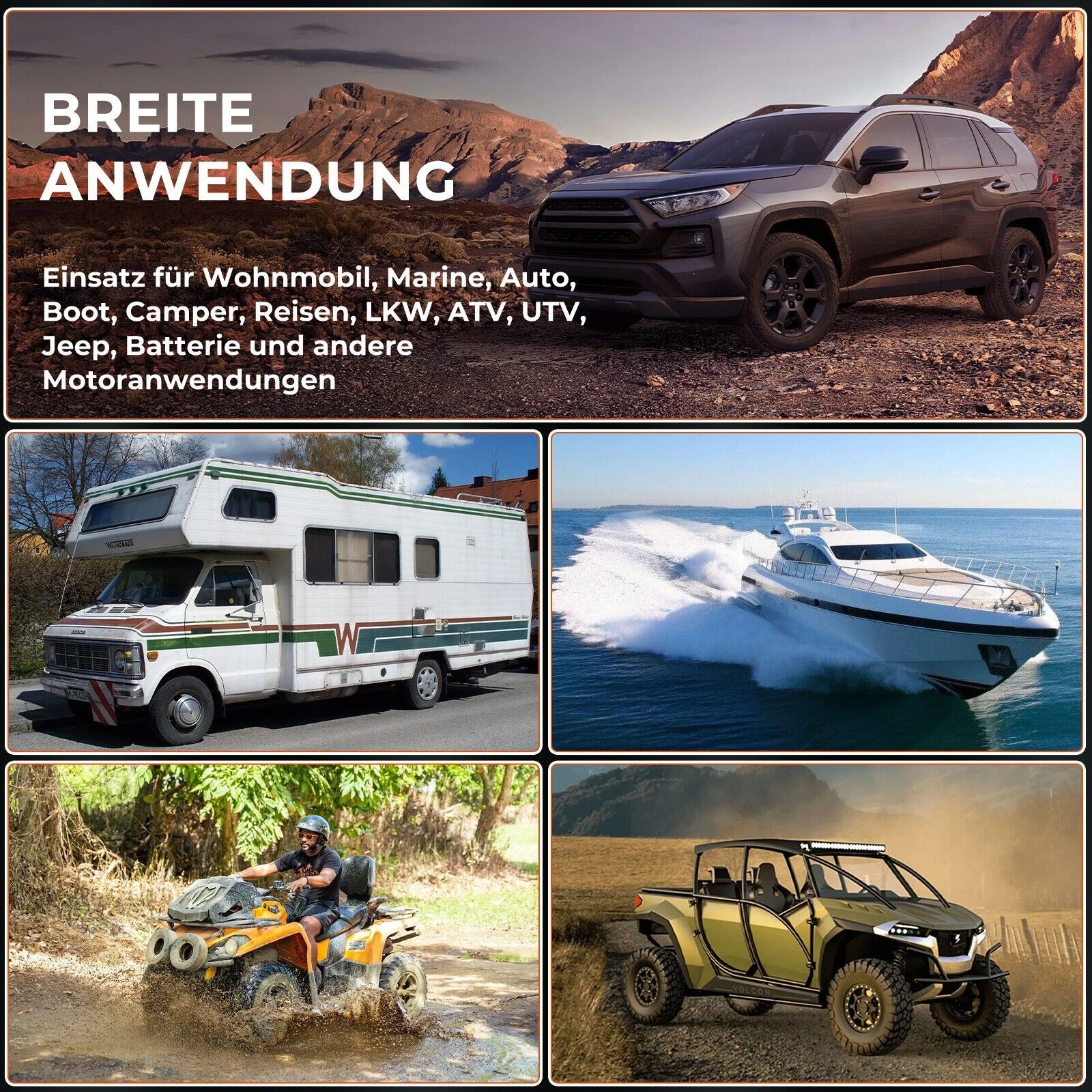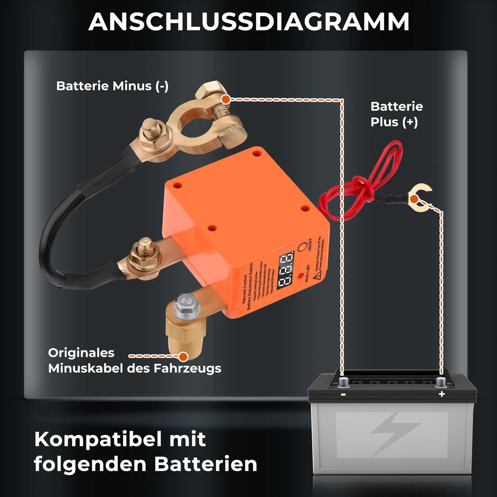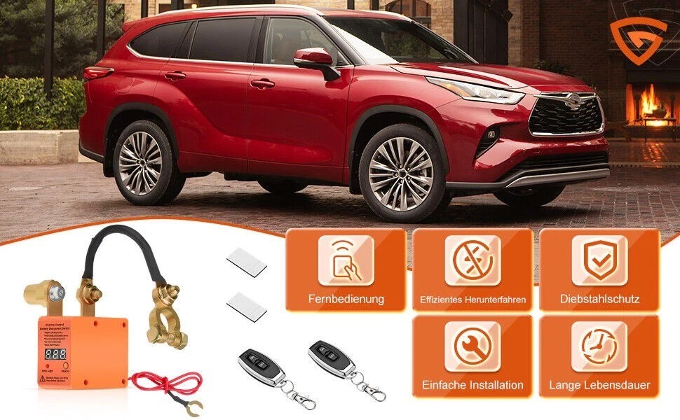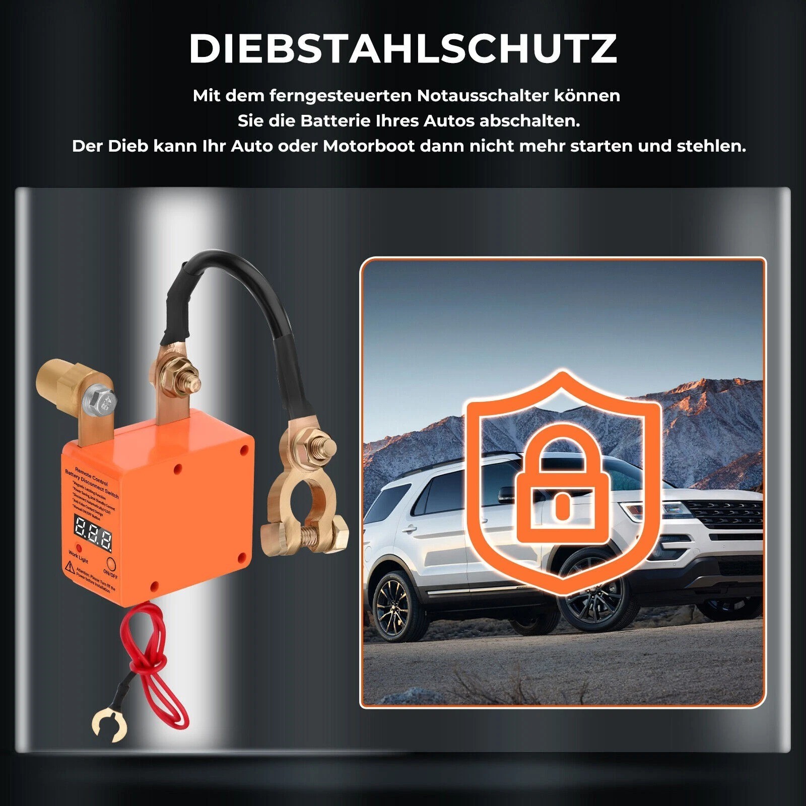 Produktname: 12-V-Autobatterie-Trennschalter mit Doppelfernbedienung Spezifikationen: Produkttyp: Batterie-Ferntrennschalter mit LED-Spannungsanzeige Nennspannung: 12 V Nennstrom: 240 A Kurzzeitstrom: 500 A Ruhestrom: 3 mA Farbe: Orange Betriebstemperatur: -30 °C bis 90 °C Produktbeschreibung: Dieser Autobatterie-Trennschalter ist mit einer LED-Spannungsanzeige ausgestattet. Der Not-Aus-Schalter verhindert eine Entladung der Batterie durch langes Parken, den Verbrauch elektronischer Geräte, vergessenes Ausschalten des Lichts, alternde Schaltkreise usw. und schützt so die Batterie effektiv und verlängert ihre Lebensdauer. Lieferumfang: Not-Aus-Schalter x 1 Fernbedienung x 2 Produktname: 12-V-Autobatterie-Trennschalter mit DoppelfernbedienungSpezifikationen: - Produkttyp: Batterie-Ferntrennschalter mit LED-Spannungsanzeige - Nennspannung: 12 V - Nennstrom: 240 A - Kurzzeitstrom: 500 A - Ruhestrom: 3 mA - Farbe: Orange - Betriebstemperatur: -30 °C bis 90 °C Produktbeschreibung: Dieser Autobatterie-Trennschalter ist mit einer LED-Spannungsanzeige ausgestattet. Der Not-Aus-Schalter verhindert eine Entladung der Batterie durch langes Parken, den Verbrauch elektronischer Geräte, vergessenes Ausschalten des Lichts, alternde Schaltkreise usw. und schützt so die Batterie effektiv und verlängert ihre Lebensdauer.Lieferumfang: - Not-Aus-Schalter x 1 - Fernbedienung x 2