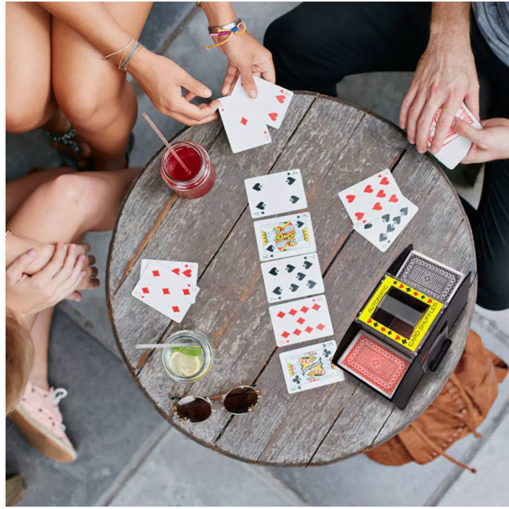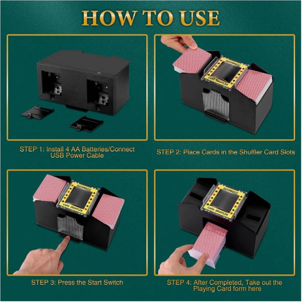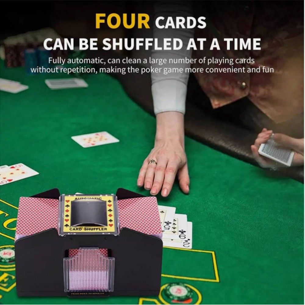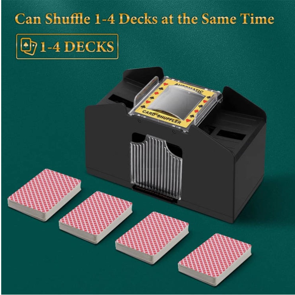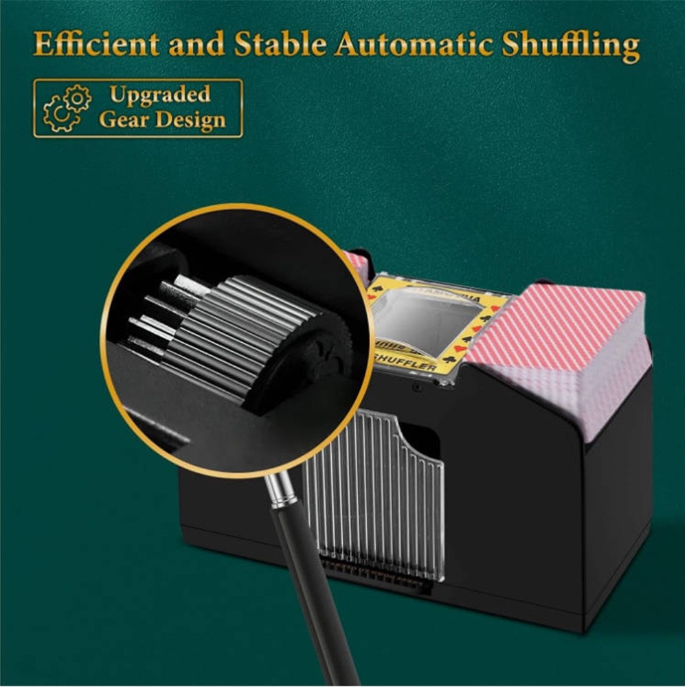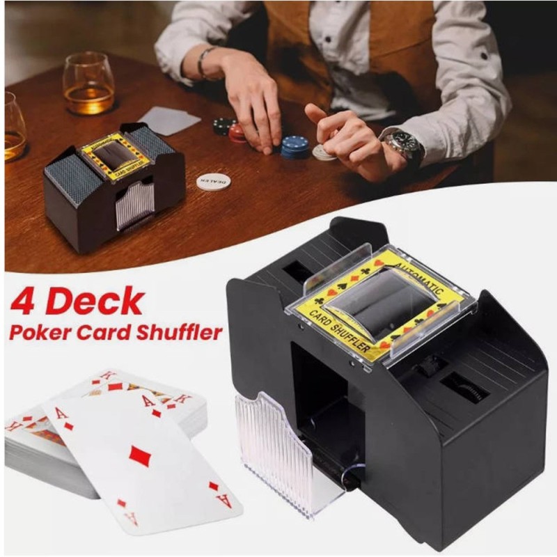 Produkttitel: Automatischer Kartenmischer Produkteigenschaften: Gleichzeitiges Mischen: Kann 1-4 Decks Karten gleichzeitig mischen – sichert Spielgerechtigkeit und verhindert Täuschung. Niedriglärm-Design: Ruhig mischen, ohne andere zu stören. Schnelles Mischen: Vollautomatische Bedienung, keine manuelle Eingabe erforderlich – zeitsparend und steigert den Spielspaß. Multifunktional: Passend für Poker, Texas Hold'em, Bridge und andere Kartenspiele. Anwendungsbereiche: Familientreffen Freundesspielabend Camping-Aktivitäten Bar-Unterhaltung Spezifikationen: Farbe: Schwarz Versorgungsart: 4 AA-Zellen (nicht im Lieferumfang enthalten) Material: ABS-Kunststoff Verpackungsinhalt: 1 x Automatischer Kartenmischer