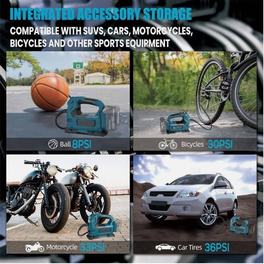 Produktname: Hocheffiziente 25-Zylinder-Reifenpumpe Produktmerkmale:- Leistungsstarke Leistung und schnelle Aufblasung: Angetrieben von einem 550-Watt-reinen Kupfermotor, liefert er eine starke Leistung und einen stabilen Luftstrom von 35L/Min. Er kann die Reifen schnell in den besten Zustand bringen, indem er 215/55 R17-Reifen in 4 Minuten von 0 auf 36 psi laden und sie in 1 Minute schnell auf 29-36 psi aufpumpen kann. Bitte beachten Sie, dass nach 20 Minuten ununterbrochener Nutzung die aufblasbare Pumpe vollständig ausgeruht und gekühlt werden muss, bevor sie wieder verwendet werden kann.- Automatische Aufpumpung mit voreingestelltem Reifendruck: Es ist nicht nötig, den Reifendruck manuell zu überprüfen und sich keine Sorgen um übermäßigen Reifendruck zu machen. Diese aufblasbare Pumpe ist mit einem fortschrittlichen Sensorchip mit intelligenten voreingestellten Funktionen ausgestattet, um den Reifendruck mit einem Fehler von weniger als 0,5 psi genau zu überwachen. Stellen Sie einfach den gewünschten Reifendruck ein, dann pumpt die Inflatorpumpe automatisch auf und stoppt, um einen optimalen Reifendruck zu gewährleisten.- Digitaldisplay mit LED-Beleuchtung: Ausgestattet mit einer hochpräzisen, hellen Anzeige, die eine Echtzeit-Messung des Reifendrucks ermöglicht. Die aufblasbare Pumpendruckanzeige verfügt über vier Anzeigemodi für PSI, BAR, KPA und KG/CM². 4 helle LED-Lichter für einfache Bedienung, auch im Dunkeln.- Bequeme Lagerung: Die aufblasbare Pumpe verfügt über eine eingebaute Aufbewahrungsbox mit verschiedenen Ventilspezifikationen, was sie mit SUVs, Autos, Motorrädern, Fahrrädern und anderer Sportausrüstung kompatibel macht. Der Luftkanal auf beiden Seiten des Sockels ist für eine einfache Aufbewahrung und Lagerung konzipiert. Packliste:- 1 x aufblasbare Pumpe- 1 x 12V Netzkabel (61 cm)- 3 x Düsen- 1 x Benutzerhandbuch- (Batterien nicht enthalten)