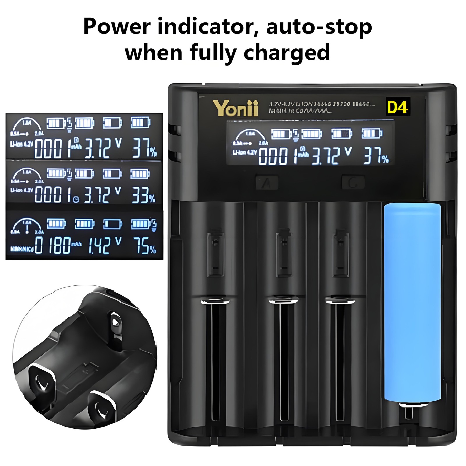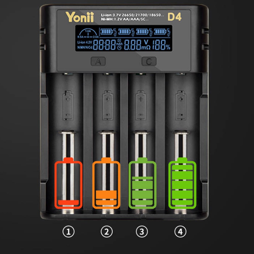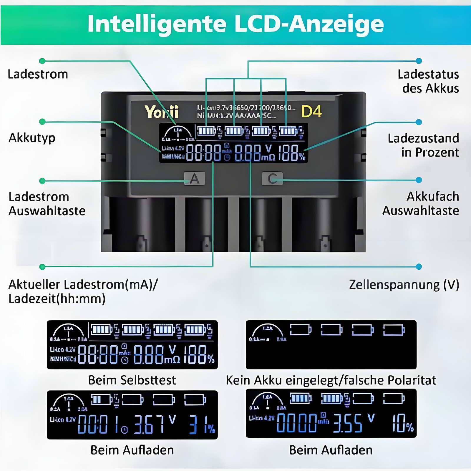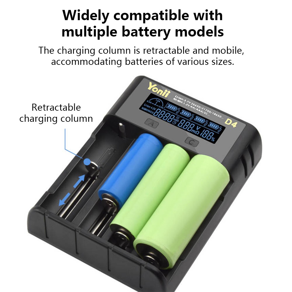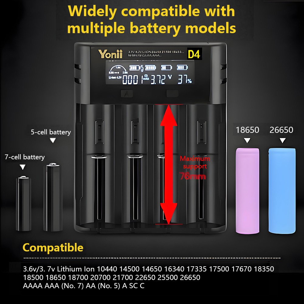 **Kompatible Akkumodelle:** - 3,6V/3,7V Li-Ion-Akkus: 10400/14500/14650/16340(RCR123)/18350/18500/18490/18650/20700/21700/22650/26650/26700 - 1,2V Ni-MH/Ni-Cd-Akkus: AAAA/AAA/AA/A/SC/C/F6 **Produkt Technische Daten:** - Eingang: 5 V 2 A - Ausgang: 4,2 V 2 A/1 A/0,5 A - Geeignete Akkutypen: Lithium-Ionen-Akku, Nickel-Metallhydrid-Akku **Sicherheitsmerkmale:** - Automatischer Ladestopp bei vollem Akku - Verpolungsschutz - Erkennung nicht wiederaufladbarer Akkus - Flammhemmendes Gehäuse **Lieferumfang:** - 1 x Intelligentes Ladegerät - 1 x USB-Ladekabel **Produktbezeichnung:** Multifunktionales Smart-Ladegerät, kompatibel mit verschiedenen Akkumodellen **Produktmerkmale:**- Weitgehend kompatibel mit verschiedenen Akkumodellen- Unabhängiges Laden in 4 Steckplätzen mit intelligentem Lademanagement- Einziehbare Ladekontakte für verschiedene Akkugrößen- Umfassende Sicherheitsfunktionen, darunter Ladestopp bei vollem Akku, Verpolungsschutz, Erkennung nicht wiederaufladbarer Akkus und flammhemmendes Gehäuse **Kompatible Akkumodelle:**- 3,6V/3,7V Li-Ion-Akkus: 10400/14500/14650/16340(RCR123)/18350/18500/18490/18650/20700/21700/22650/26650/26700- 1,2V Ni-MH/Ni-Cd-Akkus: AAAA/AAA/AA/A/SC/C/F6 **Produkt Technische Daten:** - Eingang: 5 V 2 A - Ausgang: 4,2 V 2 A/1 A/0,5 A - Geeignete Akkutypen: Lithium-Ionen-Akku, Nickel-Metallhydrid-Akku **Sicherheitsmerkmale:** - Automatischer Ladestopp bei vollem Akku - Verpolungsschutz - Erkennung nicht wiederaufladbarer Akkus - Flammhemmendes Gehäuse **Lieferumfang:** - 1 x Intelligentes Ladegerät - 1 x USB-Ladekabel