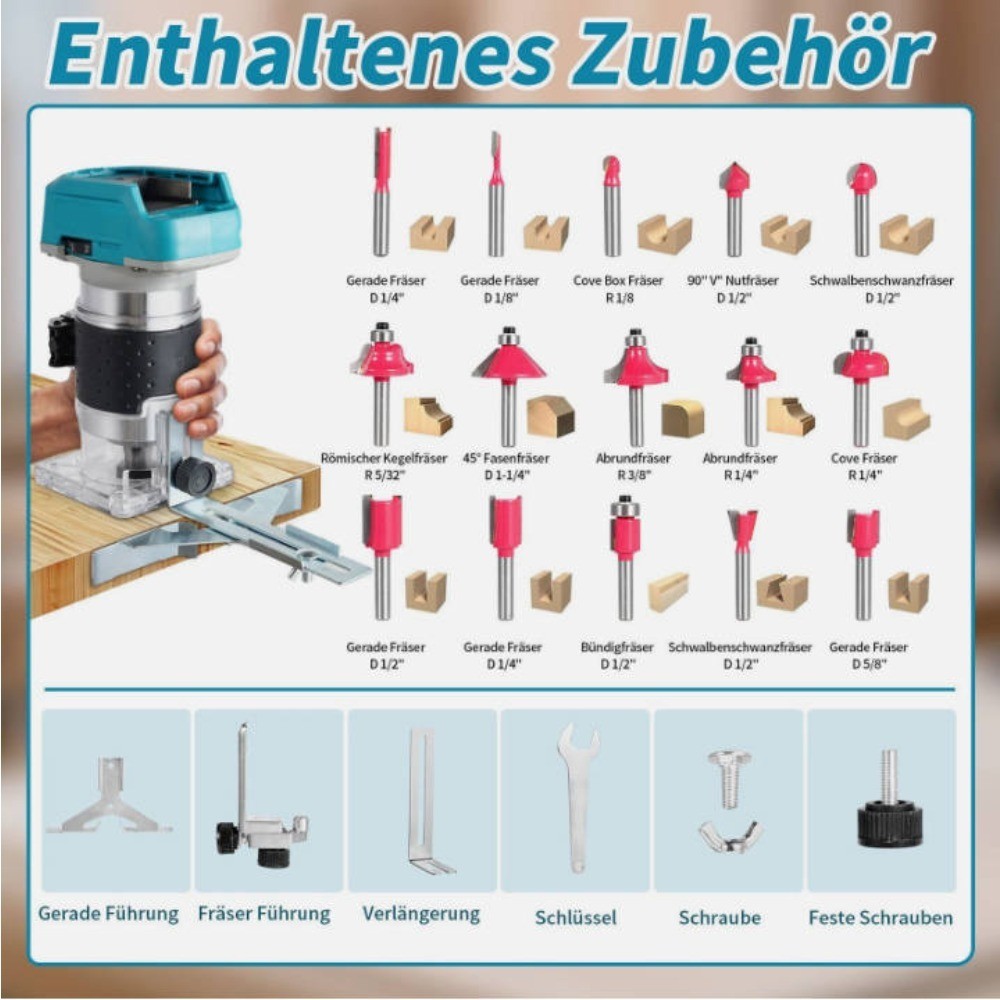 | 18V Akku-Fräse ohne Bürsten, kompatibel mit Makita 18V-Akkus 6 Gang-Drehzahlregelung 12.000–22.000 U/min, 15-teiliges Fräser-Set, mit L-Führungsschiene Wichtige Kompatibilitätserklärung ⚠️ Dieses Produkt ist ein kompatibles Erzeugnis eines Drittherstellers, kein Originalprodukt von Makita. ⚠️ Dieses Werkzeug kann mit Makita 18V-Akkus verwendet werden (z. B. BL1860, BL1850, BL1840, BL1830, BL1815 etc.). Akkus sind nicht im Lieferumfang enthalten und müssen separat erworben werden. Produkt-Highlights ✔ Makita-Akku-Kompatibilität: Passt zu Makita 18V-Li-Ionen-Akkus, kabellose Freiheit (Akku separat erhältlich) ✔ 6-stufige stufenlose Drehzahlregelung: 12.000–22.000 U/min, passend für unterschiedliche Arbeiten ✔ Starker bürstenloser Motor: Hohe Leistung, saubere und schnelle Schnitte, langlebig ✔ Standard-Spindel 6,35 mm: Passend für Fräser mit 1/4"-Schaft, hohe Universalität ✔ 15-teiliges Fräser-Set: Gerade Fräser, Profilfräser u. v. m., sofort einsatzbereit ✔ Ergonomisches Design: Rutschfester Gummigriff, komfortabel; durchsichtige Basis für präzise Sicht ✔ LED-Beleuchtung: Arbeitslicht für präzises Arbeiten auch bei schlechten Lichtverhältnissen ✔ Höhenverstellung 230 mm: Für Werkstücke unterschiedlicher Stärken geeignet Technische Daten Produkttyp: Handfräse / Oberfräse Betriebsspannung: 21 V DC Akku-Kompatibilität: Makita 18V Li-Ionen-Akkus (BL1860/BL1850/BL1840/BL1830/BL1815 etc.) Leerlaufdrehzahl: 13.000–28.000 U/min (6 Stufen) Schaftaufnahme: 6,35 mm (1/4 Zoll) Motortyp: Bürstenloser Motor Gehäusematerial: ABS-Kunststoff Stromversorgung: Kabellos, Akku-Betrieb Gewicht (nur Gerät): 1,6 kg Verpackungsmaße: 20,5 cm × 23,5 cm × 8,5 cm Farbe: Blau Ursprungsland: China 15-teiliges Fräser-Set - Gerade Fräser: 3 mm, 6 mm, 12 mm, 16 mm (je 1 St.) - Hohlkehlfräser: R3,2 mm, R6,3 mm (je 1 St.) - 90° V-Nutfräser: 12,7 mm (1 St.) - Dübelfräser: 12,7 mm (1 St.) - Schwalbenschwanzfräser: 12,7 mm (1 St.) - Fasenfräser: 6,3 mm (1 St.) - Kantenfräser: 12,7 mm (1 St.) - Rundfräser: R9,5 mm (1 St.) - 45° Schrägfräser: 32 mm (1 St.) - Romaprofil-Fräser: R4 mm (1 St.) Gesamt: 15 Fräser Lieferumfang 1 × Bürstenlose Akku-Fräse (ohne Akku) 1 × L-Führungsschiene 1 × L-Halterung 1 × Schraubenschlüssel 1 × Verlängerungsstange 1 × Schrauben-Set 15 × Fräser (Schaft 6,35 mm) 1 × Aufbewahrungsbox Anwendungsbereiche - Möbelbau: Kanten bearbeiten, Nuten fräsen, Kanten verarbeiten - Holzgravur: Feine Gravuren, Dekorprofile, Kunstarbeiten - Parkettverlegung: Kantenbearbeitung, Nuten an Türen und Ecken - Tür- & Fensterrahmen: Zapfenschlösser, Schwalbenschwanznuten - DIY & Kunsthandwerk: Holzmodelle, Spielzeuge, Schmuckkästen - Schablonenbau: Kurven- und Geradschablonen für Bau & Renovierung - Reparatur & Restaurierung: Alte Möbel reparieren, neu fräsen - Innenausbau: Wandgestaltungen, Deckenprofile Sicherheitshinweise ⚠️ Vor Gebrauch Akku vollständig laden, korrekt einstecken und Verriegelung prüfen. ⚠️ Fräser immer mit Schlüssel festziehen, um Lösen bei hoher Drehzahl zu vermeiden. ⚠️ Beim Arbeiten immer Schutzbrille, Staubmaske und Schutzhandschuhe tragen. ⚠️ Werkstück sicher befestigen (mit Schraubzwinge), nicht in der Hand halten. ⚠️ Drehzahl nur bei ausgeschaltetem Gerät einstellen. ⚠️ Bei Verwendung der Verlängerung auf Balance achten. ⚠️ Arbeitsbereich sauber und fern von brennbaren Stoffen halten. ⚠️ Anfänger empfehlen wir Übungen an Abfallholz vor der richtigen Anwendung. |