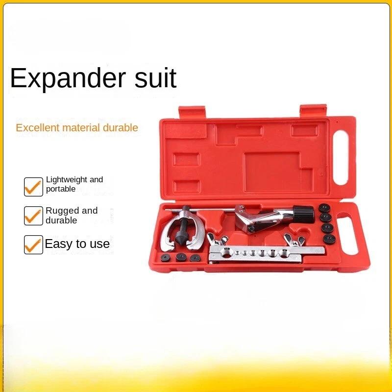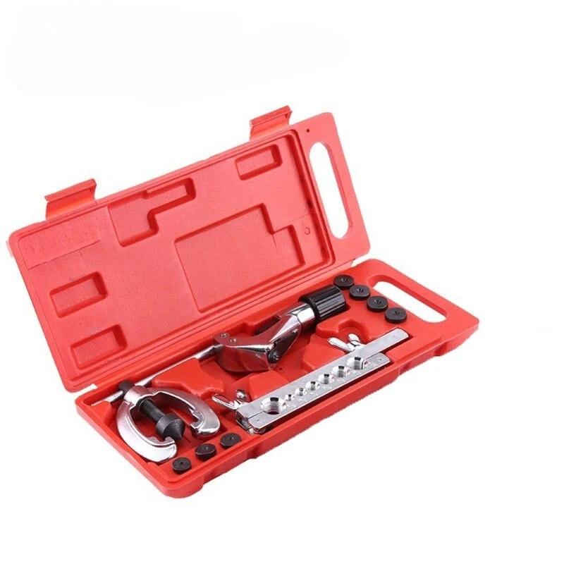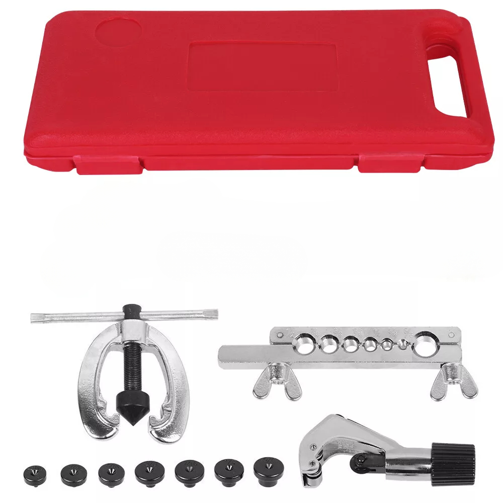 10-piece Pipe Flaring Kit Brake Fuel Pipe Repair Flaring Kit with Cutter and Bending Tool - This high-quality flaring tool is ideal for flaring pipes and can be used to make single or double flares on copper, brass, and thin-walled aluminum pipes. What's more, it comes with pipe cutting and bending tools for your convenient use. Constructed with high-quality steel and aluminum alloy materials to ensure strength and durability. Packed in a storage case for easy storage and transportation. You deserve it! - Features: - This tool set is specially developed for pipe flaring and can be used to make single or double flares - Contains complete pipe cutters, flaring tools, clamps, and 7 double flare dies, all you need, easy to use and operate - Comes with a bending tool that can bend the pipe up to 180 degrees accurately. Suitable for 1/4inch, 5/16inch, and 3/8inch pipes - Made of high-quality steel & aluminum alloy material, heavy-duty construction ensures a professional job - All parts are neatly packed in a storage case, convenient to carry at home or outdoors - It can be used for copper, brass, or thin-walled aluminum pipes - Specifications: - Material: Steel & aluminum alloy - Color: as shown in the picture - Die sizes: 3/16", 1/4", 5/16", 3/8", 7/16", 1/2", 5/8" - Pipe cutter length: 12.7cm/5" - Clamp length: 12.5cm/4.9" - Flaring tool length: 17.5cm/6.9" - Bending tool length: 26.5cm/10.4" - Storage case size: 33×13.5×4cm/13"×5.3"×1.6" - Package weight: approx. 1.9kg - Package includes: - 1 × Flaring tool - 1 × Cutter - 1 × Bending tool - 7 × Double flare dies - 1 × Storage case - Notes: Please allow 1-3cm error due to manual measurement. Thank you for your understanding!