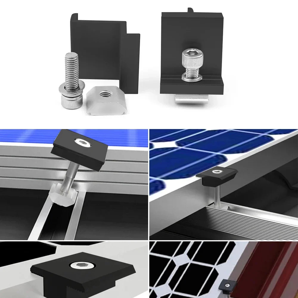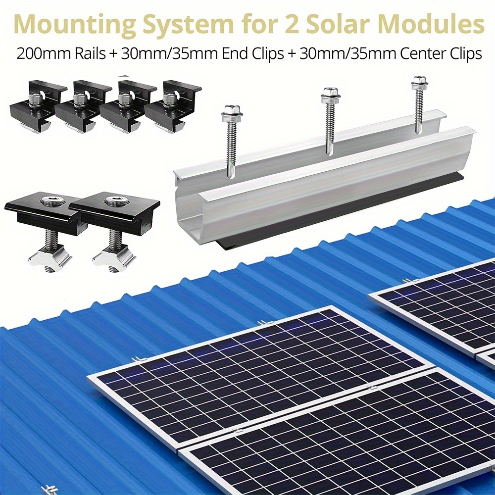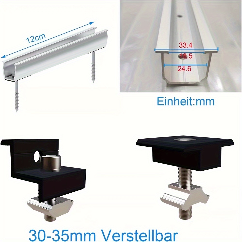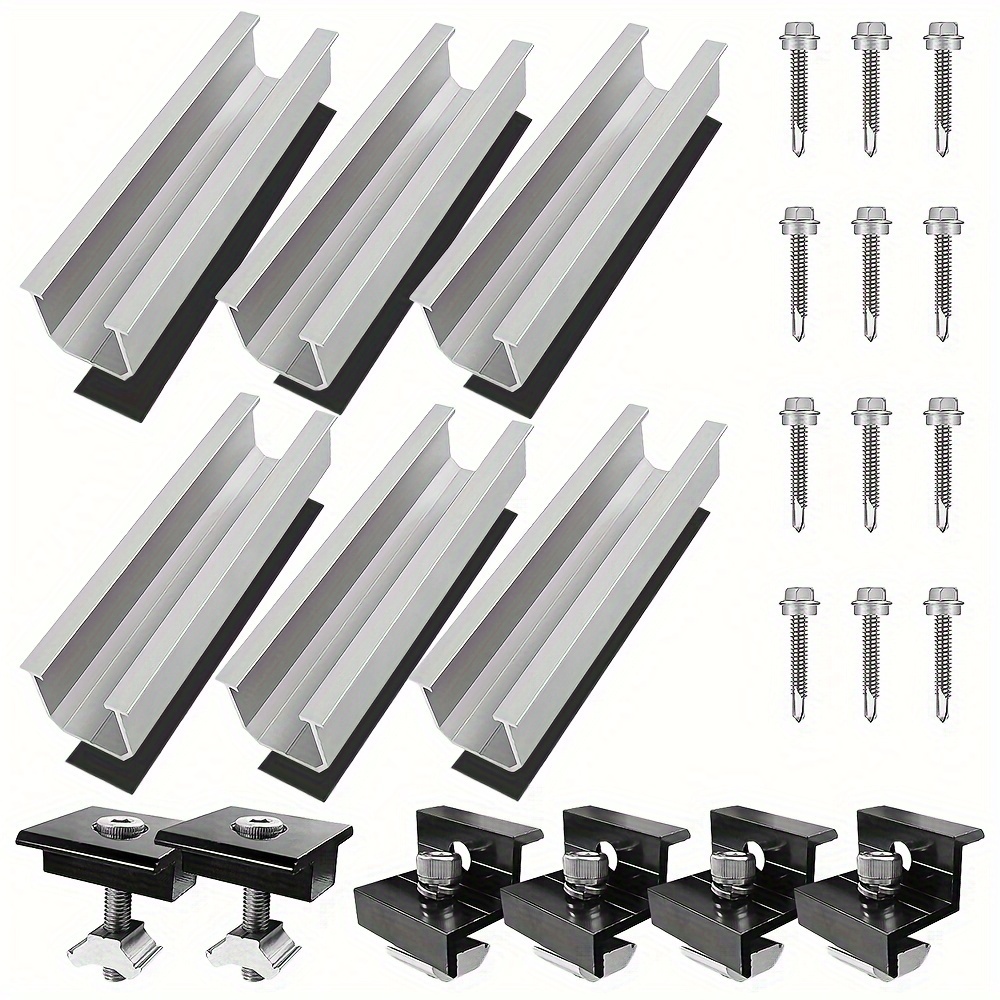 12Pcs/set Solar Photovoltaic Bracket Aluminum Alloy Clamp For Solar Module Solar Panel Racking Mounts Accessories12pcs Solar Panel Bracket Aluminum PV Rail Fastening Module Trapezoidal Roof Mount Solar Rail End and Middle Clamps Features: - High-Quality Material: Made from anodized aluminum alloy, our solar panel clamps are corrosion-resistant, have smooth edges, and high hardness, ensuring normal operation even under extreme conditions. - Solid Connection: The Z-type solar panel supports firmly hold the panels to the rails, forming a solid connection between the panels for greater stability and safety. - Wide Range of Applications: The solar panel supports are adjustable and suitable for most domestic solar panels, recreational vehicles, and marine solar panel installations. They can be installed on both flat and pitched roofs. - Easy Installation: The photovoltaic mounting rails come with stainless steel screws and a pre-drilled design. Simply fix the edges of the solar panels in the middle to create a strong connection. - Heat Dissipation Design: The bracket design helps dissipate heat and provides a clean space for the solar panels.Package Contents: - 6 × 120mm Solar Panel Rails - 4 × End Clamps - 2 × Middle Clamps - 12 × Screws - Suitable for solar panels with a frame height of 30-35mm.