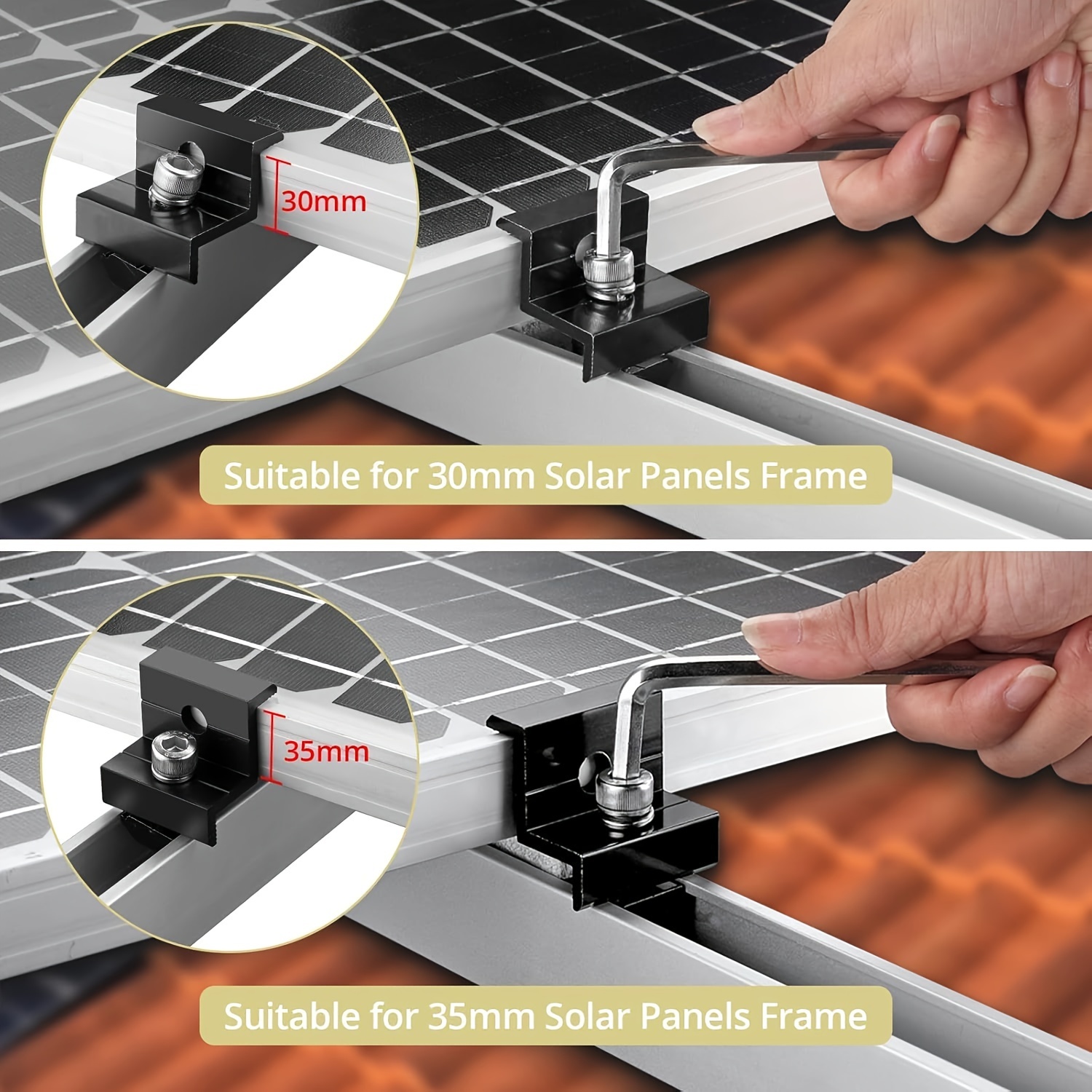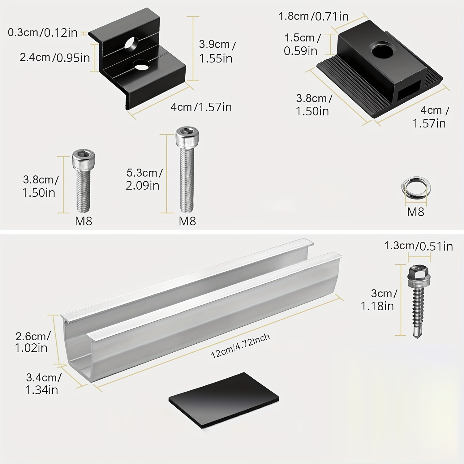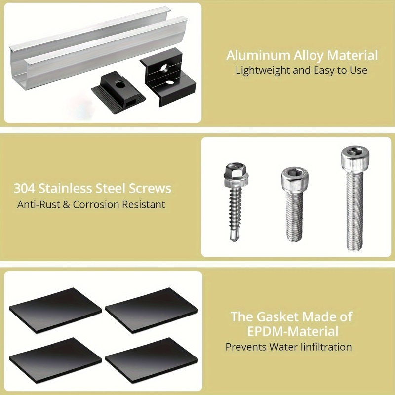 12Pcs/set Solar Photovoltaic Bracket Aluminum Alloy Clamp For Solar Module Solar Panel Racking Mounts Accessories12pcs Solar Panel Bracket Aluminum PV Rail Fastening Module Trapezoidal Roof Mount Solar Rail End and Middle Clamps Features: - High-Quality Material: Made from anodized aluminum alloy, our solar panel clamps are corrosion-resistant, have smooth edges, and high hardness, ensuring normal operation even under extreme conditions. - Solid Connection: The Z-type solar panel supports firmly hold the panels to the rails, forming a solid connection between the panels for greater stability and safety. - Wide Range of Applications: The solar panel supports are adjustable and suitable for most domestic solar panels, recreational vehicles, and marine solar panel installations. They can be installed on both flat and pitched roofs. - Easy Installation: The photovoltaic mounting rails come with stainless steel screws and a pre-drilled design. Simply fix the edges of the solar panels in the middle to create a strong connection. - Heat Dissipation Design: The bracket design helps dissipate heat and provides a clean space for the solar panels.Package Contents: - 6 × 120mm Solar Panel Rails - 4 × End Clamps - 2 × Middle Clamps - 12 × Screws - Suitable for solar panels with a frame height of 30-35mm.