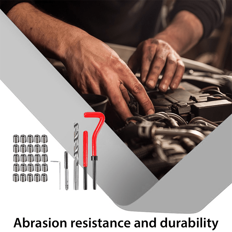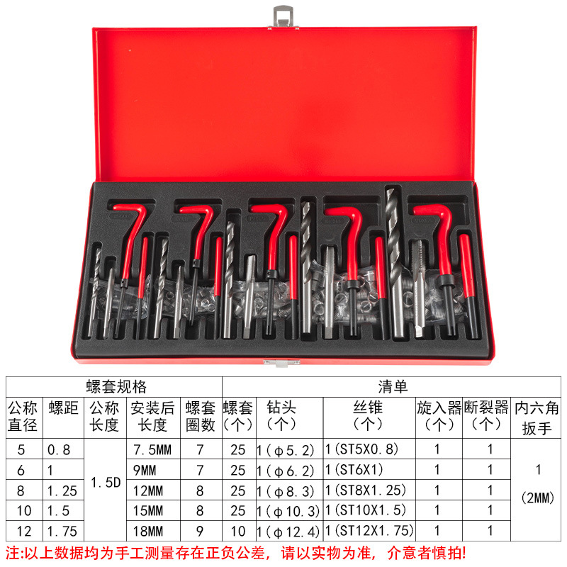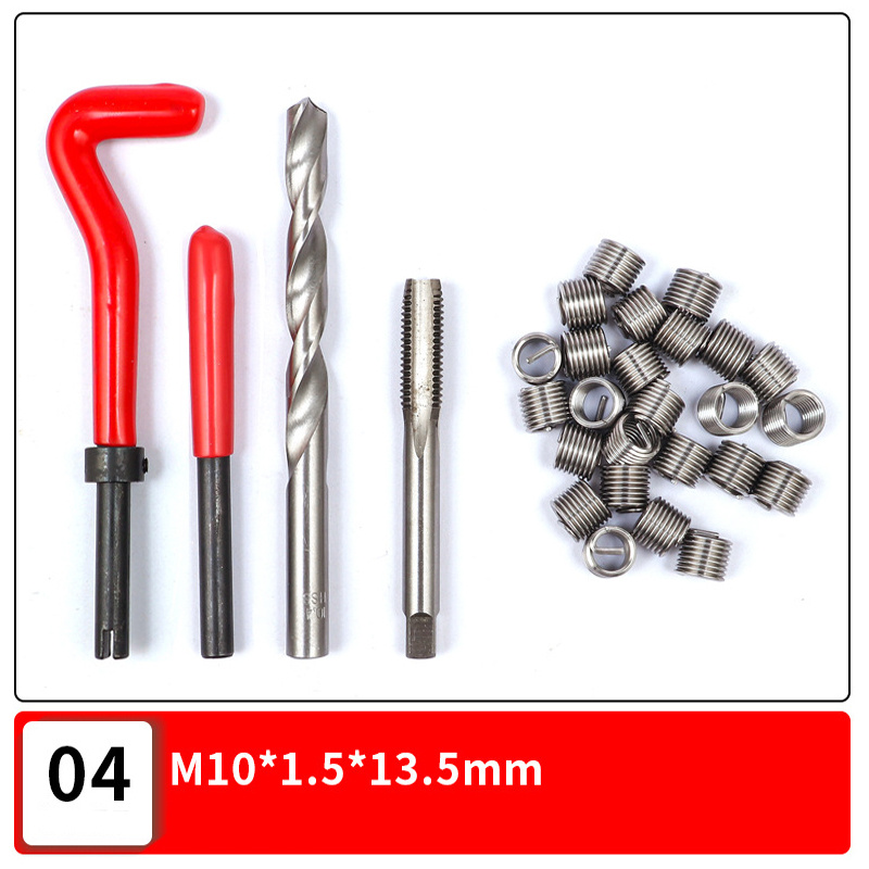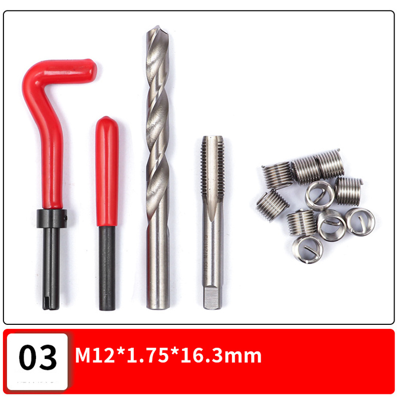 131pcs Thread Repair Tool Kit M5/M6/M8/M10/M12 Hand Tool for Restoring Damaged Thread Spanner Wrench Twist Drill BitFeatures - This thread repair kit is the perfect solution to a damaged or stripped tapped hole.Suitable for M5/M6/M8/M10/M12, creates a stronger internal thread in soft metals and protects tapped threads against wear and damage. - This repair kit includes insert installations, wire thread inserts, twist drill bits, thread taps, lug breaking tools.With package case, convenient to store and carry, you can easy and fast to collect and take out.Made of premium quality material, reliable and durable for a long time use.Specifications - Material: alloy steel. Wire thread inserts: M5, M6, M8, M10, M12(M50.8,M61.0,M81.25,M101.5,M12*1.75). - Package size: 38.5019.004.00cm. - Package weight: 2100g.Use Steps - Drill out damaged thread using correctly sized drill bit(supplied). - Tap re-drilled hole using tap supplied. - Load coiled insert into applicator. - Screw coil into casting. - Using lug breaking tool,break off tag on insert. - Thread is repaired and ready to use.Package Includes 5 x Insert Installations. 5 x Twist Drill Bits. 5 x Thread Taps. 5 x Break Pin Tools. 1 x Hex key. 25 x M5 Wire Thread Inserts. 25 x M6 Wire Thread Inserts. 25 x M8 Wire Thread Inserts. 25 x M10 Wire Thread Inserts. 10 x M12 Wire Thread Inserts. 1 x Storage Case.