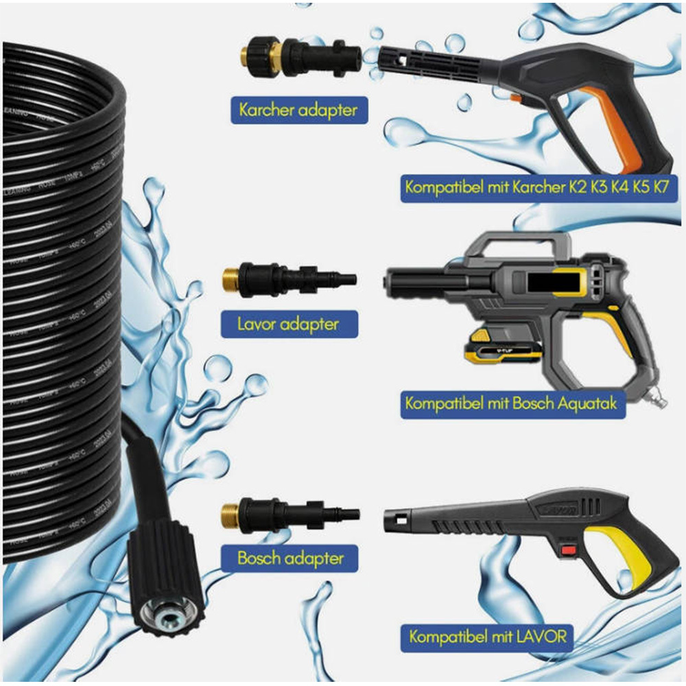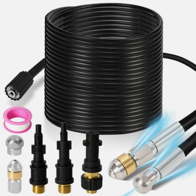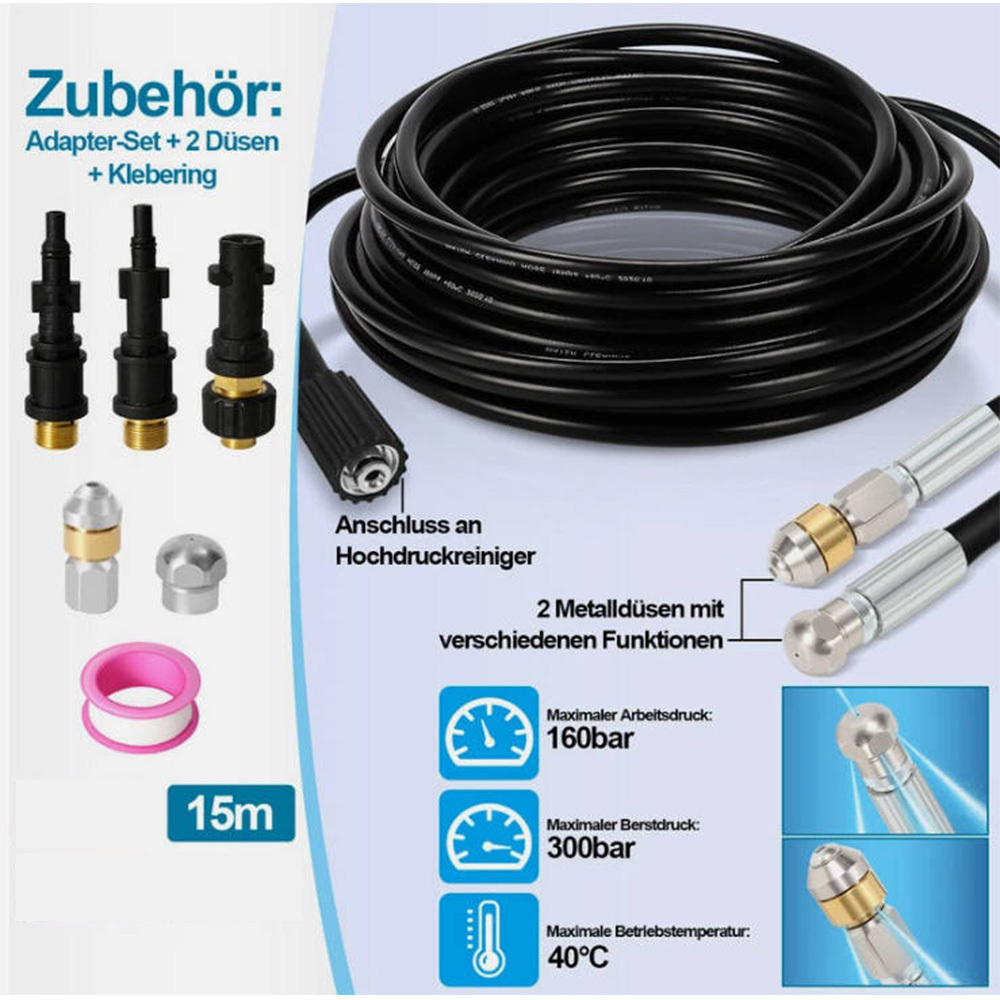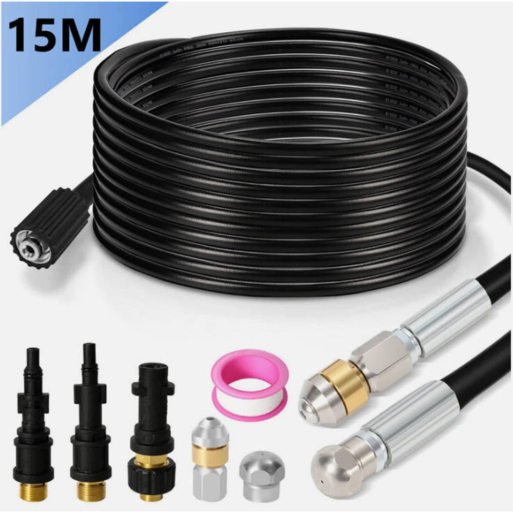 Product Name: 15m High Pressure Washer Pipe Cleaning Kit Description: · Set Includes: 1 Adapter + 2 Nozzles + 15m Extension Pipe· Universal Compatibility: Easily connects to most high pressure washers, including Karcher K2, K3, K4, K5, K7 series and other compatible models.· 2 Heavy-Duty Metal Nozzles for different cleaning functions.· Max Working Pressure: 160 bar.· Max Burst Pressure: 300 bar.· Max Working Temperature: 40°C.Key Features: · Powerful & Efficient Cleaning: Delivers up to 160 Bar working pressure, perfect for both indoor and outdoor use. Quickly blasts through clogged pipes, blocked drains, gutters, and downpipes with ease.· Push-Jet Drain Nozzle: Features a forward-facing jet to break up tough blockages. The rear-facing jets help clear debris and sediment as you feed the hose, ensuring a smooth clean.· High-Speed Rotating Drain Nozzle: Equipped with three rear-facing jets, creating a powerful spinning action that drills deep into clogged pipes, dissolving even the most stubborn obstructions.· Extremely Durable & Flexible: The inner tube is made of robust PE material, sheathed in a black, wear-resistant thermoplastic polyurethane (TPU) coating. Highly flexible and kink-resistant, designed with a bend to prevent water pooling.Multi-Purpose Applications: Ideal for a wide range of cleaning tasks: clogged pipes, drains, gutters, downspouts, toilets, outdoor patios, paving, garden furniture, agricultural pesticide application, floor cleaning, and more. Note: Must be connected to a high pressure washer to operate.· Convenient Storage: Includes 2 car mounts for easy hose reel storage, compatible with Karcher systems.· Dual Nozzle System: Tackle any job—use the Push-Jet nozzle for solid blockages and the Rotating nozzle for ingrained, tough grime in pipes.Technical Data: · Cleaning Hose Length: 15 m· Nozzle Orifice Size: 1.0 mm (Indexable)· Connection Size: 1/4" (6.35mm)· Hose Diameter: 10.3 mm· Max Working Pressure: 160 Bar· Burst Pressure: 300 Bar· Max Working Temperature: 40°C· Primary Material: Plastic (TPU Coated)· Color: BlackPackage Contents: · 1 x 15m High Pressure Cleaning Hose· 1 x Quick-Connect Adapter (Fits Karcher)· 2 x Nozzles (Push-Jet Drain Nozzle & Rotating Drain Nozzle)