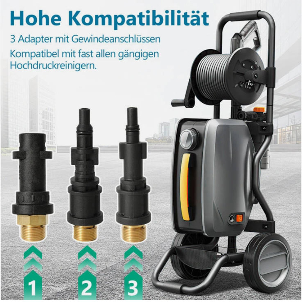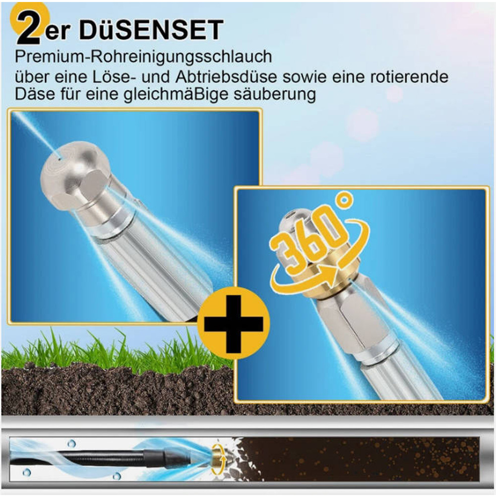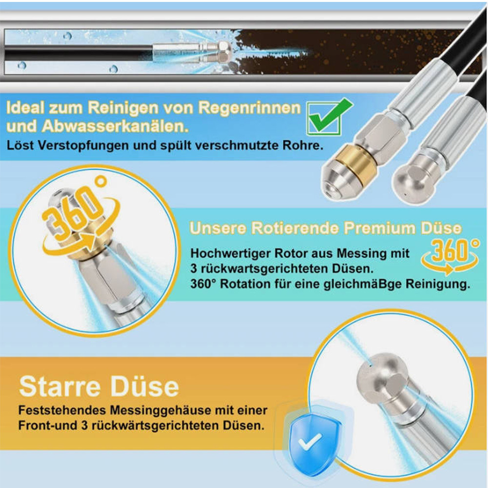 Product Name: 15m High Pressure Washer Pipe Cleaning Kit Description: · Set Includes: 1 Adapter + 2 Nozzles + 15m Extension Pipe· Universal Compatibility: Easily connects to most high pressure washers, including Karcher K2, K3, K4, K5, K7 series and other compatible models.· 2 Heavy-Duty Metal Nozzles for different cleaning functions.· Max Working Pressure: 160 bar.· Max Burst Pressure: 300 bar.· Max Working Temperature: 40°C.Key Features: · Powerful & Efficient Cleaning: Delivers up to 160 Bar working pressure, perfect for both indoor and outdoor use. Quickly blasts through clogged pipes, blocked drains, gutters, and downpipes with ease.· Push-Jet Drain Nozzle: Features a forward-facing jet to break up tough blockages. The rear-facing jets help clear debris and sediment as you feed the hose, ensuring a smooth clean.· High-Speed Rotating Drain Nozzle: Equipped with three rear-facing jets, creating a powerful spinning action that drills deep into clogged pipes, dissolving even the most stubborn obstructions.· Extremely Durable & Flexible: The inner tube is made of robust PE material, sheathed in a black, wear-resistant thermoplastic polyurethane (TPU) coating. Highly flexible and kink-resistant, designed with a bend to prevent water pooling.Multi-Purpose Applications: Ideal for a wide range of cleaning tasks: clogged pipes, drains, gutters, downspouts, toilets, outdoor patios, paving, garden furniture, agricultural pesticide application, floor cleaning, and more. Note: Must be connected to a high pressure washer to operate.· Convenient Storage: Includes 2 car mounts for easy hose reel storage, compatible with Karcher systems.· Dual Nozzle System: Tackle any job—use the Push-Jet nozzle for solid blockages and the Rotating nozzle for ingrained, tough grime in pipes.Technical Data: · Cleaning Hose Length: 15 m· Nozzle Orifice Size: 1.0 mm (Indexable)· Connection Size: 1/4" (6.35mm)· Hose Diameter: 10.3 mm· Max Working Pressure: 160 Bar· Burst Pressure: 300 Bar· Max Working Temperature: 40°C· Primary Material: Plastic (TPU Coated)· Color: BlackPackage Contents: · 1 x 15m High Pressure Cleaning Hose· 1 x Quick-Connect Adapter (Fits Karcher)· 2 x Nozzles (Push-Jet Drain Nozzle & Rotating Drain Nozzle)