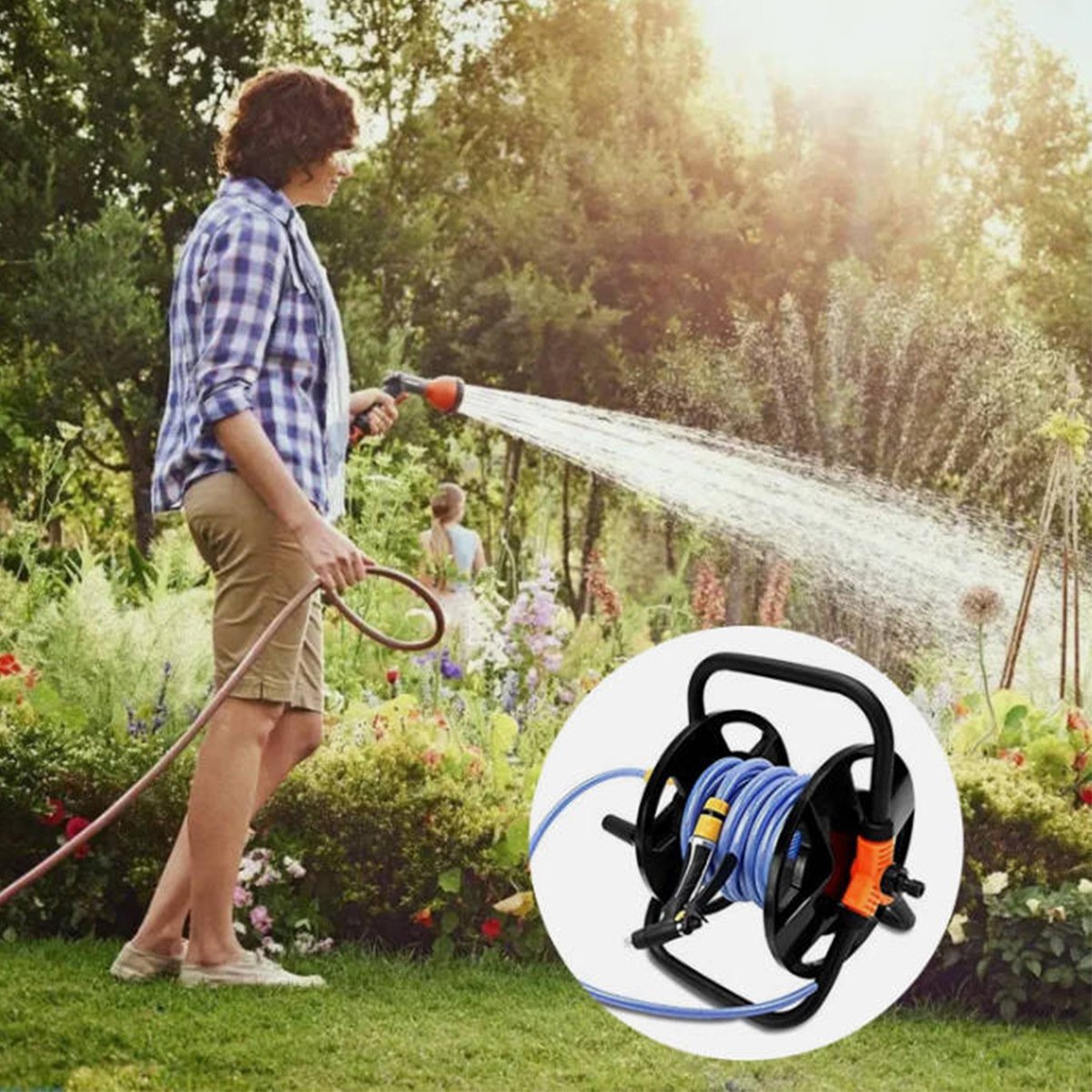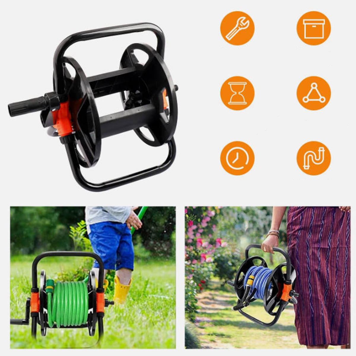 Garden Hose Reel**Product Description: ** - **Product Type: ** Hose Reel and Stand - ** Features: ** High quality, durable, portable, easy to use**Product Features: ** - **360° Rotatable Handle: ** Convenient operation - **Foldable Handle: ** Easy to store and carry - **Large Capacity: ** Can hold up to 20 meters of hose - **Solid Clamp: ** Ensures hose is securely fixed - ** Weight: ** 1.2 kg when storing 20m of hose**Applicable Scope: ** - Garden watering - Car cleaning - Household cleaning - Garden maintenance**Product Parameters: ** - ** Material: ** Durable plastic - ** Weight: ** Approximately 1.2 kg (when storing 20m of hose) - **Hose Length: ** Supports up to 20 meters (not included in the package) - ** Wheels: ** Anti-slip design**Package Includes: ** - Hose reel cart *1 - Various parts *1 (according to the parts list)**Assembly Instructions: **1. Assemble the stand and rotatable handle2. Fix the metal rods3. Combine and mount the hose outlet4. Installation is complete** Notes: ** - Please follow the instructions for assembly - Ensure all parts are correctly installed**Shipping Policy: ** - Shipped from our warehouse in Germany - Order processed within 24 hours after payment - Ship only to the address registered on your PayPal account - Local in Germany 1-2 working days, other European countries 5-8 working days**Returns Policy: ** - If you do not receive the goods within 8 working days, please contact us