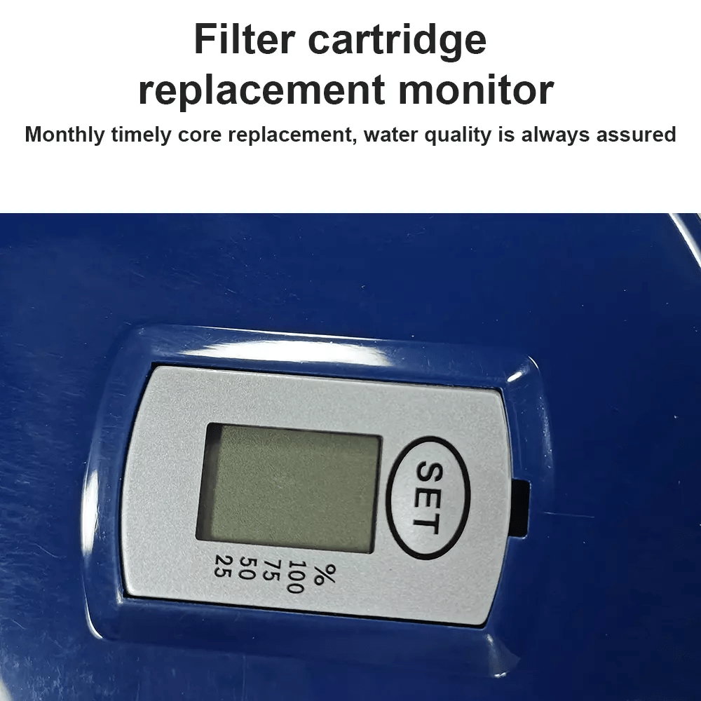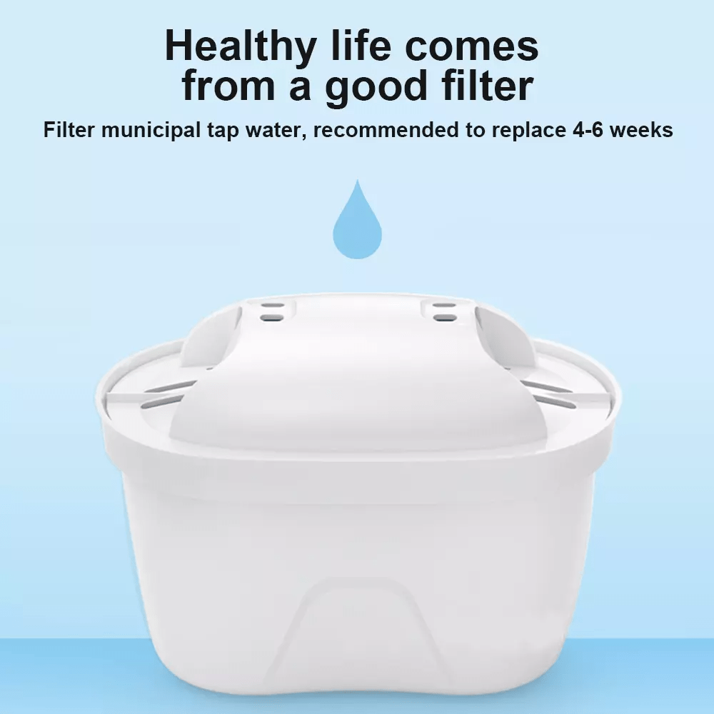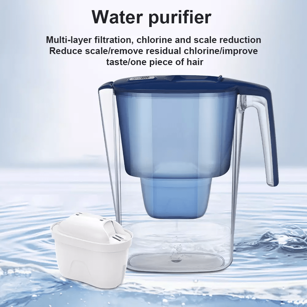 3.6 L Portable Water Filter Pitcher with Countdown DisplayProduct Overview• A countertop water-purifying kettle for home, office or travel. 4-stage filtration, replaceable cartridge, no installation required.Key Specifications• Total Pitcher Capacity: 3.6 L• Effective Filtration Volume: 2 L per batch• Filtration Flow Rate: 0.25 L / min• Cartridge Life: approx. 150 L total filtered water• Operating Temperature: 4 °C – 38 °C• Working Pressure: 0 – 0.1 MPa• Applicable Water Source: Municipal tap water• Recommended Cartridge Replacement: every 4 weeks (30 days)• Countdown Timer: press indicator blinks 3 times to confirm• Dimensions: 25.8 × 27.7 × 11 cm• Material: Food-grade PP, FDA certified4-Stage Filtration PP Cotton – removes sediment, rust, particles Granular Activated Carbon – reduces chlorine, odors, organics Ion-Exchange Resin – softens water, decreases limescale Post PP Cotton – fine filtration for better tastePackage Contents• 1 × Filter Pitcher• 1 × Cartridge (pre-installed)First-Time Use Instructions Rinse all detachable parts with clean water. Immerse the cartridge in water and shake gently several times. Assemble the pitcher and cartridge according to the manual. Fill, filter and discard the water 3 times to flush the cartridge. Start countdown: press repeat to turn the reminder off.