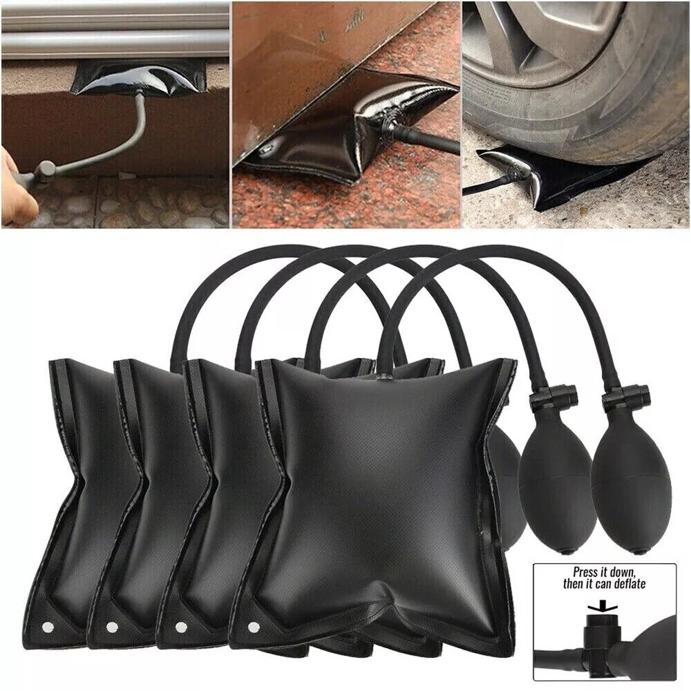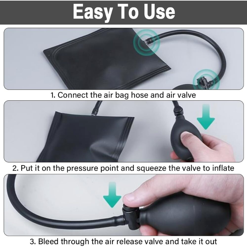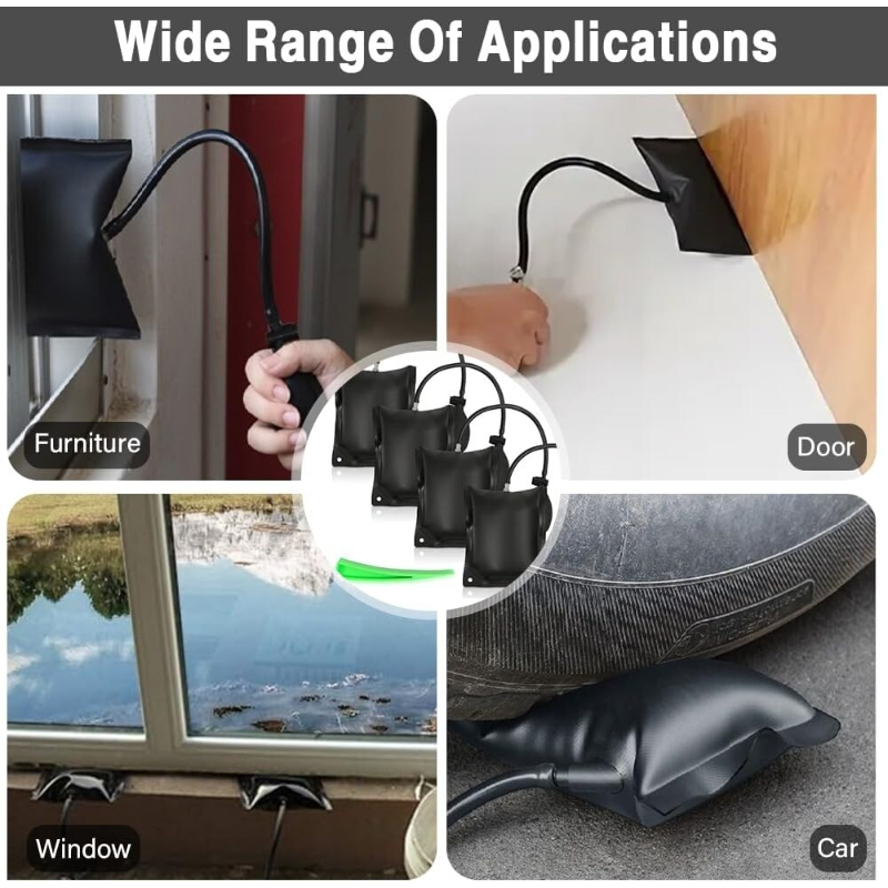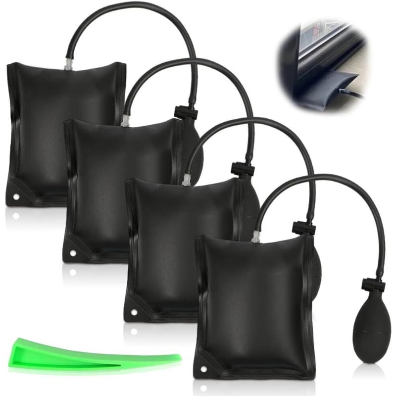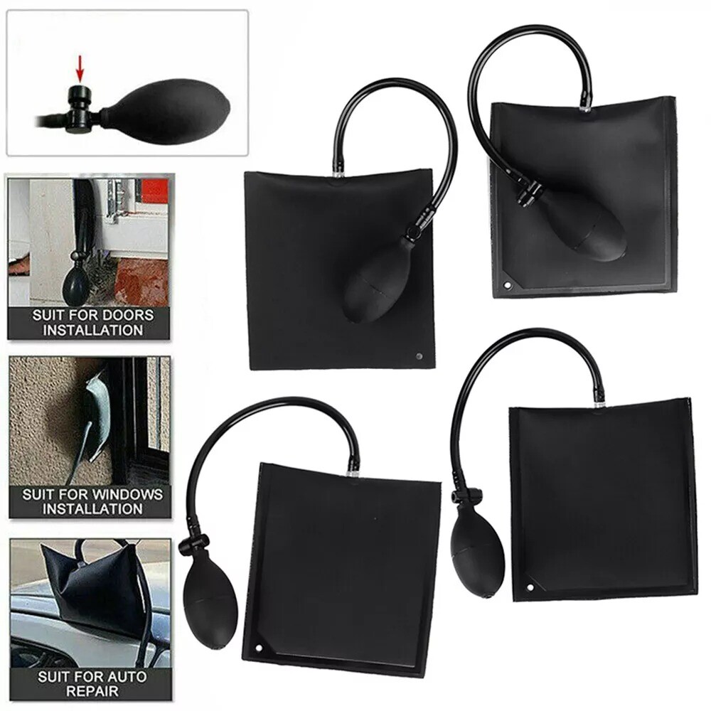 Product Features 100% Brand New and High Quality The product is brand new and of high quality, ensuring reliability and durability. Easy to Use, Saves Installation Time, and Reusable Simple design for easy operation, saves installation time, and can be reused multiple times. Airbag for Interior Door Installation Typically used as a spacer during interior door installation to ensure a smooth process. Effectively Prevents Window Frame Damage Designed to protect window frames from damage during installation. Creates Space for Unlocking Allows users to create space between the door and frame, enabling the use of tools to unlock the door via the internal unlocking button or lever. Anti-Slip Design Features a textured exterior to prevent slipping during use. Suitable for Between Car Door and Frame Ideal for use between car doors and door frames to ensure safe installation. Adjustable Spacing Spacing can be adjusted between 2-10 cm to meet different needs. Versatile Applications Suitable for home door and window improvements, positioning of car doors and windows, and more.Specifications Material: Polyurethane Rubber Color: Black Air Pump Dimensions: Approximately 17 x 15 cm (6.7 x 5.9 inches)Package Contents 4 x Installation Cushions