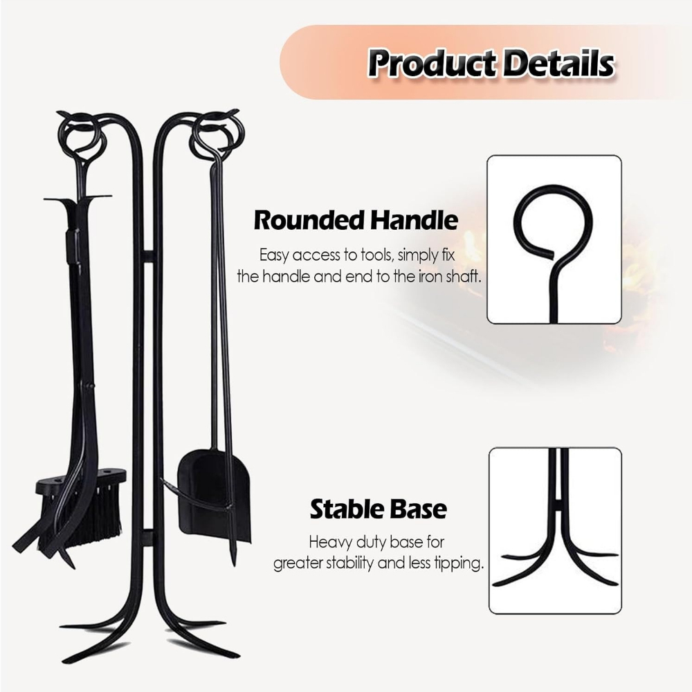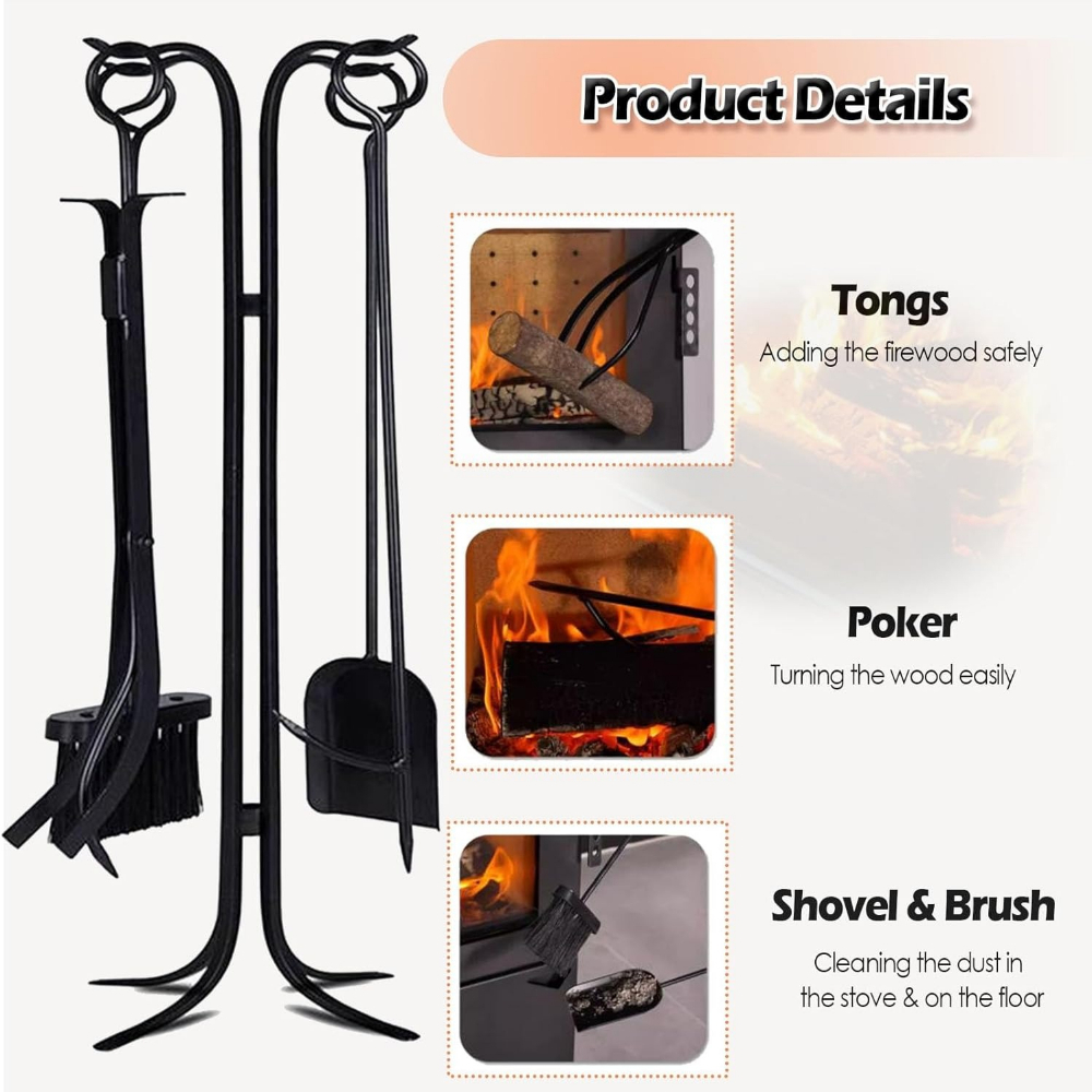5 - Piece Fireplace Tools SetProduct Introduction - The classic fireplace tool set includes a sturdy base, a pair of tongs, a shovel, a brush, and a poker. It serves as the perfect decor for any fireplace and looks aesthetic when placed on the hearth.Product Features - Sturdy Construction : The modern powder - coated, heavy - duty metal body of the stand and tools can easily withstand the heat of the fire. This ensures that the tools will last for years. - Easy Assembly : The set can be easily assembled in as little as 5 minutes, allowing you to have your tools standing next to the fireplace in no time. Once assembled, it doesn’t wobble. - Heavy - Duty Stand : The stable, weighted base keeps your tools sturdy and organized while saving space. Each piece is durably made of heat - resistant wrought iron, making it a mainstay by your fireplace. - Indoor and Outdoor Use : This sturdy fireplace tools set can serve your indoor / outdoor fireplace, stone stove, fire pit, or hearth for a long time.