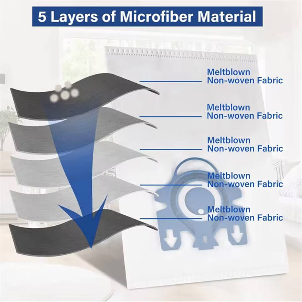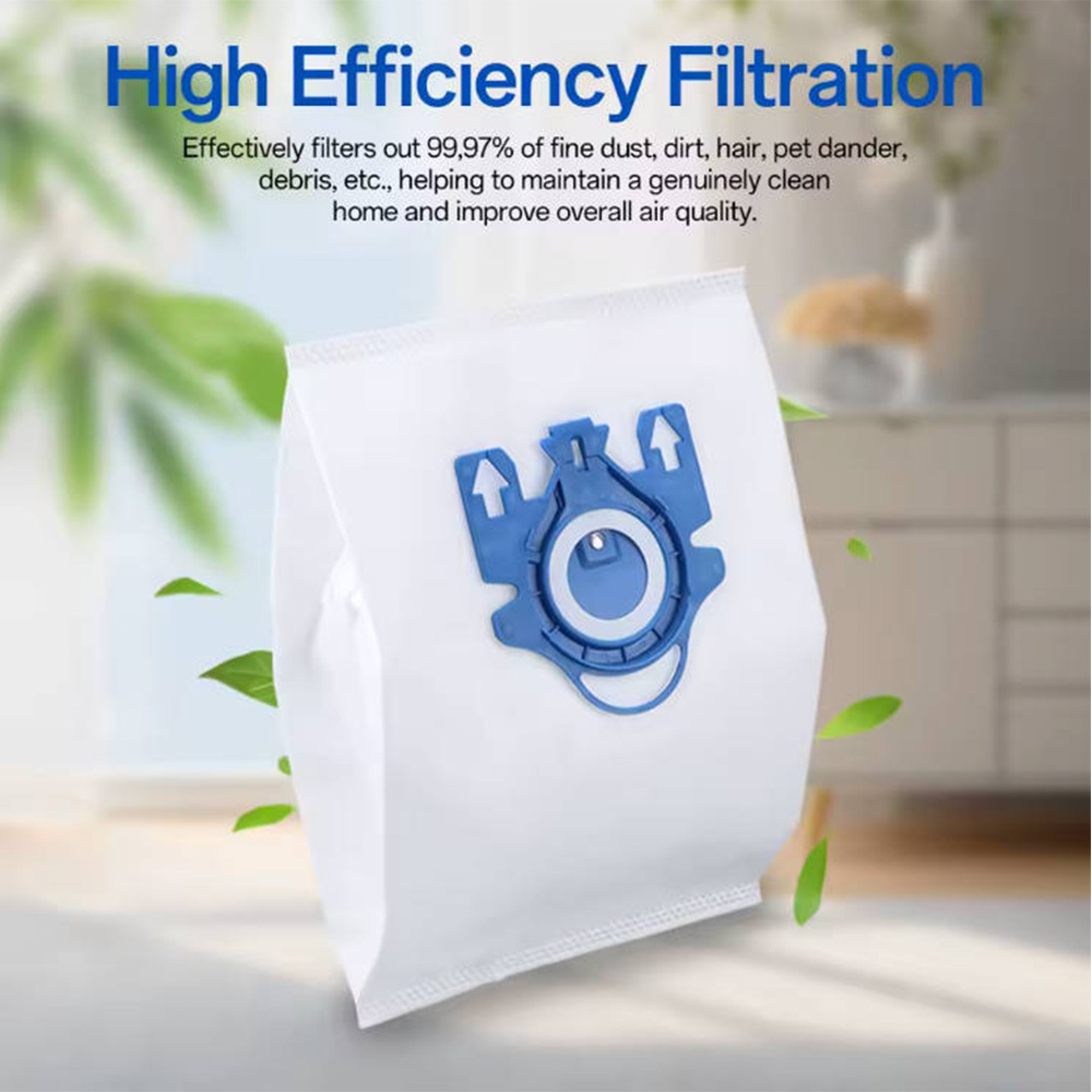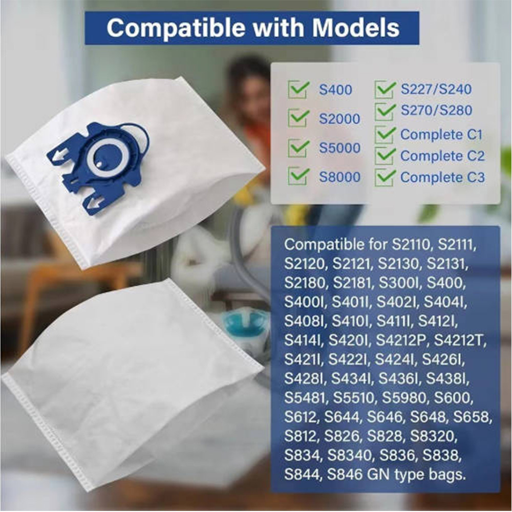 **Product Title: **5-Layer Microfiber Vacuum Cleaner Bags Compatible with GN Type Bags** Compatibility: ** - Compatible with models: S400, S2000, S5000, S8000, S227/S240, S270/S280, Complete C1, Complete C2, Complete C3 - Additional compatible models: S2110, S2111, S2120, S2121, S2130, S2131, S2180, S2181, S3001, S400, S4001, S4011, S4021, S4041, S4081, S4101, S4111, S4121, S4141, S4201, S4212P, S4212T, S4211, S4221, S4241, S4261, S4281, S4341, S4361, S4381, S5481, S5510, S5980, S600, S612, S644, S646, S648, S658, S812, S826, S828, S8320, S834, S8340, S836, S838, S844, S846 GN type bags.**Product Features: ** - 5-layer filtration for maximum dust retention. - High moisture resistance and tear strength. - Ultrafiltration for cleaner air by trapping allergens and fine particles. - Motor protection filters included, adjustable to fit your needs.**Package Includes: ** - 20 Microfiber Vacuum Cleaner Bags - 4 Motor Protection Filters**Product Specifications: ** - Material: High-quality special microfiber, 5 layers** Description: **These 5-layer microfiber vacuum cleaner bags are designed as an alternative to the original GN HyClean 3D Efficiency bags. They ensure high filtration, protect your vacuum cleaner by reducing the risk of motor and HEPA filter clogging, and are compatible with models that use the replacement part number 10408410. The bags offer high stability, better moisture resistance, and tear strength, ensuring longer and more effective suction power. The high air permeability of the material ensures that the vacuum cleaner's suction performance is maintained even at the suction nozzle. The special layer structure of the material significantly reduces the risk of bag clogging and loss of suction power compared to paper bags.