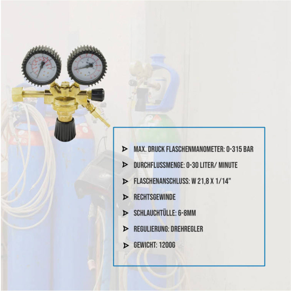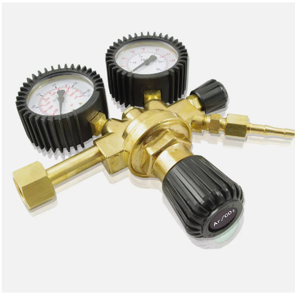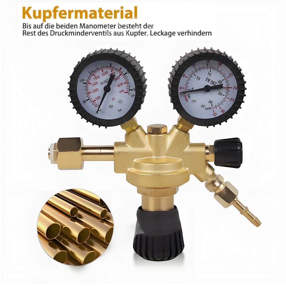 **Product Description: ** - ** Type: ** Pressure Regulator - ** Material: ** Metal - ** Color: ** As shown in the image - ** Usage: ** Suitable for Argon and Carbon Dioxide - **Maximum Pressure Gauge: ** 0-315 bar - **Flow Rate: ** 0-30 Liters/Minute - **Dial Diameter: ** Approximately 6.5cm - **Bottle Connection: ** W 21.8 x 1/14" - German Standard - ** Regulation: ** Rotary Control - ** Weight: ** Approximately 1285g** Features: ** - High-quality brass housing with a compact design, ideal for installation. - Robust pressure gauge with a coated or rubberized exterior and a clear white scale on the bottom. - Pressure gauges are protected with rubber caps, shock-resistant and anti-fall. - The pressure reducer has a German standard connection, W 21.8 x 1/14". Two gauges, one for bottle pressure and one for outlet pressure. - Reduces and regulates gas pressure for welding work. Maximum bottle pressure gauge: 0-315 bar, flow rate: 0-30 Liters/Minute. - Regulation on the pressure reducer is done with a rotary control. - Suitable for MIG, MAG, and TIG applications. Suitable for many gases, such as Argon, CO2. - A professional tool for commercial or temporary use. Compact and lightweight, easy to carry.** Note: **Please allow for a slight manual measurement deviation for the data. Thank you for your understanding.**Package Includes: **1 x Argon/CO2 Pressure Regulator