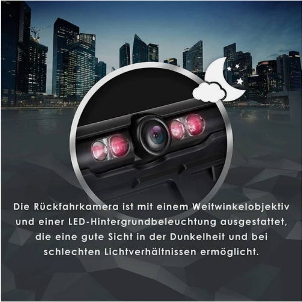 Night VisionKey Features - Color: Black - Material: ABS - Dimensions: approx. 530 × 125 × 15 mm - Power: 3 W - Operating Voltage: 12 V DC - Lens Diameter: 25 mm (as shown in file 2) - Total Lens Length: 525 mm (as shown in file 2) - IP68 waterproof compatible with car DVD, VCD, camera, STB, satellite receiver, etc. - Operating temperature: -30 °C to +80 °C - Plug-and-play installation—no alteration to factory system or lookTechnical Specifications Image Sensor: 1/4" color CMOS Effective Pixels: 928 × 500 Horizontal Resolution: 500 TV lines Viewing Angle: 170° diagonal Video Output: RCA or 2-pin aviation connector, 1.0 Vp-p, 75 Ω Supply Current: ≥ 80 mA at 12 V DC White Balance: Auto Waterproof Rating: IP68 Shockproof: Yes Night Vision Distance: 0–3 mPackage Contents 1 × Frame-style backup camera with bracket 1 × 2.4 GHz wireless transmitter 1 × English user manual