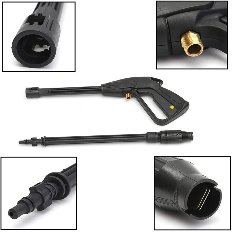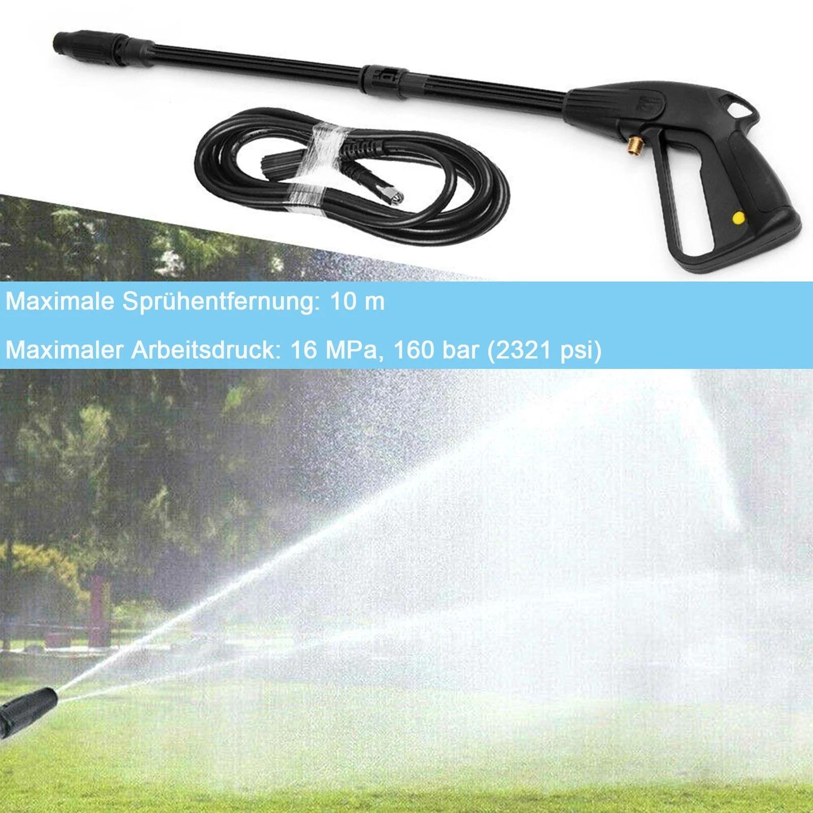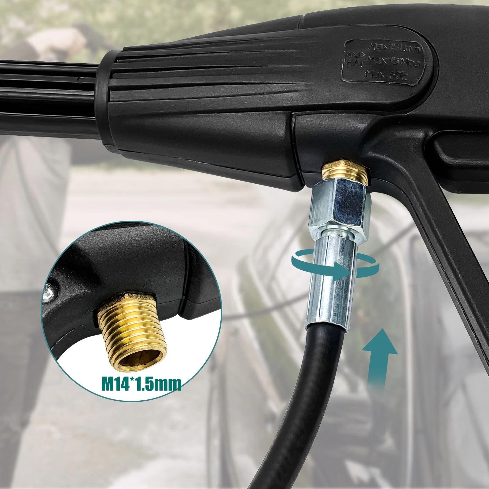 Car Washer Spray Gun Lance Nozzle High Pressure Washer Jet Water Gun Wand Tip Car Clean Pressure Gun for Champion Hammer CrosserProduct Name: High-Pressure Lance, Rotary Nozzle, and Hose Set for Kärcher 160Bar Pressure Washer Features: - 100% brand new and high quality. - Made from high-quality technical plastic and copper, wear-resistant and aging-resistant. - Suitable for high-pressure cleaners up to 160 bar. - Easy to use, a premium tool for everyday cleaning. - M14 inner thread connection for the spray gun, M22 inner thread connection for the pressure washer. - Suitable for cleaning cars, mechanical equipment, floors, walls, etc. - Includes a 5-meter high-pressure hose for flexible cleaning. Specifications: High-Pressure Water Gun Specifications: - Material: Technical plastic and copper - Color: Black - Maximum temperature: 60°C - Maximum operating pressure: 15 MPa, 150 bar (2200 psi) (for cold water use only) - Maximum flow rate: 3.96 GPM - Thread: M14Adjustable 47cm Nozzle Spray Lance Specifications: - Maximum temperature: 60°C - Maximum operating pressure: 16 MPa, 160 bar (2321 psi) - Spray pattern: 0~60 degrees46cm Nozzle Spray Lance Specifications: - Maximum temperature: 60°C - Maximum operating pressure: 14 MPa, 140 bar (2030 psi)Hose Specifications: - Inner diameter: 6 mm - Outer diameter: 11 mm - Maximum pressure: 18 MPa, 2620 PSI - Power source: High-pressure cleaner - Hose material: PVC and polyester - Maximum spray distance: 10 meters Compatibility: Works with most high-pressure cleaners with M22--14mm connections.Package Includes: - 1 × High-Pressure Water Gun - 1 × Rotatable 47cm Nozzle Spray Lance - 1 × Adjustable 46cm Nozzle Spray Lance - 1 × 5-meter High-Pressure Hose Note: - This product is manually measured and may have a small margin of error. Please understand.
