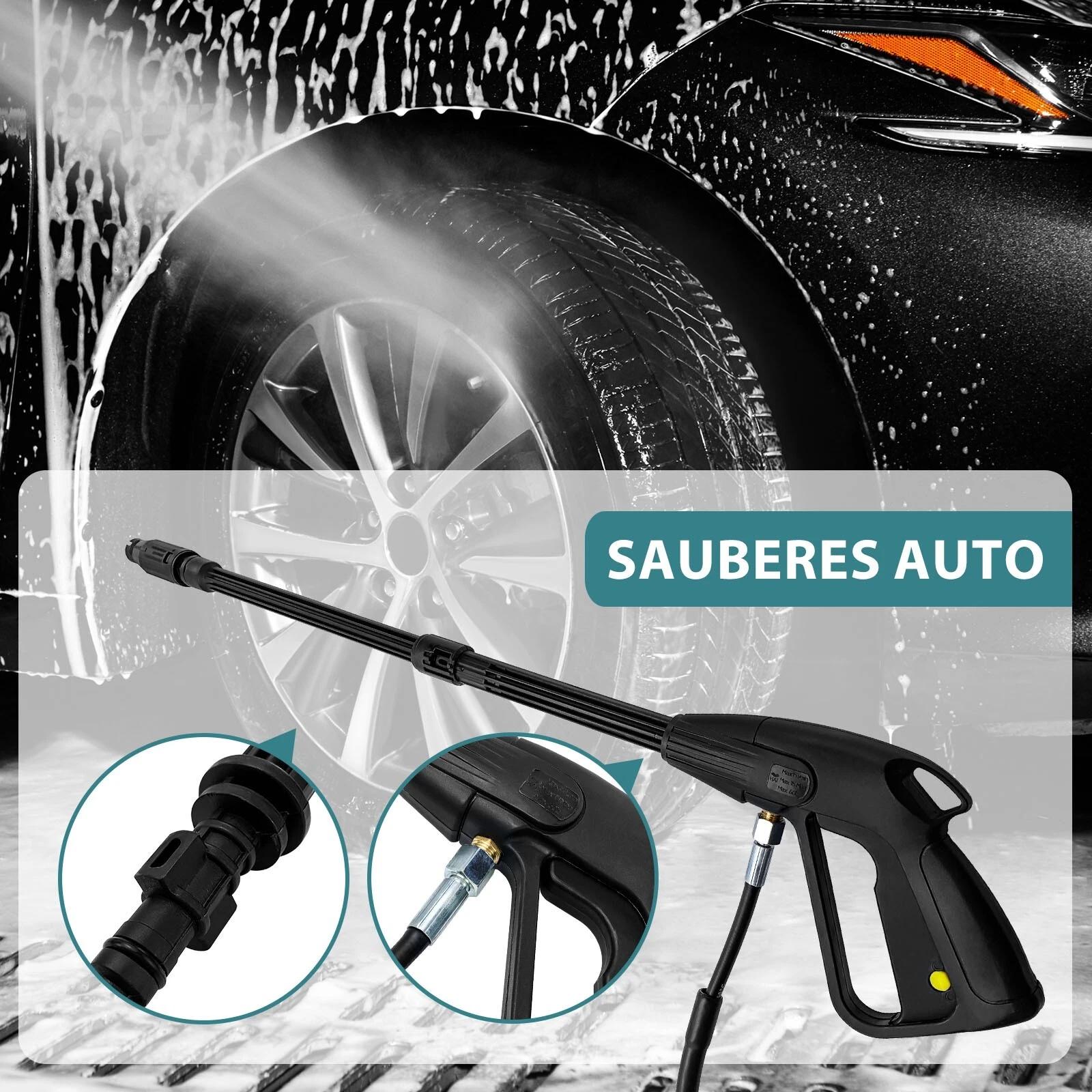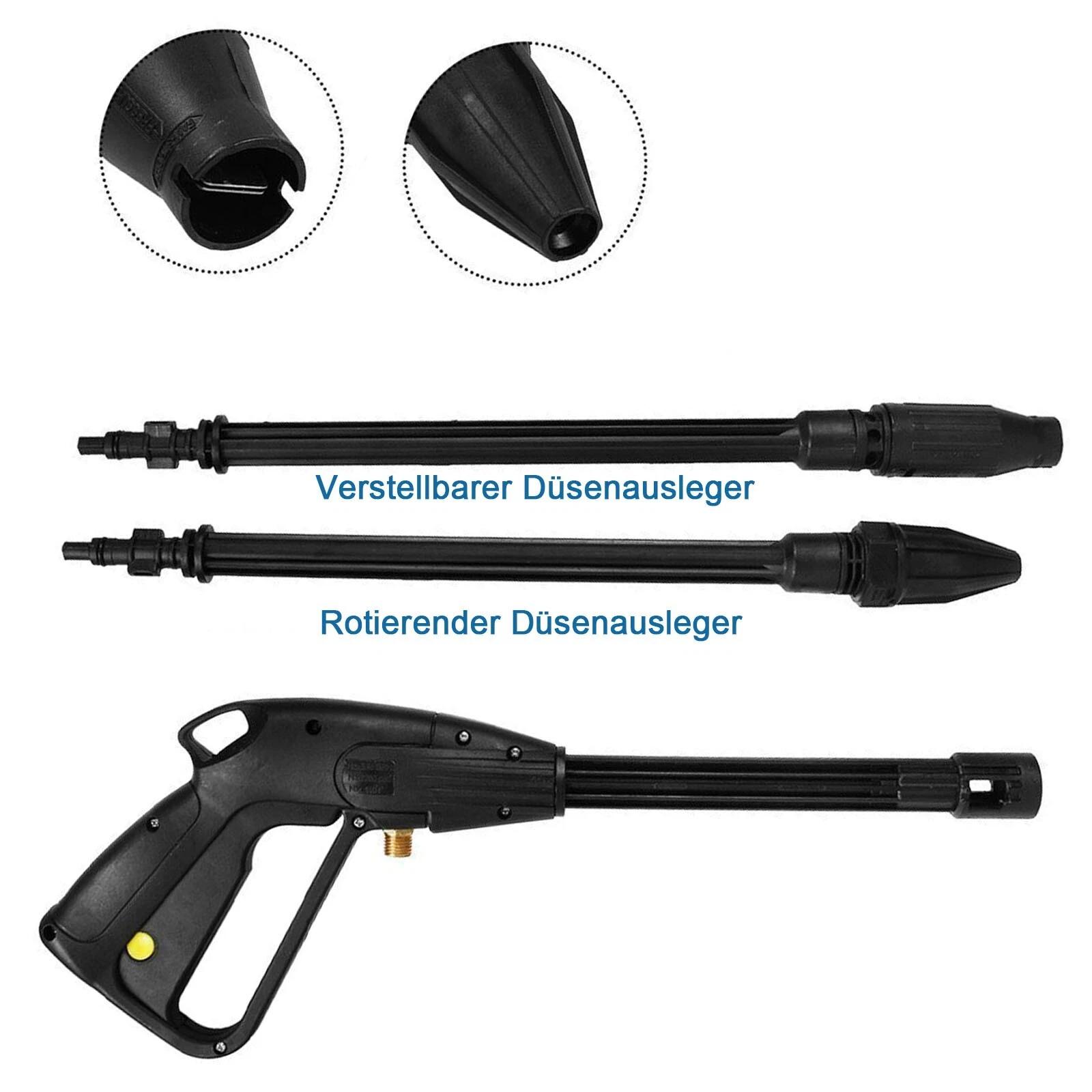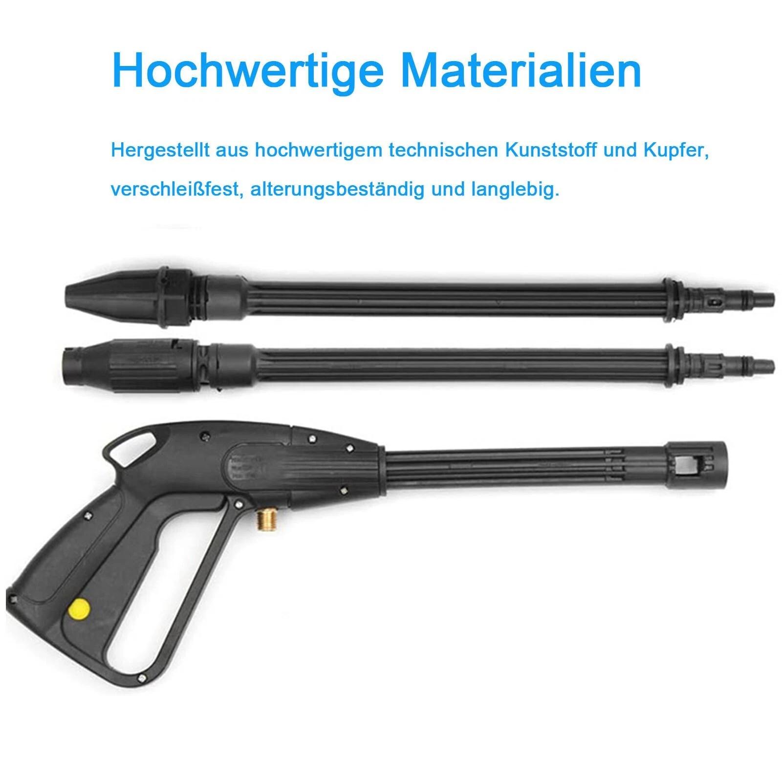 Car Washer Spray Gun Lance Nozzle High Pressure Washer Jet Water Gun Wand Tip Car Clean Pressure Gun for Champion Hammer CrosserProduct Name: High-Pressure Lance, Rotary Nozzle, and Hose Set for Kärcher 160Bar Pressure Washer Features: - 100% brand new and high quality. - Made from high-quality technical plastic and copper, wear-resistant and aging-resistant. - Suitable for high-pressure cleaners up to 160 bar. - Easy to use, a premium tool for everyday cleaning. - M14 inner thread connection for the spray gun, M22 inner thread connection for the pressure washer. - Suitable for cleaning cars, mechanical equipment, floors, walls, etc. - Includes a 5-meter high-pressure hose for flexible cleaning. Specifications: High-Pressure Water Gun Specifications: - Material: Technical plastic and copper - Color: Black - Maximum temperature: 60°C - Maximum operating pressure: 15 MPa, 150 bar (2200 psi) (for cold water use only) - Maximum flow rate: 3.96 GPM - Thread: M14Adjustable 47cm Nozzle Spray Lance Specifications: - Maximum temperature: 60°C - Maximum operating pressure: 16 MPa, 160 bar (2321 psi) - Spray pattern: 0~60 degrees46cm Nozzle Spray Lance Specifications: - Maximum temperature: 60°C - Maximum operating pressure: 14 MPa, 140 bar (2030 psi)Hose Specifications: - Inner diameter: 6 mm - Outer diameter: 11 mm - Maximum pressure: 18 MPa, 2620 PSI - Power source: High-pressure cleaner - Hose material: PVC and polyester - Maximum spray distance: 10 meters Compatibility: Works with most high-pressure cleaners with M22--14mm connections.Package Includes: - 1 × High-Pressure Water Gun - 1 × Rotatable 47cm Nozzle Spray Lance - 1 × Adjustable 46cm Nozzle Spray Lance - 1 × 5-meter High-Pressure Hose Note: - This product is manually measured and may have a small margin of error. Please understand.