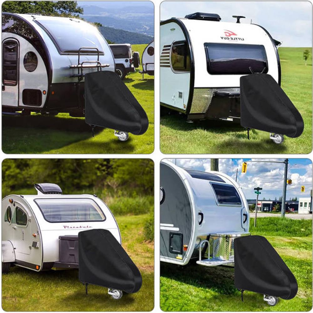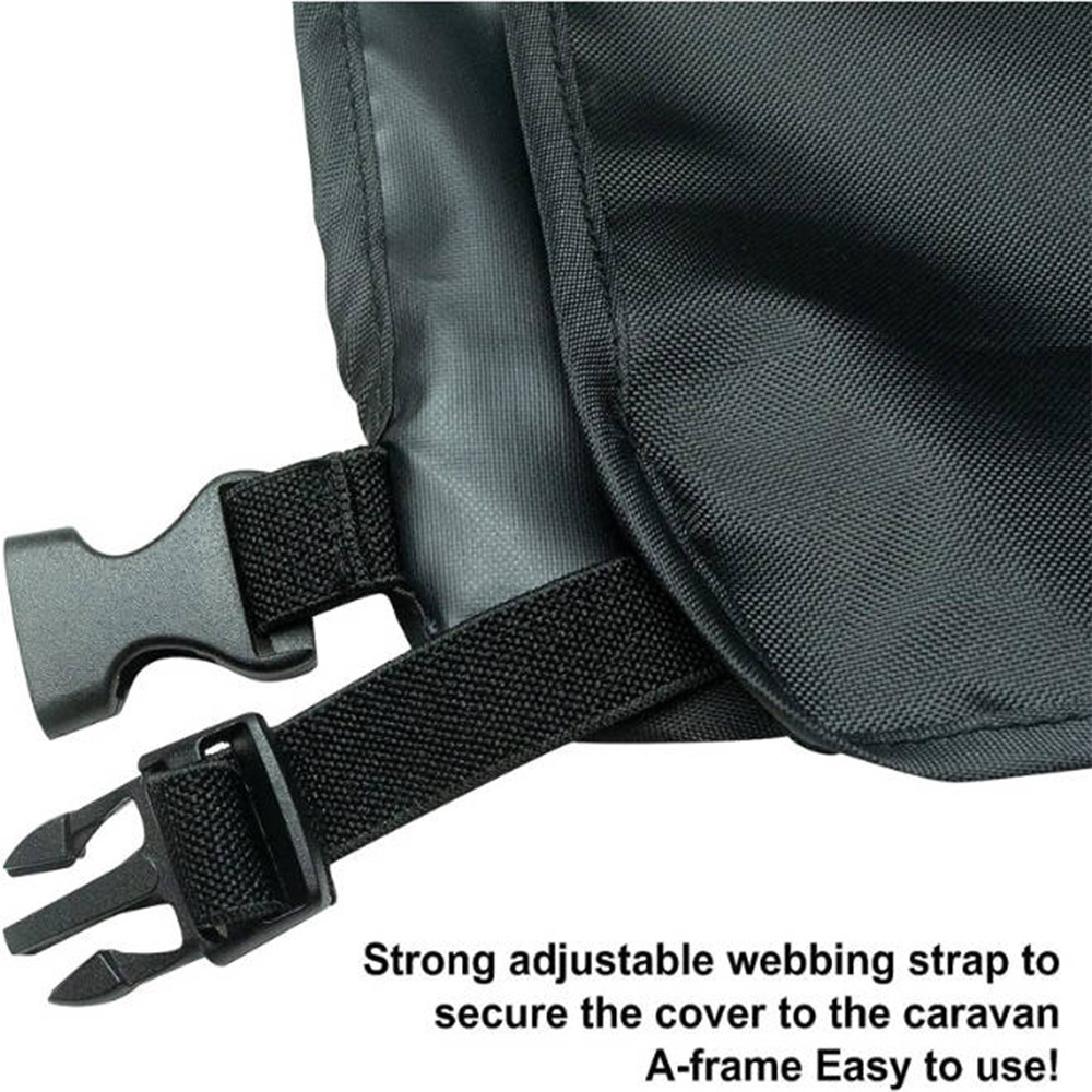 **Caravan Tow Hitch Cover - All-Season Protection****Product Overview: ** - **Premium Material: ** Made from a 3-layer truck canvas material, consisting of two PVC layers and a reinforced mesh, ensuring maximum protection throughout the year. - **Double Lock: ** Equipped with two high-quality plastic snap locks for extra security and stability. - ** Durable: ** Double-layer material with reinforced mesh and UV-resistant hems increase the lifespan of the cover.**Product Details: ** - ** Material: ** 600D Heavy Duty Oxford Cloth - ** Color: ** Black - ** Size: ** 95cm x 60cm x 15cm - ** Features: ** - UV Protection - Wind Proof - Snow Proof - ** Design: ** - Strong adjustable webbing strap for secure attachment - High visibility for safety - Full protection for hitch and support wheel - Easy to use and maintain**Benefits at a Glance: ** - Long-lasting due to robust and reinforced PVC canvas material - Completely weatherproof, frost-resistant, and UV-resistant - Extra-large, practical, and universal design - All-in-one protection for electronics, support wheel, and hitch system - Easy application and care for long-term use - Optimal fit with a pocket shape and integrated center beam - Universal suitability for pole hitches and Y-hitches**Universal Fit: ** Suitable for various trailers and caravans from manufacturers like Stema, Böckmann, Humbaur, Hobby, Knaus, Brüstner, and more.**Order Now and Protect Your Caravan or Trailer Hitch from Weather Influences!**
