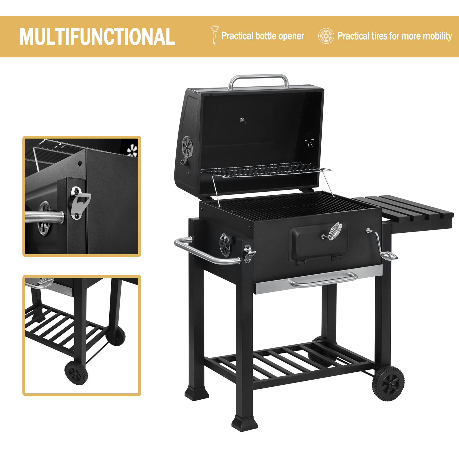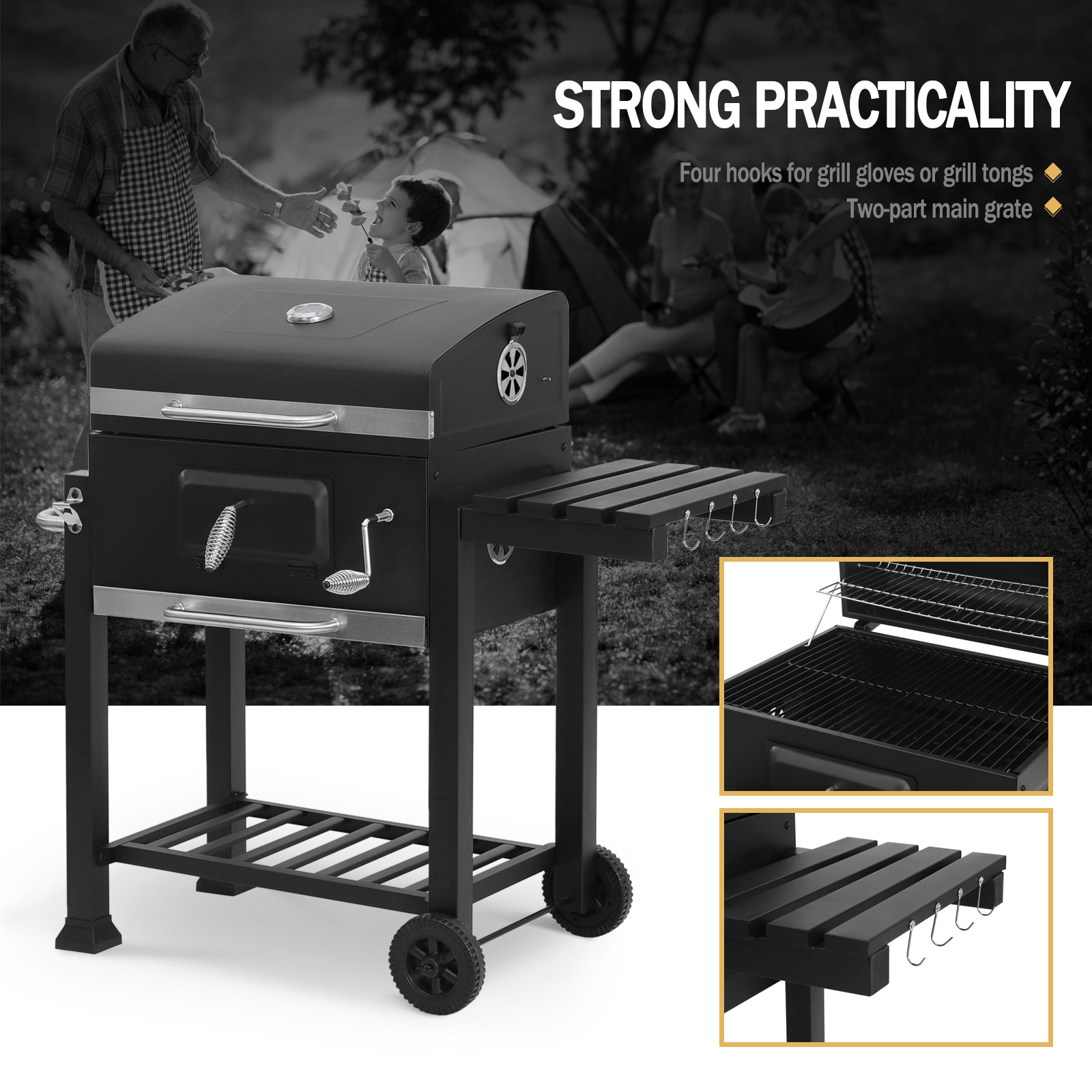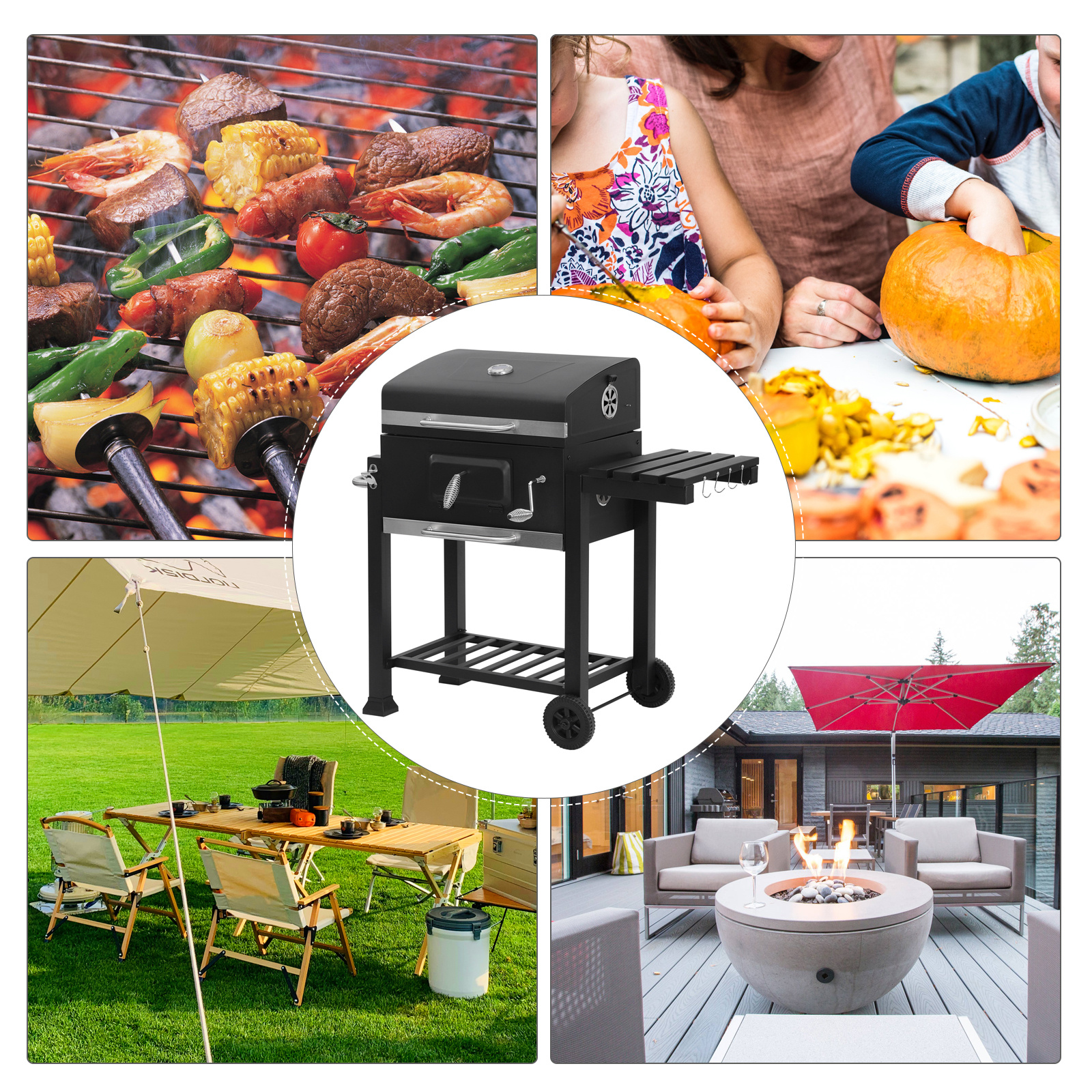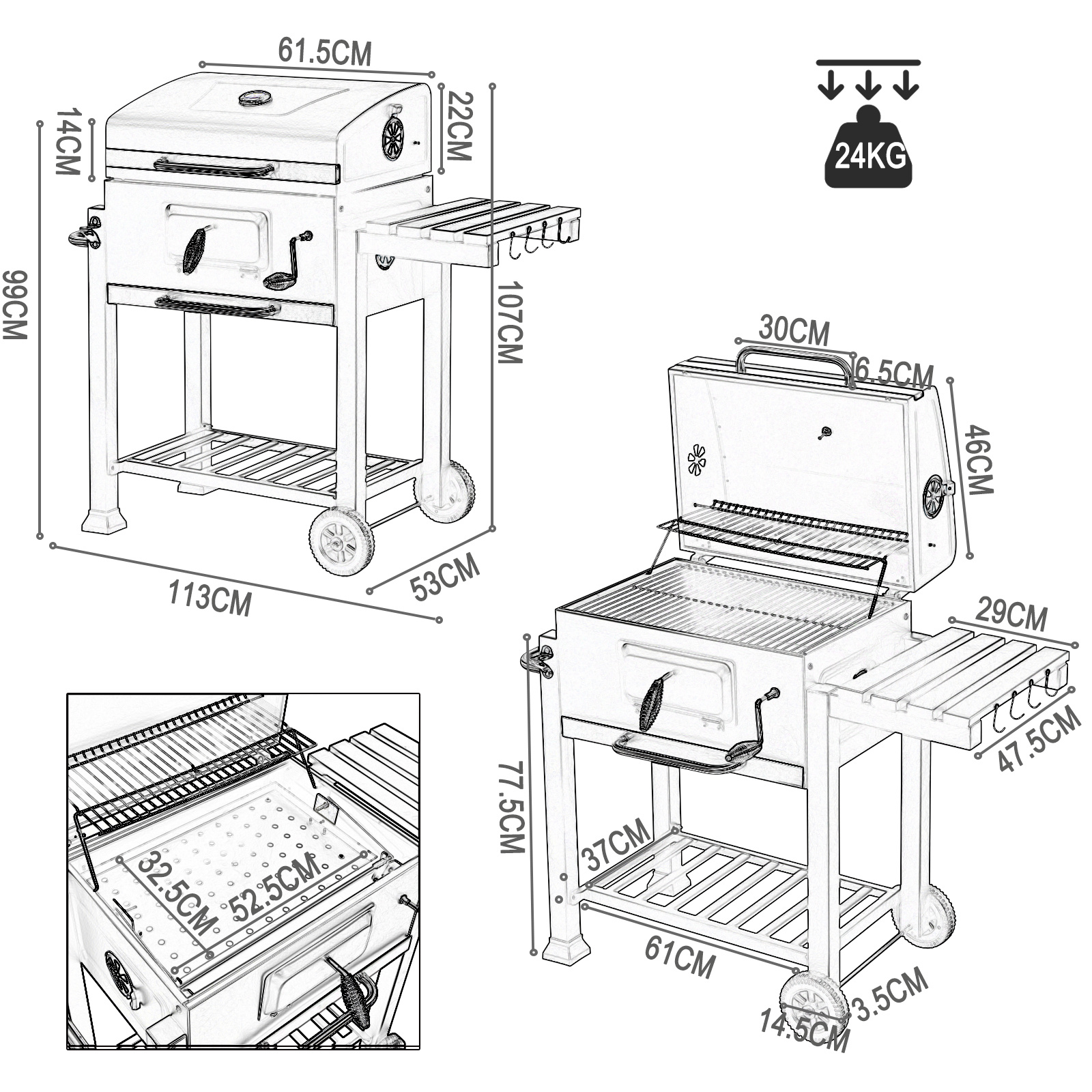Charcoal Grill - Height-Adjustable Grill with Wheels, Suitable for Garden, Camping, and Picnics Features: Height-Adjustable Charcoal Grill: Equipped with practical wheels and a side handle, making it extremely mobile and easy to move. Adjustable Height: The height of the charcoal grill can be easily adjusted with a crank, allowing you to set your desired grilling temperature. Four Hooks Included: Four practical hooks are attached to the side shelf for storing grill tongs or other barbecue tools. Lid with Temperature Gauge: The built-in thermometer allows you to easily monitor and accurately assess the temperature inside the grill. Ideal for Family and Friends: The grill surface measures approximately 28×41.7 cm (2 pieces), with warming measures of about 53×32 cm, perfect for barbecuing with family and friends.Technical Specifications: Material: Steel Main Body Material: Steel Adult Assembly Required: Yes Number of Grills: 2 Grill Surface: Approx. 28×41.7 cm Weight: 26.5 kgPackage Includes: 1 × Charcoal Grill 1 × Instruction Manual Notes: All dimensions are manually measured and may have an error of 2-3 cm. The actual color of the product may vary slightly from the images shown due to different monitor and resolution settings. Decorative items are not included in the package.