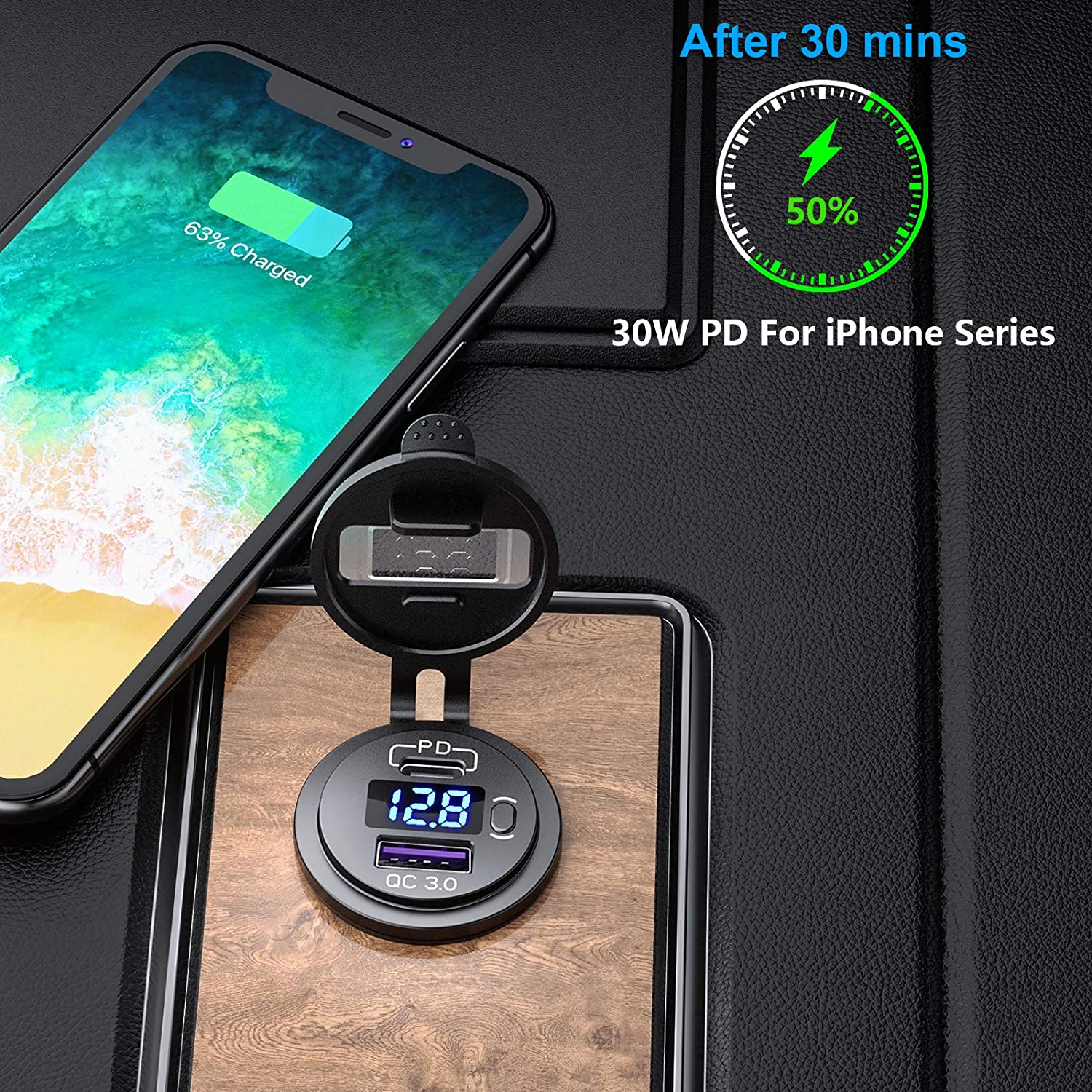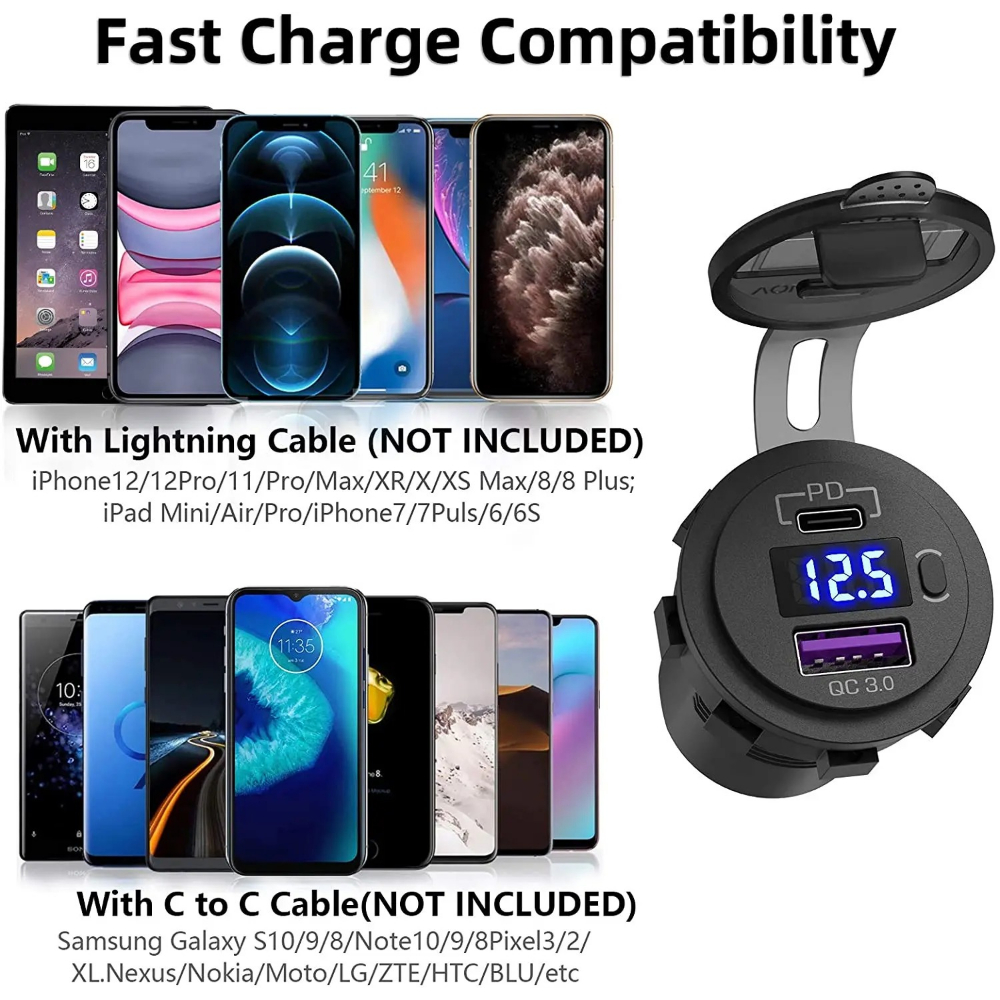 DaierTek 12V 48W USB Charger Outlet Waterproof Charger Socket PD Type C and QC3.0 USB Port USB Socket for Car Boat Marine Truck Description: Latest 12V USB Socket: The 12V USB charger features a 20W PD Type-C port, two 18W QC 3.0 USB charging ports, a digital voltmeter display, and a touch switch. USB-C 20W PD 3.0: The car USB-C charger with fast charging capability provides 20W output for 12V vehicles through a Type-C port. Dual QC 3.0 Ports: The 12V USB socket is equipped with two QC 3.0 USB ports to charge two devices simultaneously. Total output power is 36W, offering 4x faster charging speed for compatible devices. LED Voltmeter and Touch Switch: The USB car charger with a blue LED digital voltmeter helps monitor your vehicle's battery and check its status while driving. It includes a switch for the dual car charger adapter. Turn it off when not in use to save your vehicle's battery power. Dust Cover: It comes with a rubber protective cap that is dustproof and waterproof, effectively protecting the internal circuit and extending its lifespan. Wide Application: Suitable for 12V/24V cars, trucks, boats, marine vehicles, golf carts, RVs, ATVs/UTVs, etc. Compatible with all USB devices such as mobile phones, tablets, MP3/MP4, GPS, cameras, etc. Specifications: Type: Car Charger Color: Black Number of Ports: 3 Installation Method: Drill hole Voltage: 12V-24V Ports: Dual USB, USB-C (PD) Compatible Brand: Universal Input: USB 12-24V Output: PD & QC 3.0 PD Output Power: 55W QC 3.0 Output Power: 36W Measured Voltage Range: 6-32V Installation Location: Cigarette lighter, dashboard Features: Fast charging, lightweight, QC 3.0 fast charge port, on/off switch, dust cover, Type-C PD port, voltmeter monitoring Application: 12V/24V cars, trucks, boats, marine vehicles, golf carts, RVs, ATVs/UTVs, etc.Package Included: 1 × 12V Car Charger with Voltmeter 1 × 60cm Cable with 10A Inline FuseHow to Use: Drill a hole with a diameter of approximately 3cm. Insert the socket and screw it in place. Connect the "+" red wire to the positive terminal of the battery and the "-" black wire to the negative terminal. Installation is complete.Compatible Models: PD Port: iPad Pro 12.9", iPad Pro 11", iPad Pro 10.5", iPad 10.2", iPad Air 10.5", iPad mini 7.9 iPhone 15/14/13 Pro Max/12/12 Mini/12 Pro/12 Max/11 Pro/11 Pro Max Galaxy S22/21/20 Google Pixel 6/