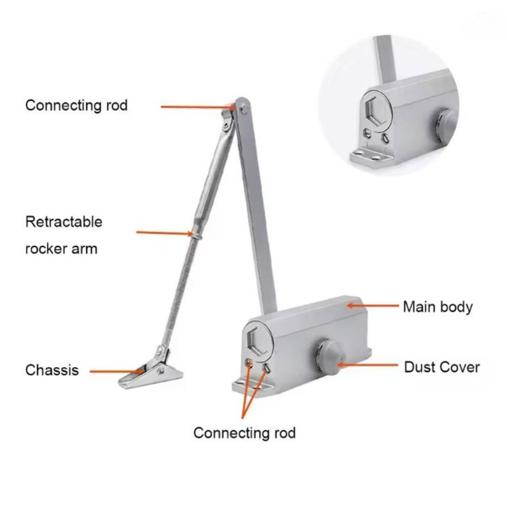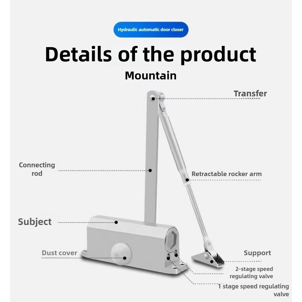 Product Name: Hydraulic Automatic Door Closer**Product Features: - Aluminum Alloy Material - Wear Resistant and Durable - Not Easy to Leak Oil - Not Easy to Rust - Adjustable Closing Speed - Simple Installation - Light Volume Closing - Easy to Push the Door**Product Advantages: - Passed Long-term Opening and Closing Test Selected Aluminum Alloy Body, Equipped with High-quality Accessories - Wear Resistant and Not Easy to Leak Oil**Excellence in Performance: - High-efficiency gear system ensures smooth door closing experience**Large Size Specifications: - Load Capacity: 80kg - Material: Aluminum Alloy - Suitable Door Weight: 65kg/85kg - Closing Speed: Adjustable within 180°-15° range - Locking Speed: Adjustable within 15°-0° range - Suitable Environment: Suitable for -20-50 environment - Size: Large**Precision Construction: - Stable Piston Cylinder and Spring - Selected materials matching the gear shaft ensure stable operation, using high-strength spring steel with good resistance to backfire stability.** Notes: - Before installing the door closer, do not rotate the central axis 180°, otherwise it will damage the door closer, making it unusable.**Package Contents: - 1x Door Closer (based on ) - Screws - Cover Cap - Illustrated instruction manual with drilling template---