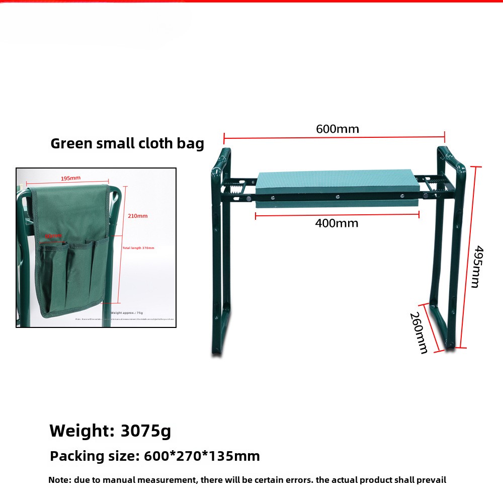 Foldable Garden Kneeler and Seat with Tool Bag Gardening Bench EVA Foam Pad Garden Kneeler Seat Gardening Gifts for Women MenProduct Details - Type: Garden Kneeler - Material: Iron Pipe + EVA Cushion - Color: As Shown - Garden Kneeler Size: 602749cm(23.6210.6319.29in) - Tool Pouch Size: 3231.5/19.537cm(12.6012.40/7.6814.57in) Package Includes: 1*Foldable Garden Kneeler/Tool PouchProduct Features - High - quality Materials: Crafted from high - quality iron tubing, along with long - lasting and comfortable EVA foam and plastic. - Foldable & Durable: The folded kneeler takes up very little space and can even be carried in your car for an outing. The kneeler - cum - seat is made of all superior - quality materials to ensure a long lifespan. - Easy Standing & Down: No longer do you need to place your palms on the grass to stand up. Simply hold the handles and comfortably lower or rise numerous times. - Perfect Gardening Assistant: The soft cushion reduces pressure and fatigue on your knees and lower back. The low - to - the - ground design keeps your clothes free from dirt and grass stains.Tips - Due to the influence of lighting and monitors, there may be a slight difference in colors. - Please allow slight size errors due to manual measurement. Thank you for your understanding!