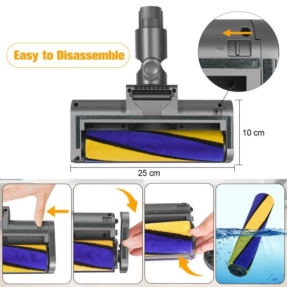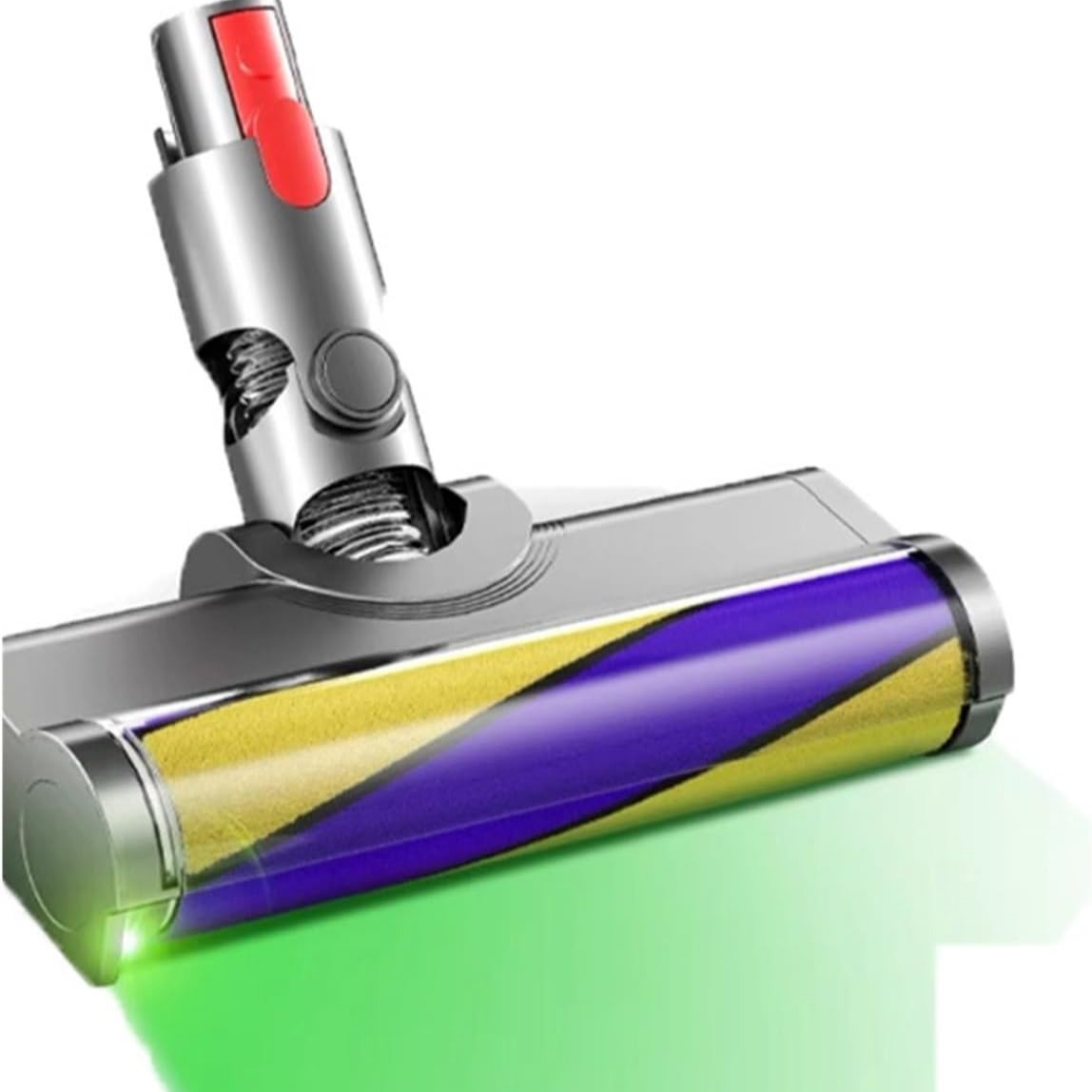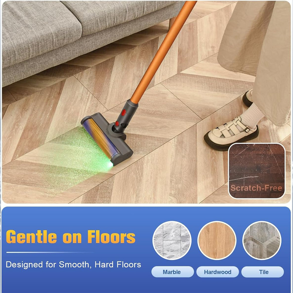 Electric Turbine Brush Head for Dyson V7 V8 V10 V11 V15 Replacement Part Floor ToolPerfect Compatibility: - Our laser brush head is engineered for seamless installation on a range of Dyson models, including the V7, V8, V10, V11, and V15 series, guaranteeing a perfect fit and easy setup. Please note: This product is not compatible with the V6, V12, Slim series, Ball series, or DC series.Exceptional Cleaning Performance: - This vacuum accessory features a unique green optical LED light that illuminates dust and debris on your floors, enabling a clearer view for a more thorough and efficient clean. Experience a new level of cleaning not typically achieved with original Dyson accessories. It serves as a high-quality alternative to the Dyson V15 laser brush head, promising an unparalleled cleaning experience.Powerful SuctionThe roller brush head is constructed from premium ABS material and soft nylon bristles, specifically designed for various hard floors such as hardwood, laminate, tile, and marble. Our vacuum accessory maximizes suction power to ensure a deep, effective clean.Please Note: Not suitable for carpet cleaning.Flexible Swivel Design: - Thanks to its flexible swivel joint, the turbine brush head pivots 90° vertically and 180° horizontally, allowing you to easily maneuver and clean under furniture and around hard-to-reach corners.Easy Maintenance: - Designed for hassle-free upkeep. The brush head allows for easy removal of tangled hair and debris, ensuring optimal performance and longevity.