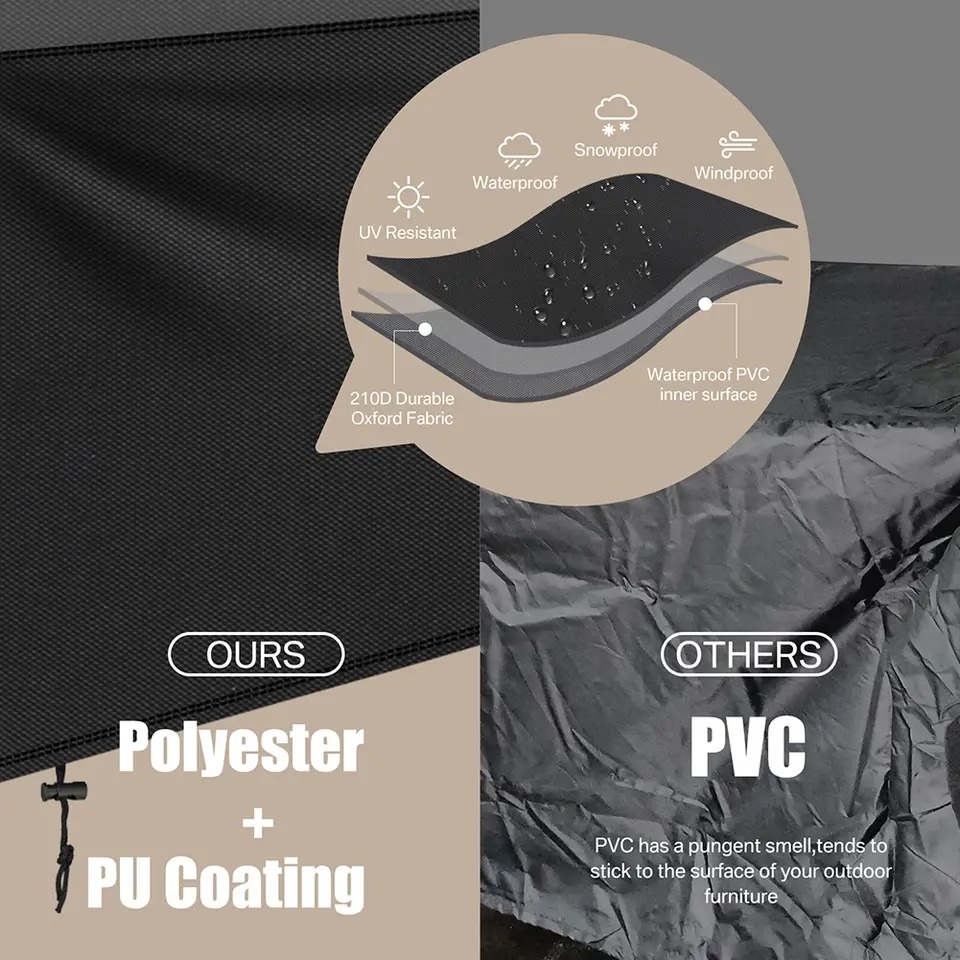 Garden Furniture Cover, Outdoor Table and Chair Protective Cover 【Size】210 x 140 x 80 cm [Color] Brown 【Adaptable Scenario】Suitable for all kinds of garden furniture, outdoor tables and chairs, providing all-round protection in all seasons 【Core Material】Made of high-grade 180 GSM 420D Oxford cloth, which is thicker and more durable than ordinary fabrics, with excellent weather and heat resistance【Core Functions】 Dust and snow proof: Effectively block dust and snow accumulation and protect furniture clean and dry Anti-tear: Adopt double-thread sewing technology, special waterproof glue treatment at the seams, the structure is stronger, not easy to tear Windproof Fixation: Snaps can be attached to furniture legs, drawstrings can be tightened, and with reusable Velcro straps on the sides, the elasticity can be adjusted to enhance wind protection and cope with bad weatherAll-season protection: Fully resist heavy rain, blizzards, dust, bird droppings, ultraviolet rays, etc., and prevent furniture from scratching, moisture, rust, rot and mold Ventilation design: Keep the inside of the furniture dry to avoid mildew 【Cleaning and Storage】 Easy to clean: Simply wipe the stain with a damp cloth or rinse thoroughly with a hose Storage: Easily folds to save storage space and access at any time