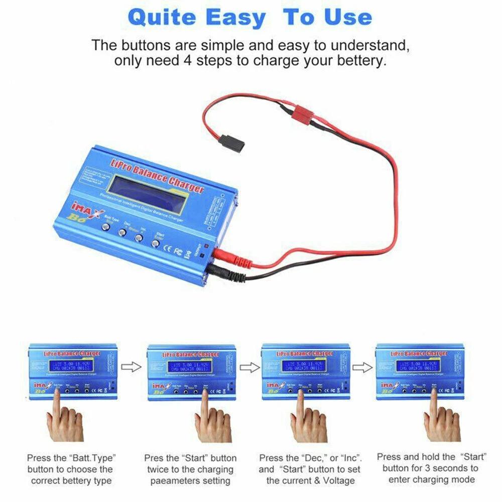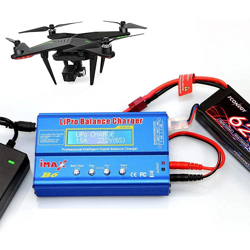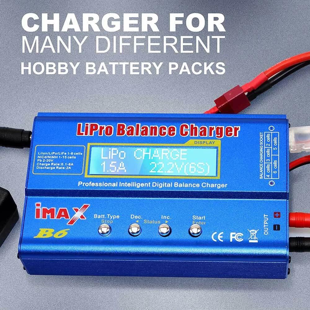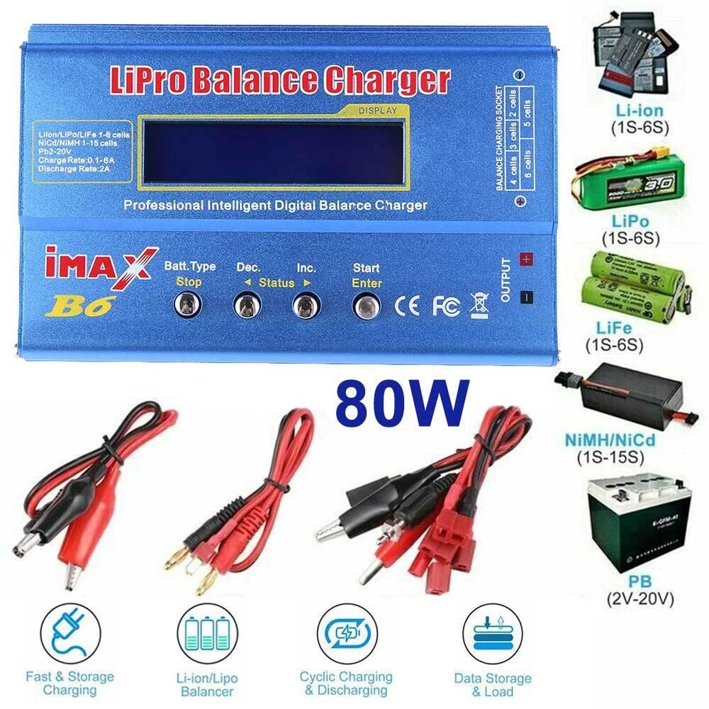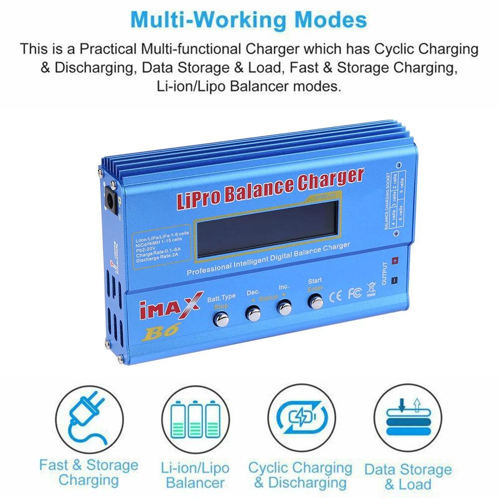 IMAX B6 LCD Screen Digital RC Lipo NiMh Battery Balance Charger Description: - The balance charger is suitable for parallel charging of Li-Po/Li-Ion/Li-Fe/NiMH/NiCd/Pb batteries. - The charger features input voltage monitoring to prevent battery overcharge. The operating voltage range is DC 10-20V. - The metal casing provides good heat dissipation, ensuring stable performance and reliable operation. The charging current range is 0.1-6.0A, and the discharging current range is 0.1-2.0A. - Supports the new generation of A123 system Li-Fe batteries. Supports 1-6 cells in series for Li-Ion/LiPo batteries and 1-15 cells in series for NiCd/NiMH batteries. - The charger is 100% brand new and of high quality, offering you a new and reliable charging experience. Specifications: - Operating Voltage Range: DC 10-20V / AC/DC Adapter (DC 10-20V / 6A) - Circuit Power: Maximum charging power 80W / Maximum discharging power 10W - Charging Current Range: 0.1-6.0A - Discharging Current Range: 0.1-2.0A - Balancing Current for Li - Po: 300mAh per cell - LiIon/LiPo/LiFe Battery Cells: 1-6 cells - NiCd/NiMH Battery Cells: 1-15 cells in series - Lead-Acid Battery Voltage: 2-20VPackage Includes: - 1 x Battery Balance Charger - 3 x Cable Sets
