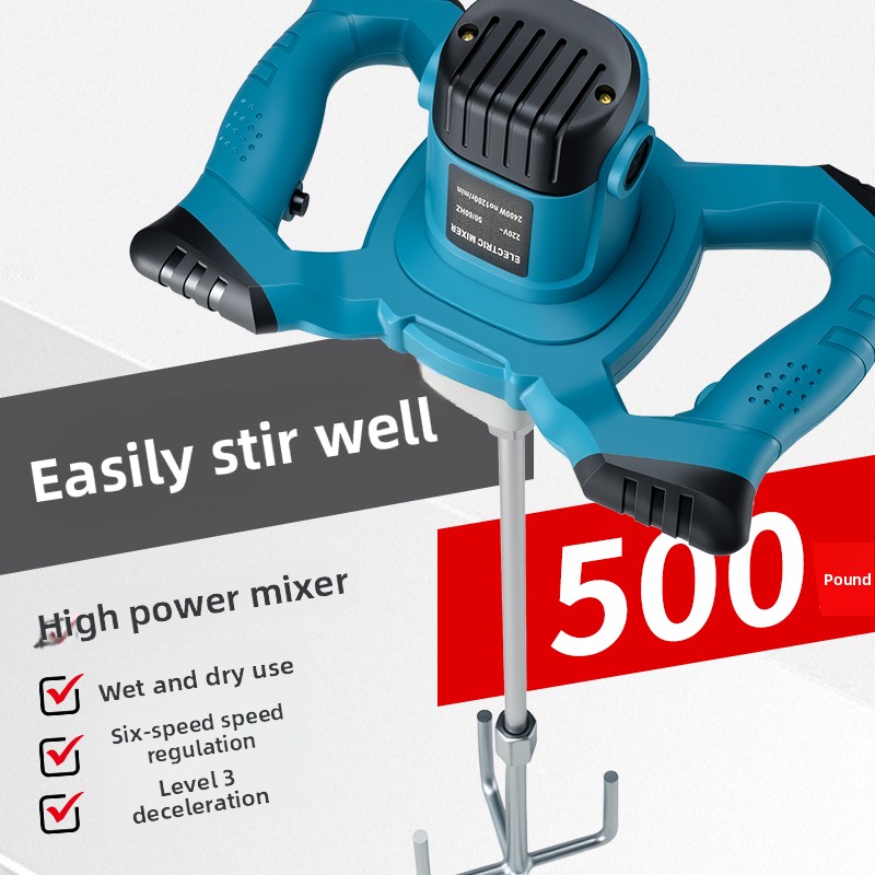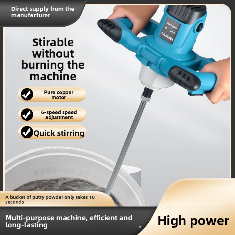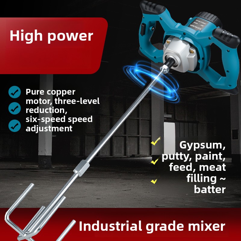 Industrial Grade Mixer with 6-Speed Adjustment**Product Description: **This industrial-grade mixer is an essential tool in construction work, suitable for mixing powdery building materials such as paint, mortar, epoxy resins, adhesives, plaster, and similar substances. Depending on the consistency and amount of material, the mixer can provide different mixing results. The device requires an electrical power supply and is designed with an ergonomic handle for safe and comfortable operation, and a convenient switch ensures the device can be quickly started.**Product Features: ** - Copper wire motor, even mixing, fast heat dissipation - Safe and durable, 6-speed control, easy operation - Rated Power: 1100W - No-load speed: 5800 RPM - 6-speed control to adapt to different mixing needs**Technical Specifications: ** - Rated Voltage: 220V - Weight: 3.5kg - Speed Control: 6 levels**Product Package: ** - 1 x Mixer - 1 x Galvanized Mixing Rod**Applicable Scenarios: ** - Paint mixing - Mortar mixing - Plaster mixing - Putty mixing - Cement mixing** Precautions: ** - Do not use in a damp environment - Disconnect power after use