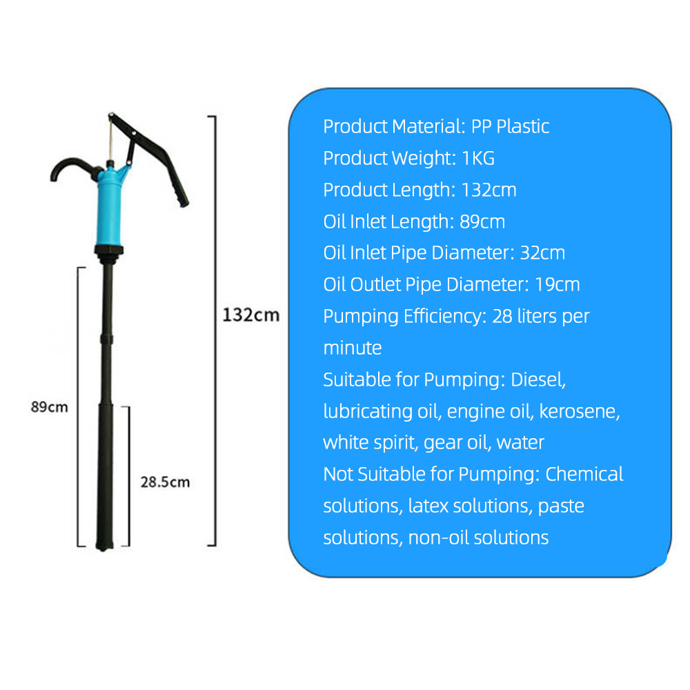 **Product Title: ** Manual Oil Pump**Product Features: ** - **Strong Sealing Performance: ** Easy to assemble, widely applicable for various liquids. - **Efficient Extraction: ** High extraction rate of 28 liters per minute. - **Suitable Liquids: ** Diesel, lubricating oil, engine oil, kerosion-resistant oil, white oil, gear oil, water, etc. - **Not Suitable for: ** Chemical solutions, latex solutions, ointment solutions, non-oil solutions, etc. - **Ergonomic Design: ** Easy-to-handle handle for improved comfort.**Product Specifications: ** - ** Material: ** PP plastic - ** Weight: ** 1KG - ** Length: ** 132cm - **Inlet Length: ** 89cm - **Inlet Pipe Diameter: ** 32mm - **Outlet Pipe Diameter: ** 19mm**Package Contents: ** - 1 x Manual Oil Pump - 1 x Handle - 3 x Threaded Pipes (Hose) - 1 x Funnel (Collection Container) - 2 x Hoses