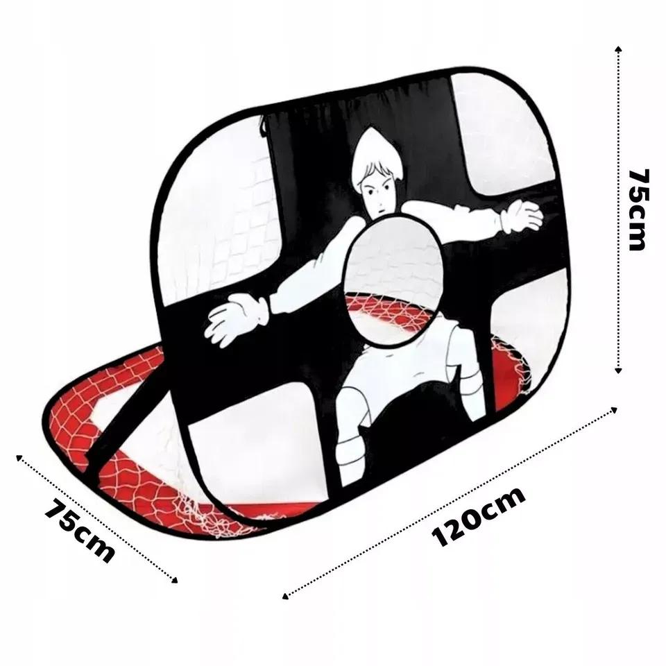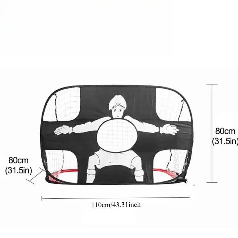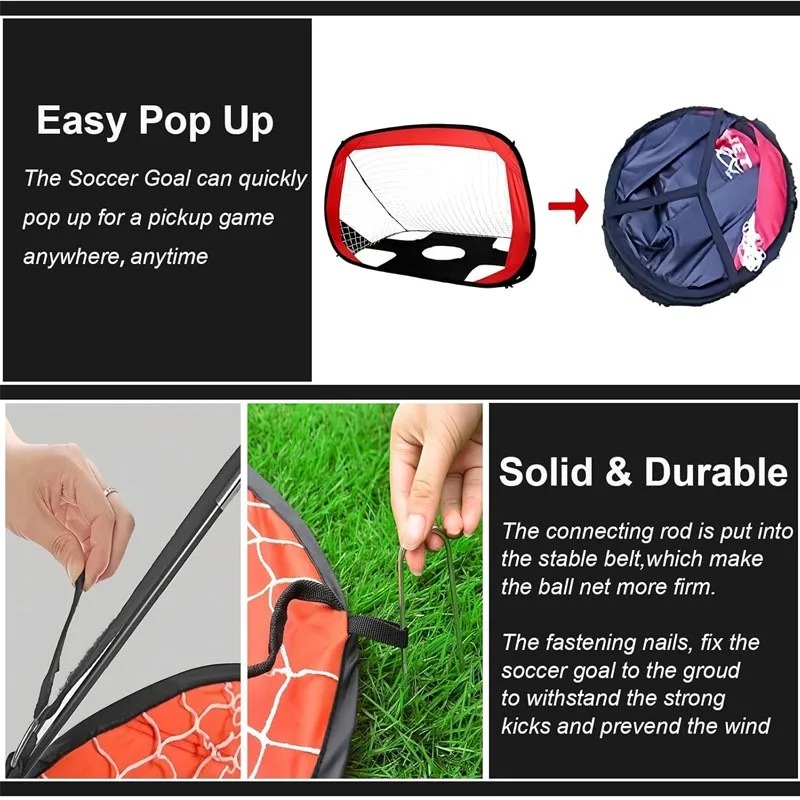 Pop-Up Foldable Football Goal – Nylon Mini Net30 seconds quick loading + wind resistance4 steel ground nails are firmly buckled to the ground, and the strong wind will not tip over, so you can kick with peace of mind in the outdoor special session.Pop-upThrow your hands automatically form, no need for intubation, and play with the court, corridor, and living room. Lightweight folding, take your bag and go Steel elastic wire + 210D Oxford cloth, only the size of an umbrella when folded, comes with a carrying bag, and can be stuffed in the trunk/subway/bicycle basket.ks.Product Specifications: Unfolded size: 110 × 80 × 80 cm (W×H×D) Material: 210D Oxford cloth, high elastic steel frame Color: Red / Blue Optional Suitable for: 18+ adults, indoor, backyard, park, beach, community Packing list Football.com × 1 Support rod × 2 Steel Ground Nails × 4 Storage tote bag × 1l × 1