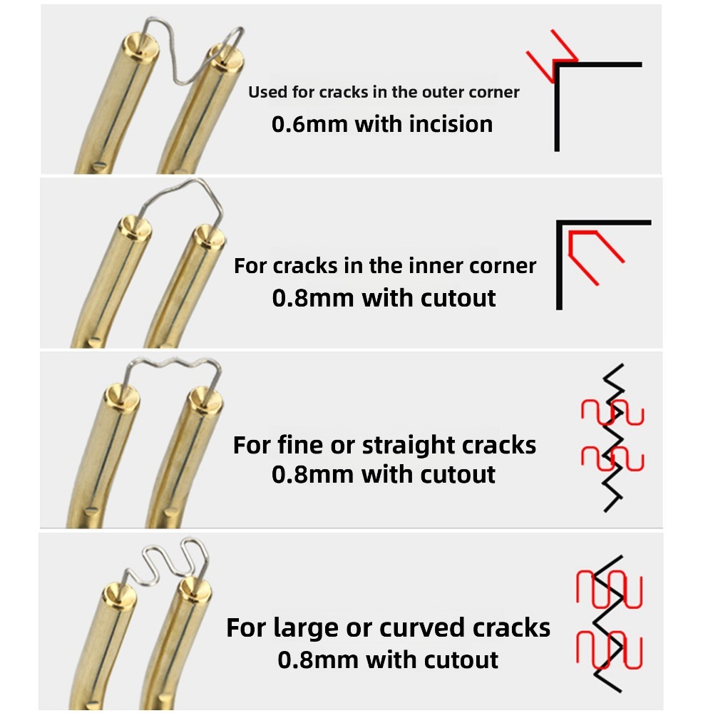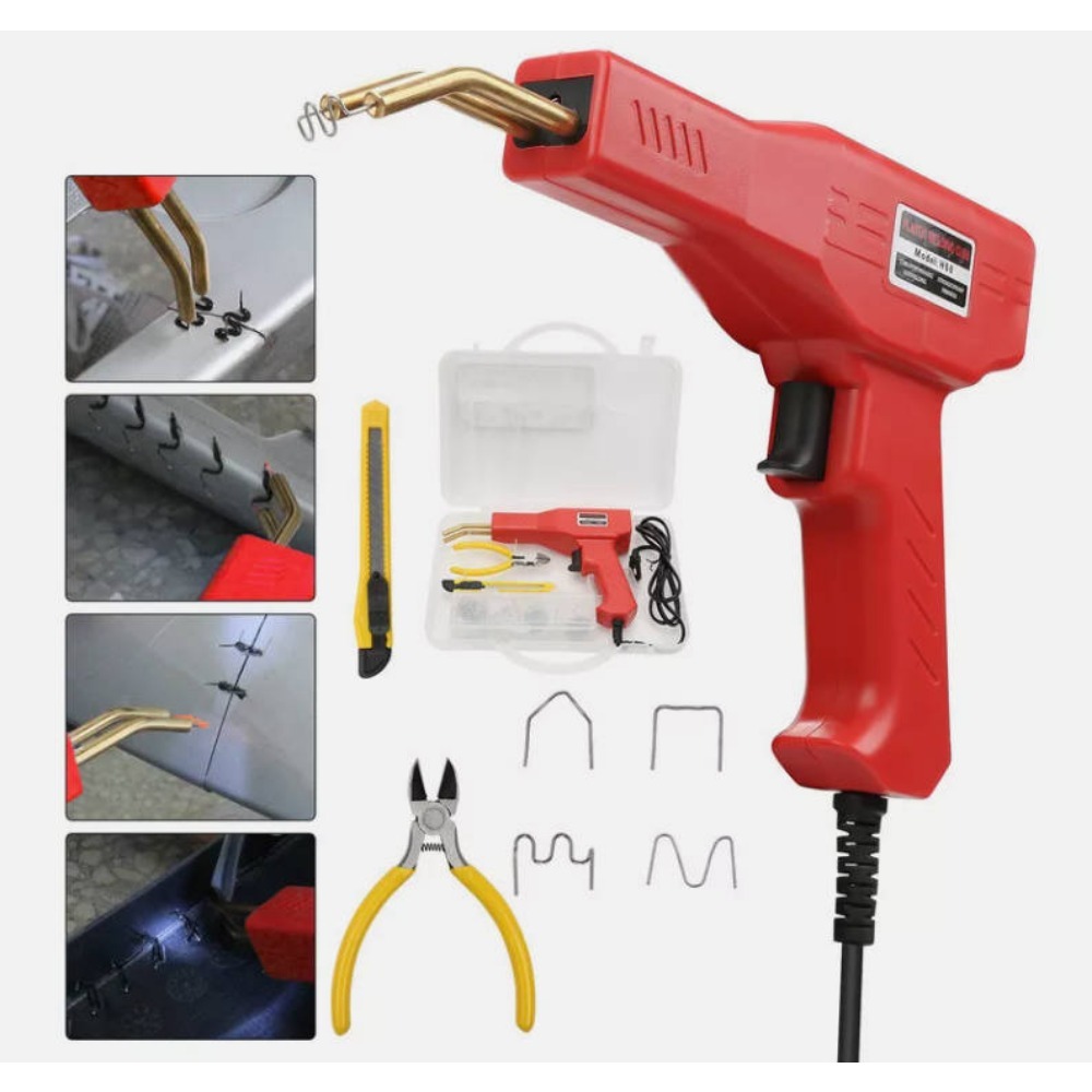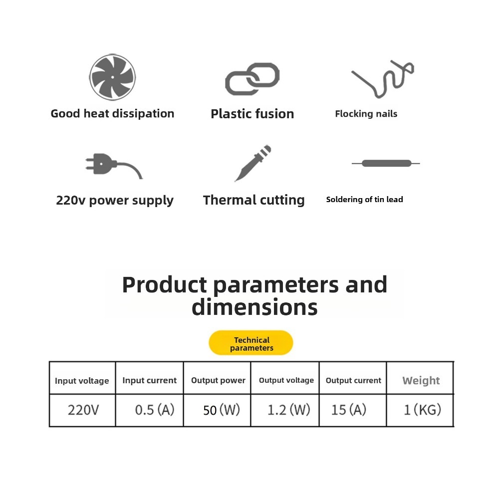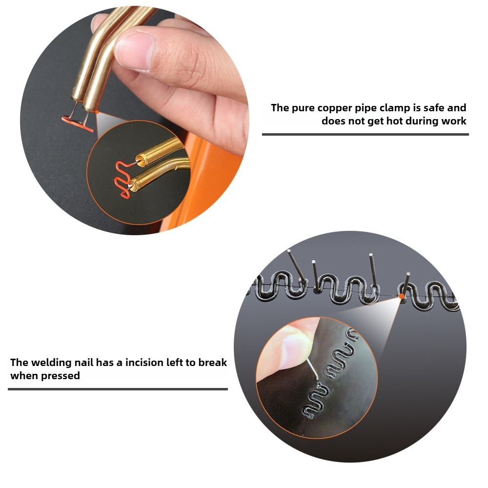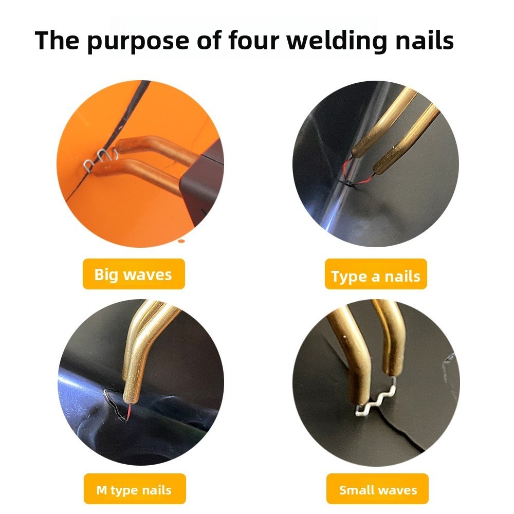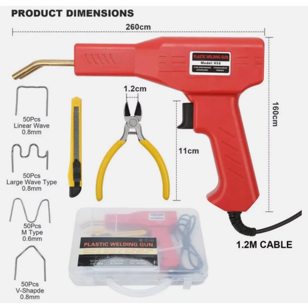 **Product Specifications and Dimensions** - Input Voltage: 220V - Input Current: 0.5(A) - Output Power: 50(W) - Output Voltage: 1.2(W) - Output Current: 15(A) - Weight: 1(KG)**Included Accessories** - Main Unit *1 - Utility Knife *1 - Pliers *1 - Large Wave Nails *50 - Small Wave Nails *50 - A-Type Nails *50 - M-Type Nails *50**Product Features**1. Plastic welding (nail-free), filling welding, hole repair, and gap elimination.2. Nail planting: With various repair nails, horizontal, vertical, long, and short cracks can be repaired.3. Heat ironing: Plastic heaters are smoothed, welded, doubled in strength, and beautifully supplemented.4. Thermal cutting: Can be used for hot cutting plastic ropes, flax cutting, and automatic sealing.5. Tin welding: Heating/cooling is faster, more efficient, and more energy-efficient than traditional welding machines.**Product Specifications** - Plug Type: EU - Input Voltage: AC 220V 50/60 Hz - Input Current: 0.5A - Output Current: 0-15A - Rated Power: 50W - Overheat Protection - Machine Size: approx. 260 * 160 * 45mm / 10.2 * 6.28 * 1.76 inches - Power Cord Length: approx. 1.2m