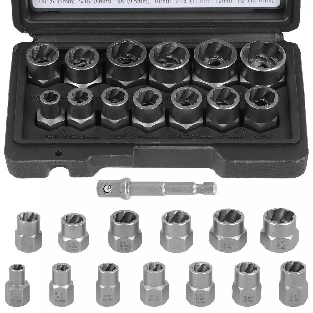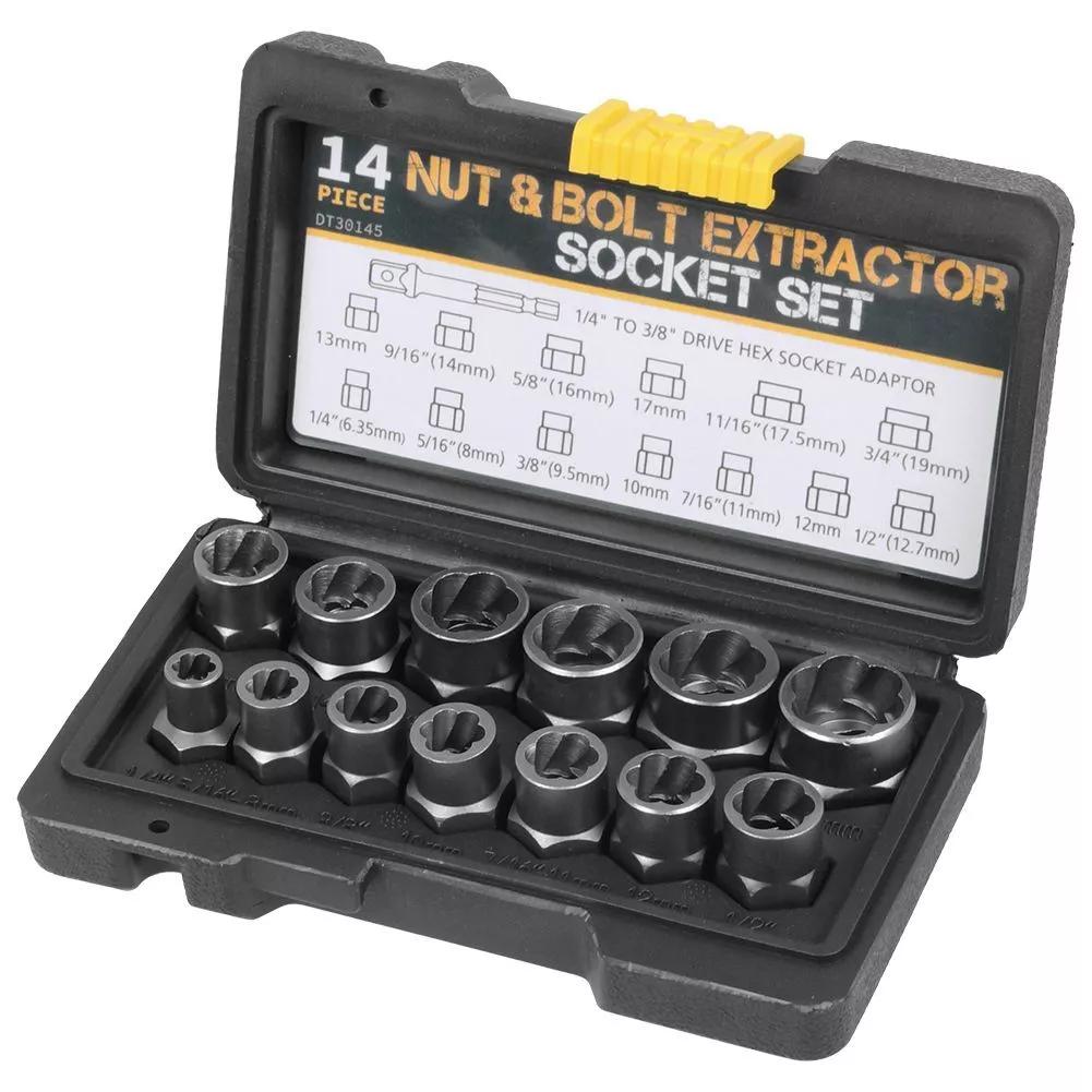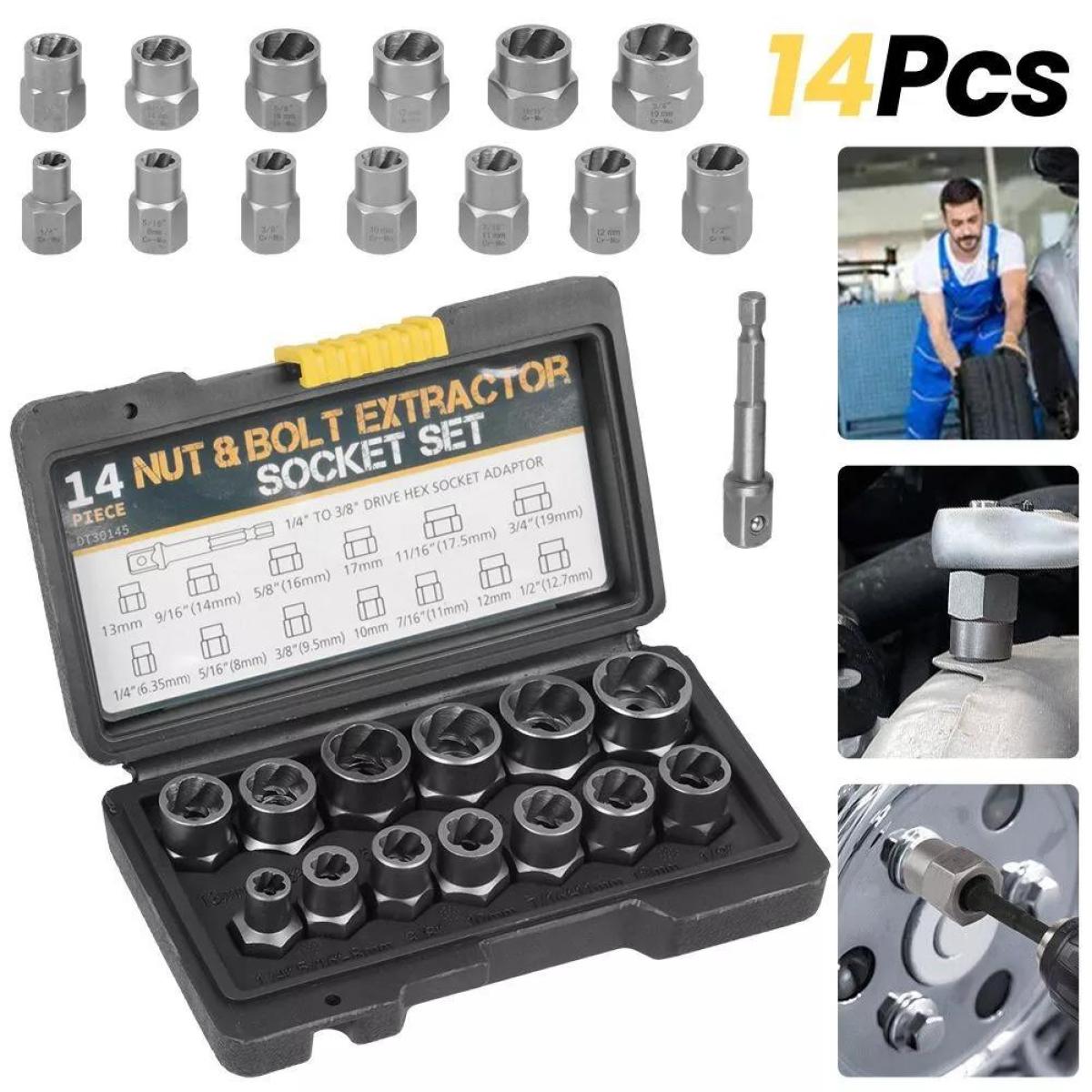 High-Strength Lug Nut Remover Socket Set14pc 3/8 Inch Socket Set Damaged Impact Socket Tool Set Socket Set Nut And Bolt Extractor Impact Bolt & Nut Remover with CaseProduct Description【High-Quality Material】Made of hardened Cr-Mo steel for exceptional durability and wear resistance.【Versatile Kit】14-piece bolt extractor set compatible with 3/8" square drive, ratchets, or breaker bars, designed to remove damaged, frozen, rusted, or rounded bolts, nuts, and screws.【Broad Compatibility】Standard 3/8" drive with 1/4" hex-to-3/8" drive adapter, works with handheld or heavy-duty power tools and drivers.【Spiral Hex Design】6-point spiral flute design ensures secure grip on rounded fasteners, preventing slippage.【Applications】 Fits hex heads in sizes: 6.35mm(1/4"), 8mm(5/16"), 9.5mm(3/8"), 10mm, 11mm(7/16"), 12mm, 12.7mm(1/2"), 13mm, 14mm(9/16"), 16mm(5/8"), 17mm, 17.5mm(11/16"), 19mm(3/4"), ideal for replacing rusted, rounded, or loose lug nuts and screws.Specifications Material: Chrome Molybdenum Steel Color: BlackFit Head Sizes: 6.35mm(1/4"), 8mm(5/16"), 9.5mm(3/8"), 10mm, 11mm(7/16"), 12mm, 12.7mm(1/2"), 13mm, 14mm(9/16"), 16mm(5/8"), 17mm, 17.5mm(11/16"), 19mm(3/4")Package Contents13 x Nut/Bolt Extractors1 x Socket Adapter Bar