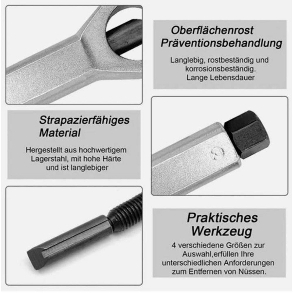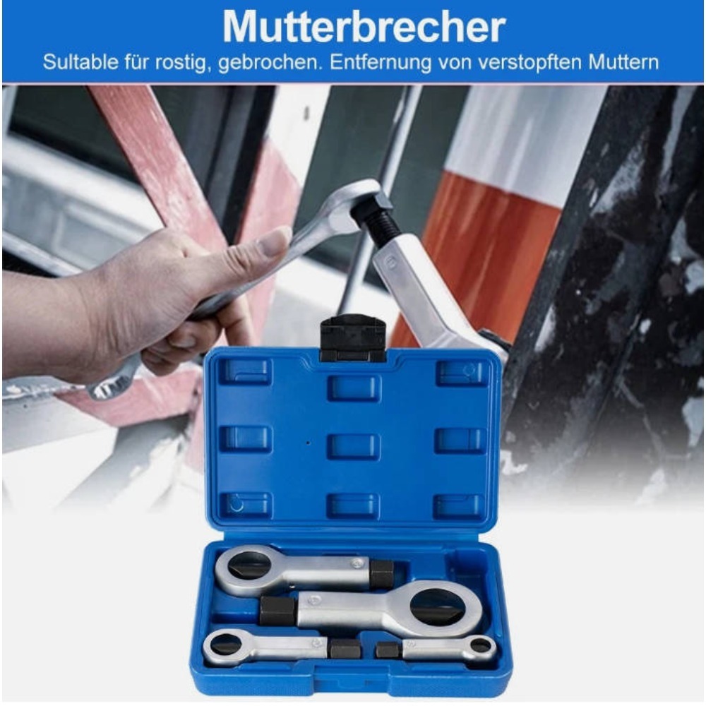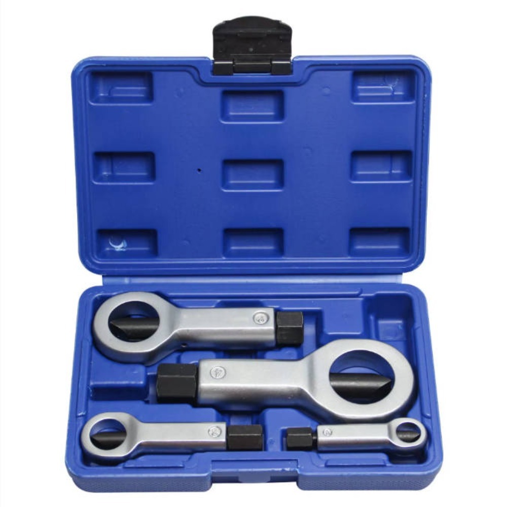 ## Product NameMulti-functional Nut Splitter Set ## Usage ScenarioSuitable for nut removal in home, workshop, DIY enthusiasts, and maintenance work, especially for dealing with rusted, damaged, or stuck nuts. ## Product Description - **Practical Tool**: The nut splitter set helps you safely and easily remove damaged, corroded, and stuck nuts. It's an ideal tool for home, workshop, DIY enthusiasts, and maintenance work. - **Easy to Operate**: The set includes 4 different sizes (9-12mm, 12-16mm, 16-22mm, 22-27mm), simply rotate the nut splitting screw to process the target nut, easy to operate and save time. - **High Quality**: The sturdy metal splitter is made of high-quality storage steel, polished surface, high hardness, rust-resistant and durable. - **Portability**: The 4-piece nut remover set comes with a storage box for easy storage and carrying, easily fits in your car trunk and is convenient to transport to different work sites. ## Product Specifications - **Material**: Storage Steel - **Color**: Silver - **Sizes**: 9-12mm; 12-16mm; 16-22mm; 22-27mm - **Weight**: - 80mm (9-12mm): 95g - 102mm (12-16mm): 173g - 130mm (16-22mm): 437g - 150mm (22-27mm): 658g - **Bolt Diameter**: - 80mm (9-12mm): 12mm - 102mm (12-16mm): 14mm - 130mm (16-22mm): 18mm - 150mm (22-27mm): 21mm ## Included Content - 4-piece nut splitter set - 1 storage box