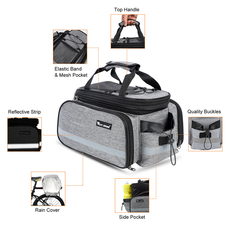 WEST BIKING Bicycle Bags Large Capacity Cycling Pannier MTB Bike Saddle Handbag Storage Luggage Carrier Bag Rear Rack Trunk Bags Product Name : Fahrradtaschen Color : Gray Size : Free SizeProduct Features : Waterproof Material : Made of splash - proof material and equipped with a zipper, so you don't need to worry about sudden rainy weather and humid conditions. Large Capacity : This Fahrradtaschen offers ample space to accommodate plenty of items for long - distance cycling. Superb Characteristics : The packaging has excellent properties. It can be used for a long time without deformation, is durable, reduces wear and tear, and extends service life. The design is practical, the operation is simple, and it has a large storage capacity. Quick Installation and Release via Velcro : The Cycle Bag Phone Holder is specially designed for easy installation on bicycles and adjustable at any angle. It suits most bicycle types, such as road bikes and mountain bikes! Wide Application Range : Suitable for all kinds of bicycles, including mountain bikes, road bikes, children's bicycles, city bikes, etc.