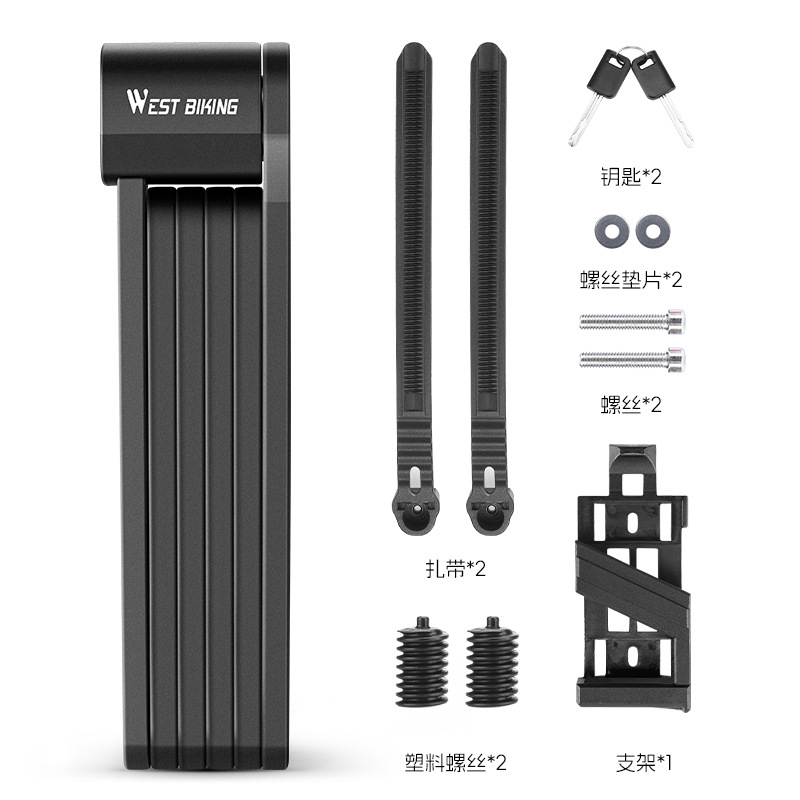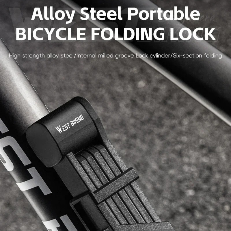 - Product Name: WEST BIKING Bicycle Folding Lock 2 Keys 87cm High Security Alloy Steel Lock For MTB Road Bike E-Bike Anti-Theft Foldable Lock Brand: WEST BIKING Material: - Lock Body: Alloy Steel - Lock Cylinder: Brass - Surface Treatment: Stainless Steel - Other: Zinc Alloy, ABS Plastic, PA6 PlasticProduct Specifications: - Lock Body Length: About 87cm - Lock Weight: About 570g - Lock Cylinder Type: Internal Milling Slot Lock Cylinder - Chain Piece Number: 6 pieces Color: Black Application: Bicycle, Motorcycle, Electric Bicycle, etc. Features: - Foldable design for easy portability - Miniature and lightweight for daily use - Durable construction with long-lasting performance - High security and anti-theft protection - Suitable for use on rainy days