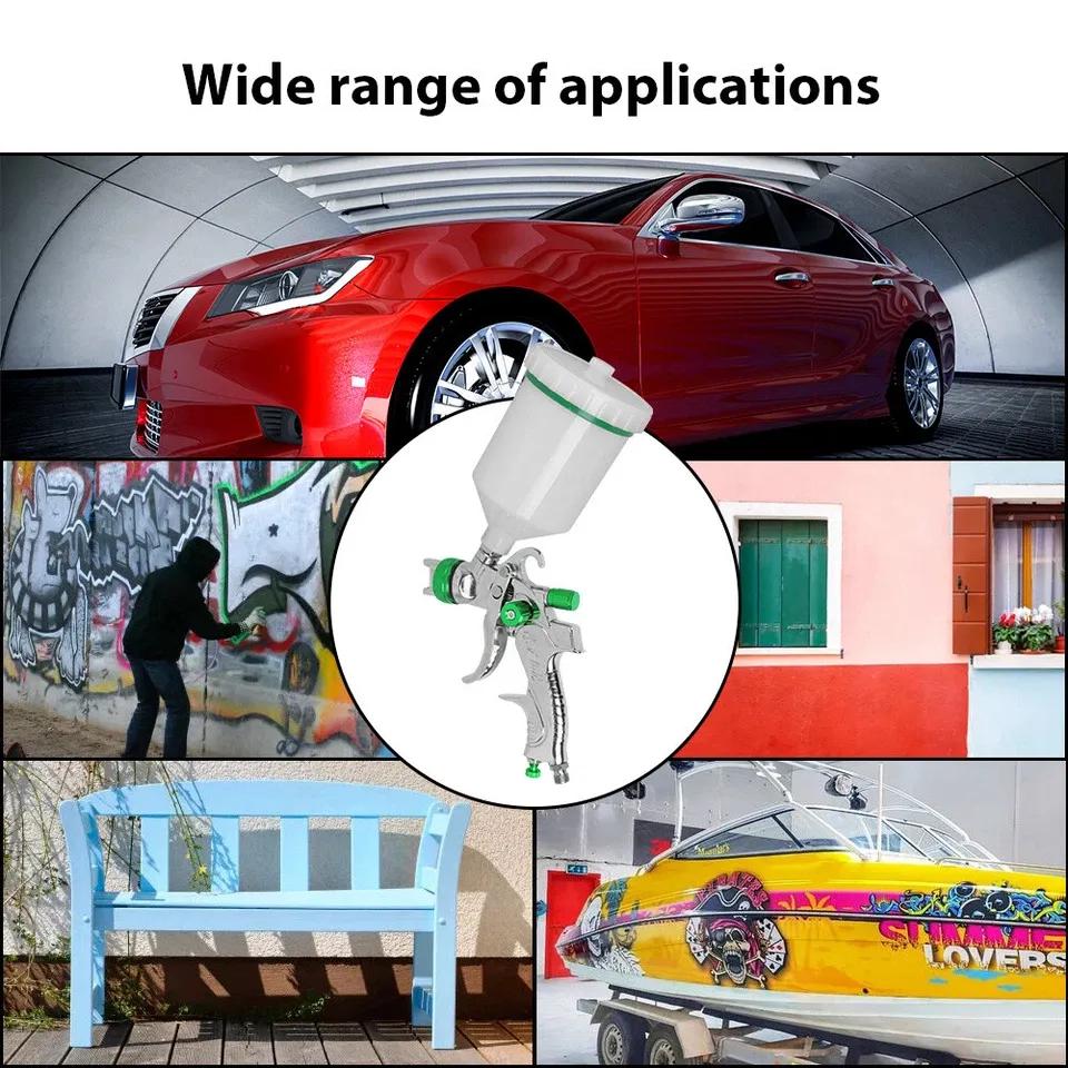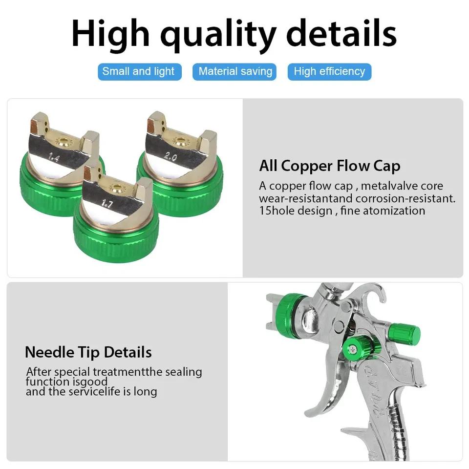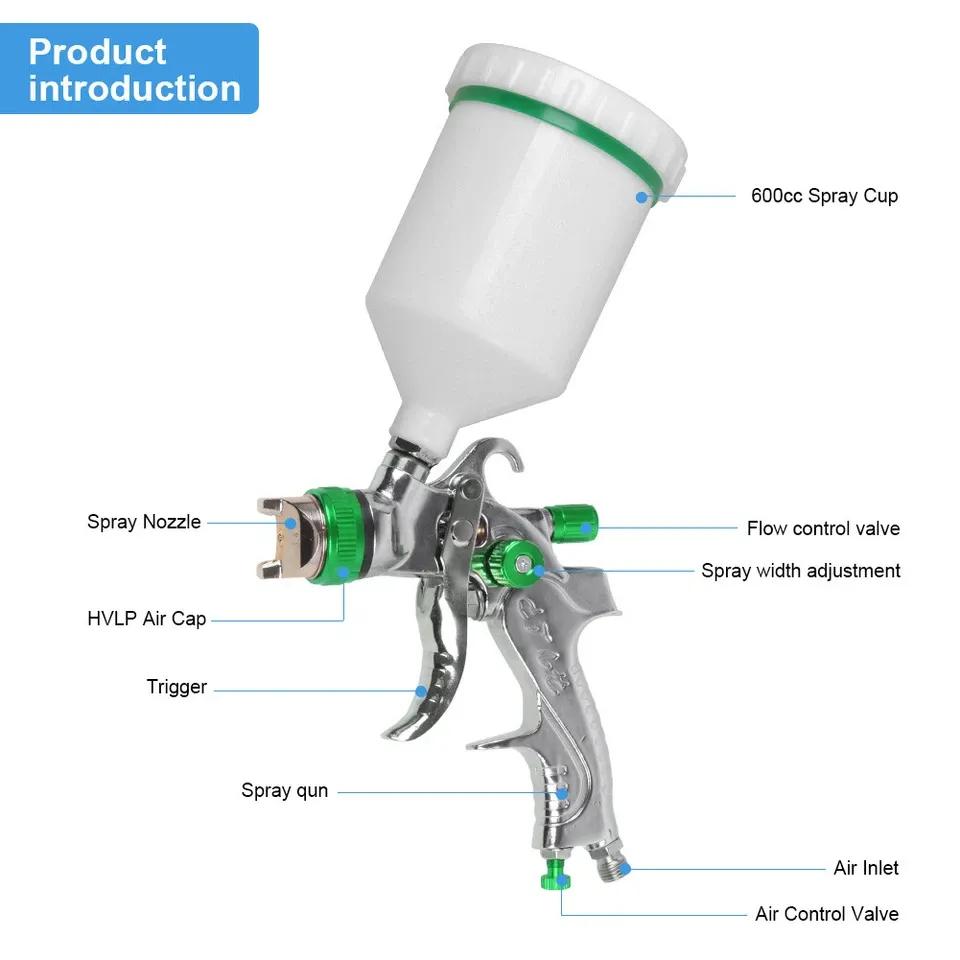 Product Name: HVLP Spray Gun, Automotive Spray Gun, 3 Nozzles, Stainless Steel, 600mlProduct Description: 1. Good Atomization Effect – The atomization cap can improve paint efficiency and provide uniform and fine coating, meeting your basic needs.2. High Quality – The spray gun features a high-quality stainless steel nozzle for long service life, wear resistance, and durability.3. Wide Application – The gravity-fed spray gun is suitable for painting cars, furniture, toys, instruments, and more.4. Easy to Use – The pneumatic spray gun comes with a wrench and cleaning brush for easy operation and cleaning.5. Large Capacity – The pneumatic spray gun has a 600-ml cup with a large capacity and uses the gravity feed method, which is easy to operate. Specifications: · Model:600CC HVLP Spray Gun Set· Fluid Nozzle Size:1.4mm, 1.7mm, 2.0mm· Air Inlet:1/4" NPS(M)· Cup Capacity:600CC· Material of Spray Gun:Aluminum Alloy + Copper· Cup Material:PVC· Operating Pressure:2-3.5 bar· Type:High Volume Low Pressure Spray Gun· Air Consumption:14.5 CFM· Funnel Size:10cm· Nozzle Diameter Features:Multiple spray settings· Cup Capacity:600CC· Color:White + Silver· Spraying Distance:180-230mm · Best Spraying Distance:200mm / 7.87 inches · Spray Width:200-250mmPackage Contents: · 1 x Spray Gun· 1 x 600cc Cup· 1 x Filter· 3 x Nozzles· 3 x Needles· 1 x Nozzle Cap· 1 x Wrench· 1 x Cleaning Brush· 1 x Instruction Manual