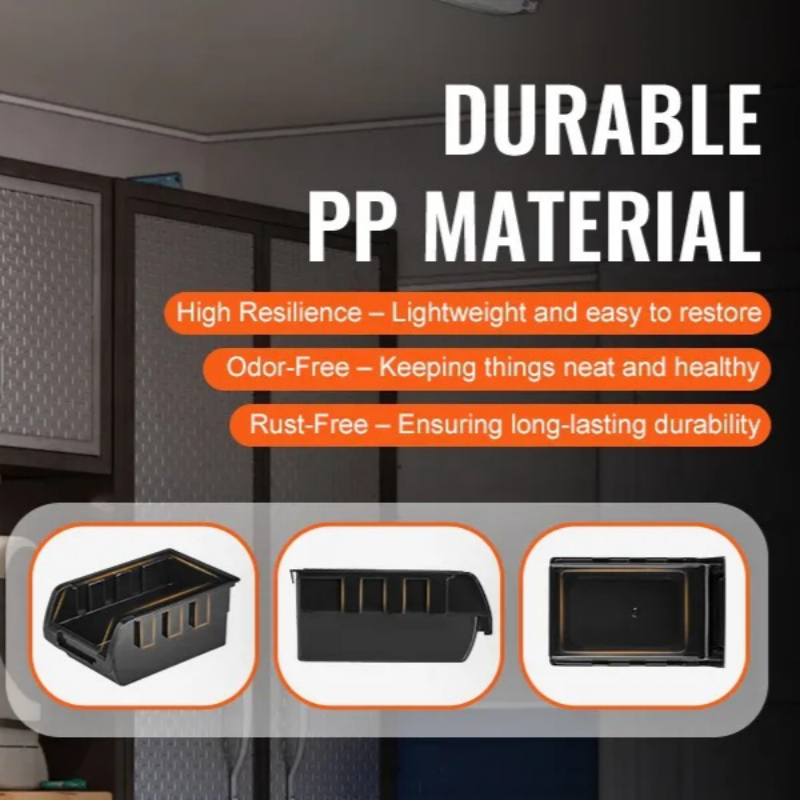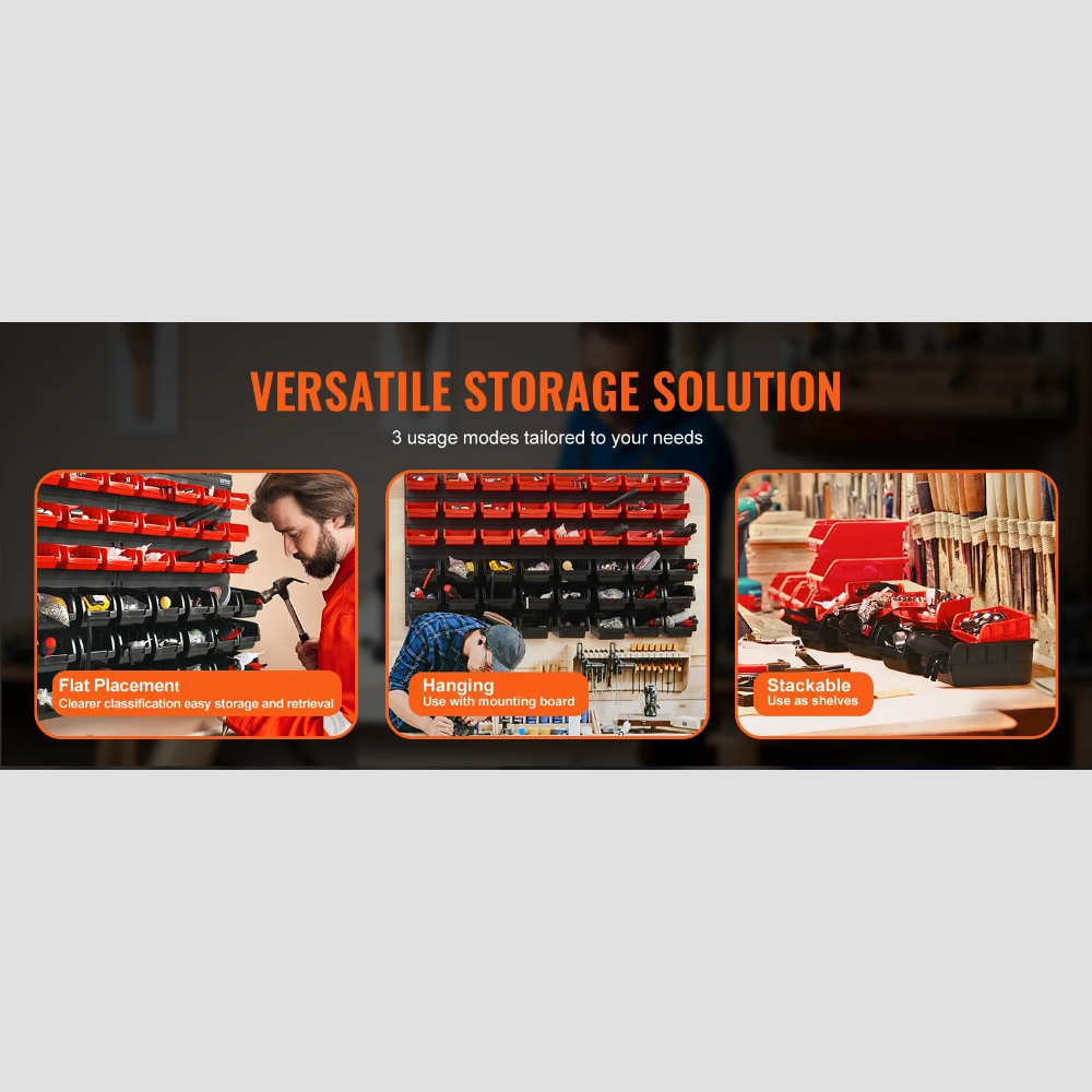Product Overview: Product Name: Tacking Boxes, 48 Container Divider Shelf Organizer for Garage, Plastic Loading Tool with Wall Panels, Tool Organizer for Nuts, Bolts, Screws, Nails, Beads, Buttons, Black and Red Item Model Number: 12119B Expandable Configuration: Wall-Mount Quantity: 48 Color: Black/Red (24 Bins Each Color) Material: PP Plastic Product Weight: 8.60 lbs/3.9 kg Product Size: 37.40 x 21.34 x 6.77 in / 950 x 542 x 172 mm Features: STACK, SAVE SPACE Our stackable storage bins are designed to save space and are extremely flexible. They are like building blocks for your clutter and allow you to combine them to your heart's content in cabinets, on desks, or in storage rooms. Sturdy and Handy Made of durable PP material, these storage containers with a clever column design are not only stackable, but can also be hung around. With spacious inner dimensions, they are perfect for offices, kitchens, and children's rooms. TWO CONFIGURATIONS The plastic storage bins come with a special wall panel so no self-customization is required. It offers a complete solution that caters to different individual needs and adds vibrancy and joy to the storage rooms. Accessories Galore for Easy Organisation We are at your side when it comes to keeping things tidy. Our stackable plastic storage bins are equipped with small and large containers in different colors to make cleanup a breeze. It is elegant, practical, and comfortable at its finest! VERSATILE USE These parts storage boxes are the most versatile storage masters. Arrange them anywhere you need instant organization. Craft rooms, laundry rooms, bedrooms, bathrooms, kitchens, offices, garages, playrooms, or playrooms—they are here to save the day with sturdy and durable storage solutions!
