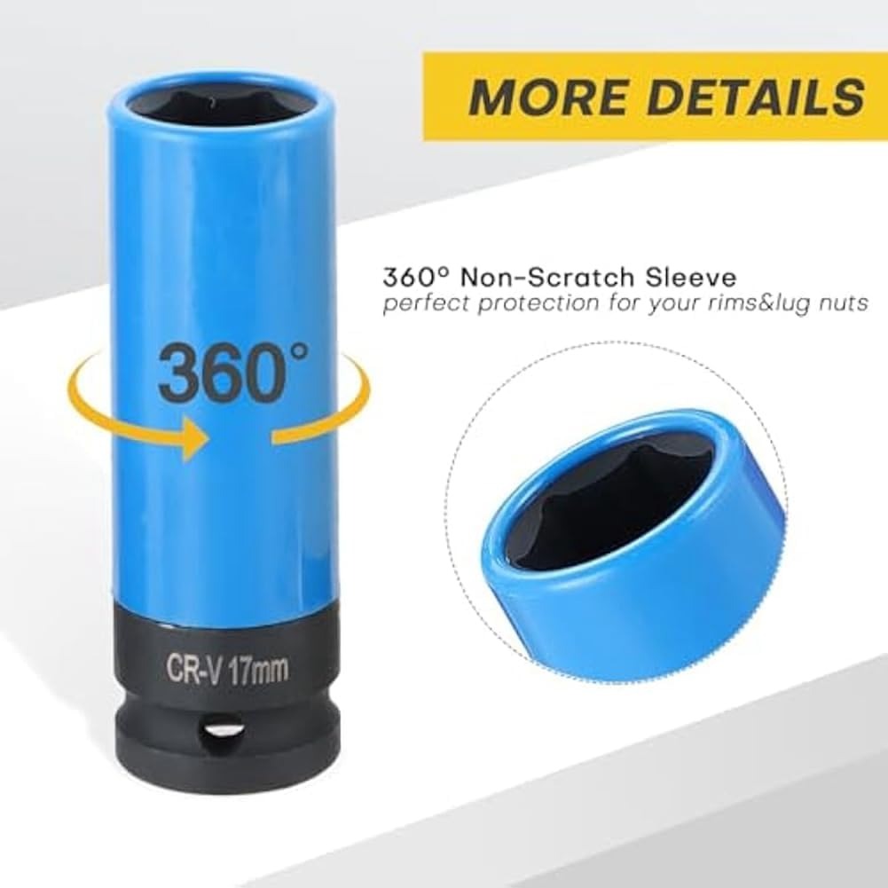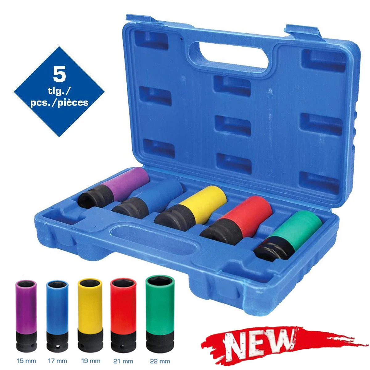 Simpls Wheel Hub Protection Cap Set for Impact Resistant Sockets 1/2 Drive Wheel Bolt Bushing Set with Colour Coded Protective Cases (15/17/19/21/22 mm)Product Features: Wheel Protection Guaranteed: Our thin wall lug nut socket set features a rotating protective nylon sleeve that protects against scratches on your valuable alloy wheels when removing the tire bolts.Designed for Durability: Our 5 piece wheel nut socket set is made of high quality materials, ensuring excellent strength and wear resistance for sustained performance.Wide Application: Our lug nut socket set with 15mm, 17mm, 19mm, 21mm and 22mm socket bits is designed for effortless removal of lug nuts from a variety of vehicle makes and models. Simply insert the socket set into the 1/2 drive end opposite the size you need, and then attach it to your impact wrench to remove the lug nuts quickly and efficiently.Secure and Flawless Fit: Each impact nut socket has a 6-flank drive system that prevents rounding of the fastener by applying force to the flat sides, ensuring a firm and secure fit.Comfortable Color Coding: With our color coded plastic sleeves on each lug nut socket, you can easily find the right size. With metric sizes from 15mm to 22mm, this kit covers most car bolt requirements.Included Products: 1 set of Simpls Wheel Hub Protection Cap Set (15/17/19/21/22 mm)
