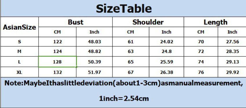 1. Asian sizes are 1 to 2 sizes smaller than European and American people. Choose the larger size if your size between two sizes. Please allow 2-3cm differences due to manual measurement. 2. Please check the size chart carefully before you buy the item, if you don't know how to choose size, please contact our customer service. 3.As you know, the different computers display colors differently, the color of the actual item may vary slightly from the following images.
