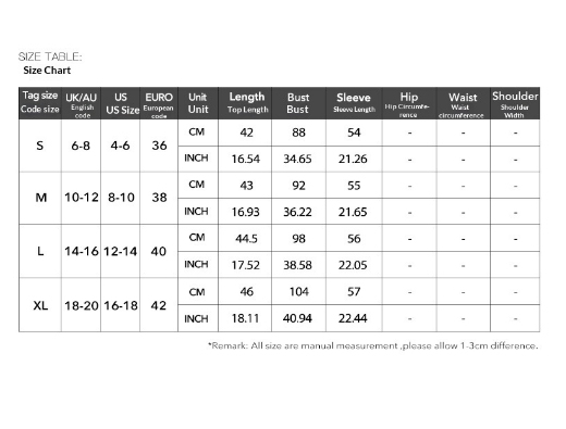 1. Asian sizes are 1 to 2 sizes smaller than European and American people. Choose the larger size if your size between two sizes. Please allow 2-3cm differences due to manual measurement. 2. Please check the size chart carefully before you buy the item, if you don't know how to choose size, please contact our customer service. 3.As you know, the different computers display colors differently, the color of the actual item may vary slightly from the following images.