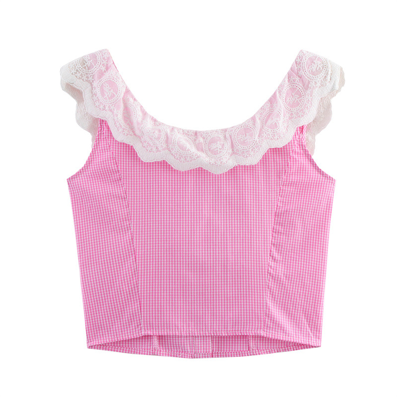 Sweet Style Sleeveless Vest Strap American Style Lace Plaid Strap Top