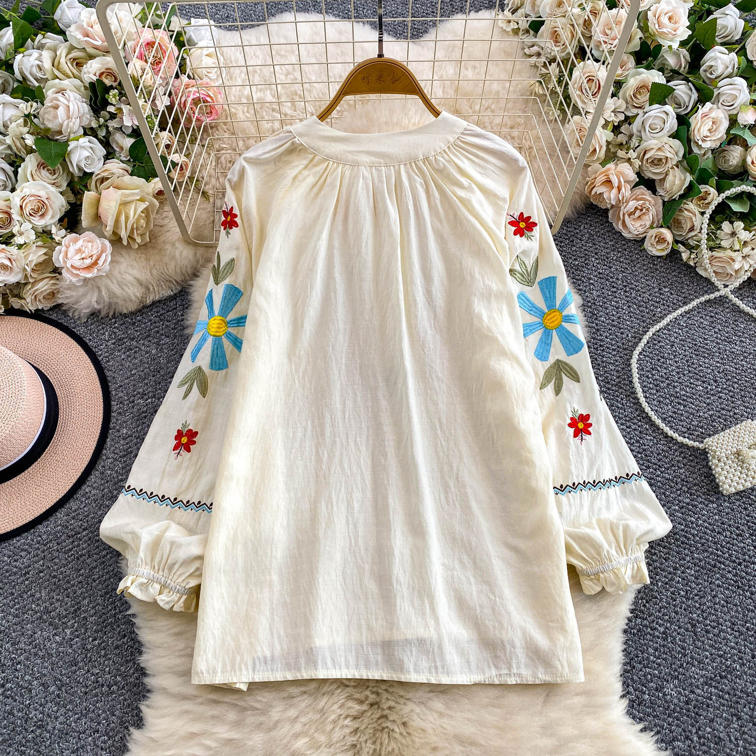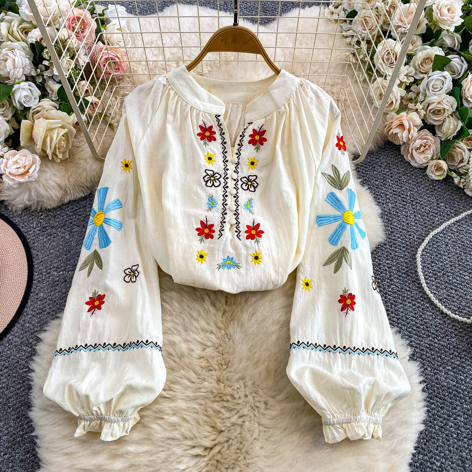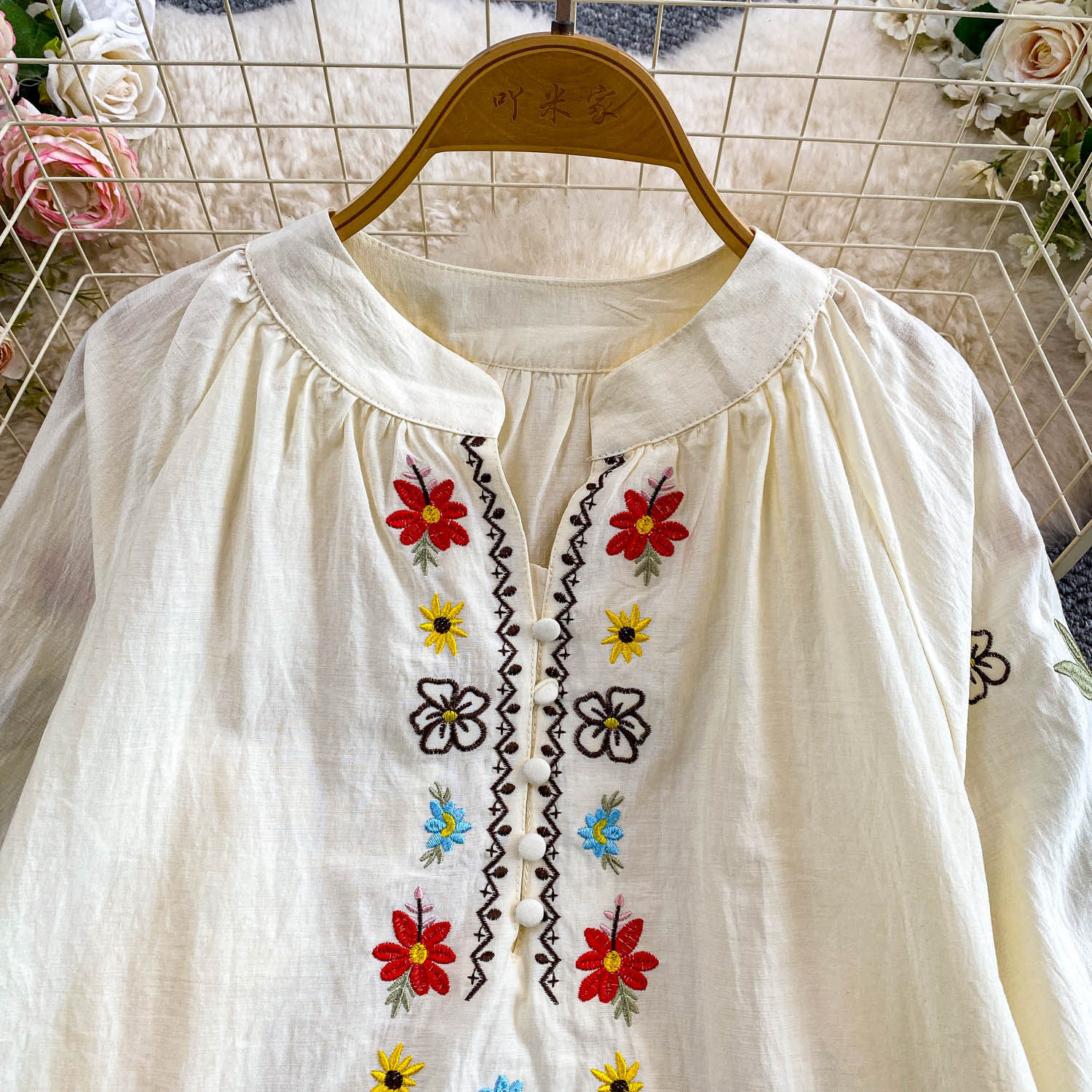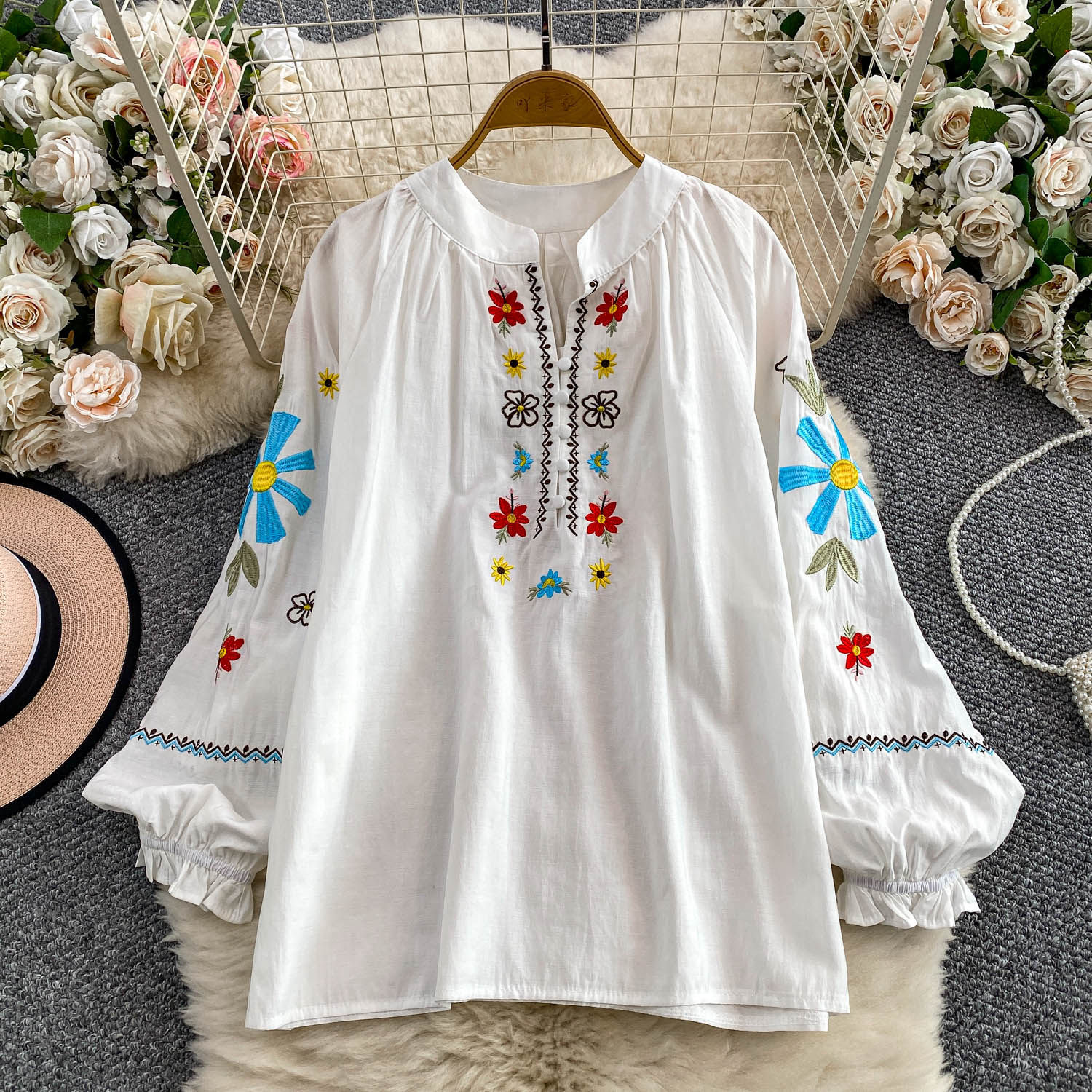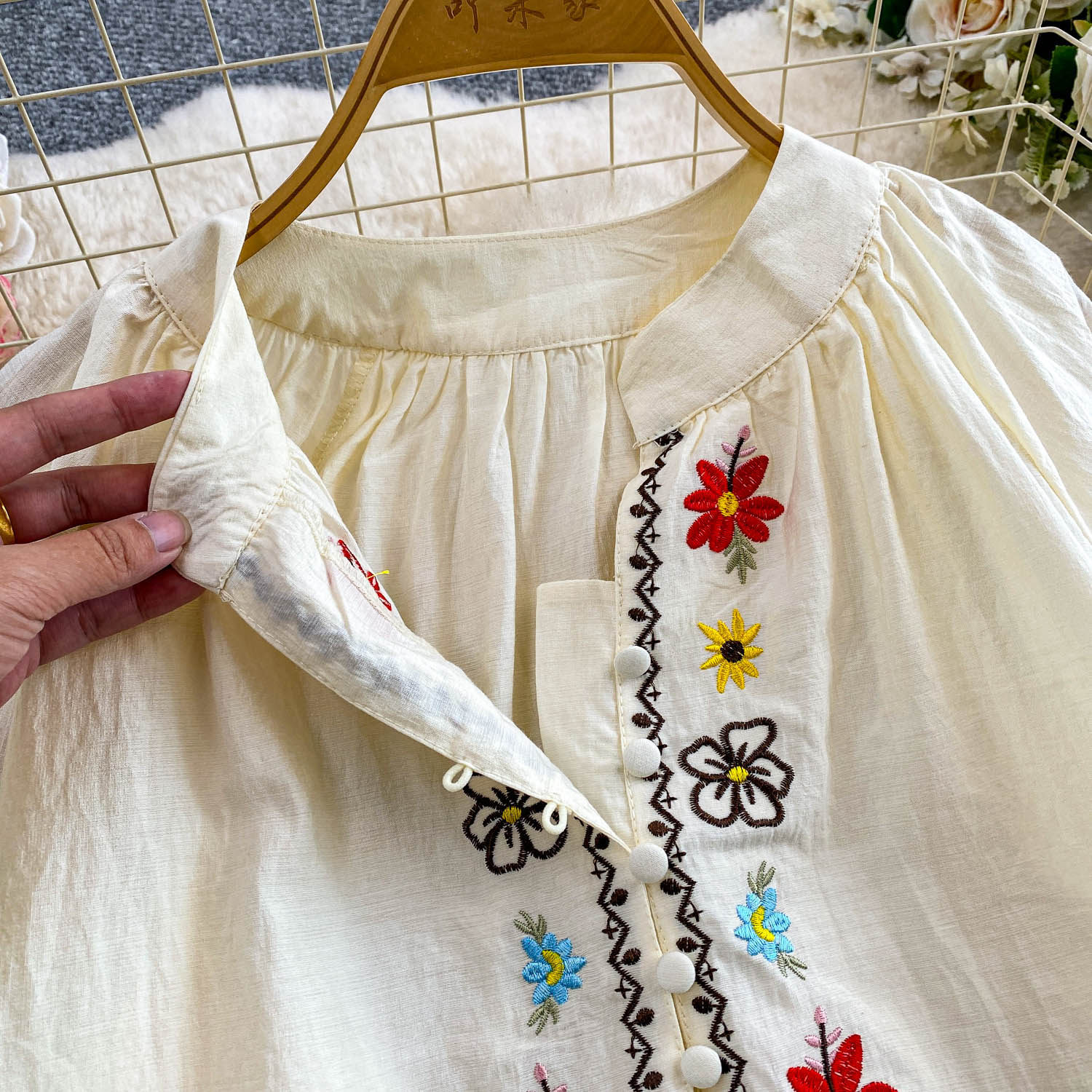 Sweet, Youth-Enhancing Floral Embroidery Stand Collar Puff Sleeve Shirt